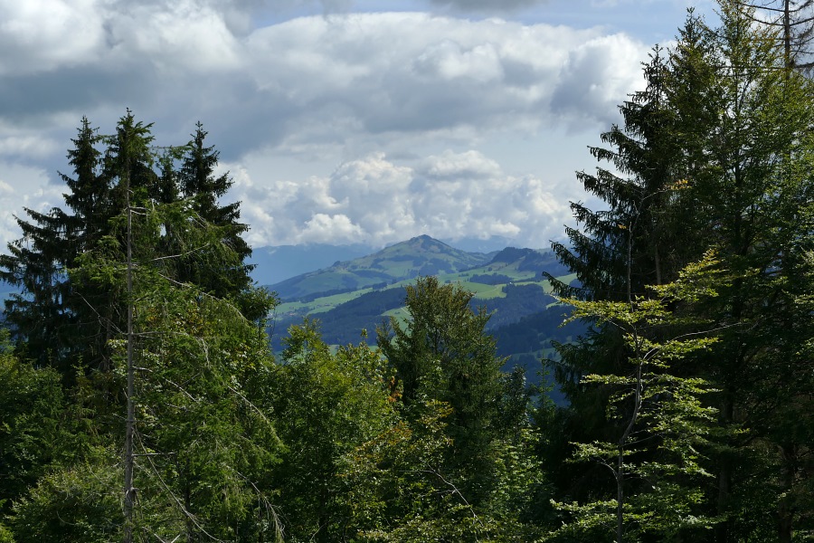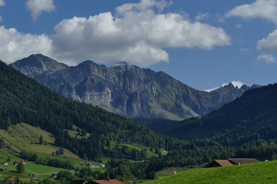 Blick nach Westen mit den typischen Bergspitzen der beiden Mythen-Gipfel