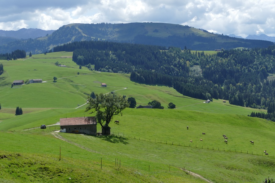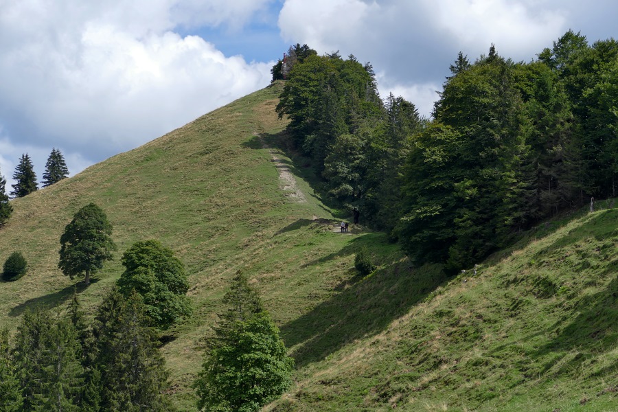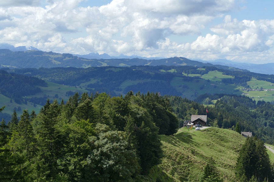 Vom Gipfel des Hochhamms ist bereits der nächste (Einkehr-)Stopp zu sehen: das Bergrestaurant Hochhamm