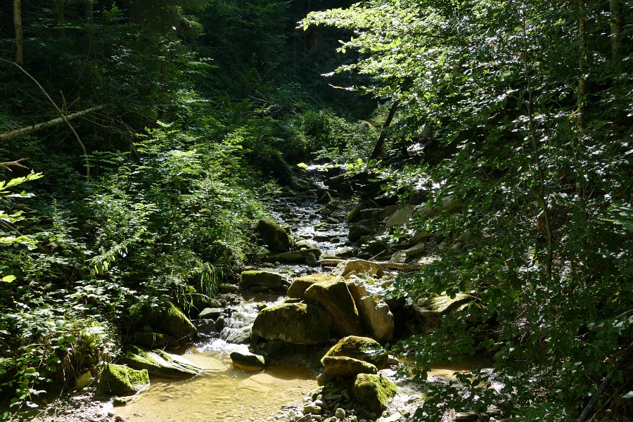 Über Stock und Stein geht die Reise weglos weiter - zum Glück sind die meisten Wiesen, die ich queren muss, abgegrast. Endlich erreiche ich den Murbach, den ich überquere und stoße bei Windegg endlich wieder auf den offiziellen Wanderweg.