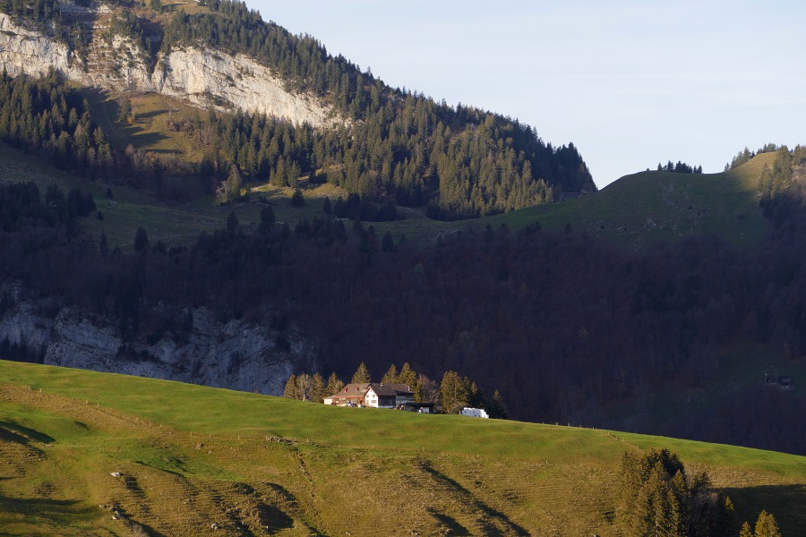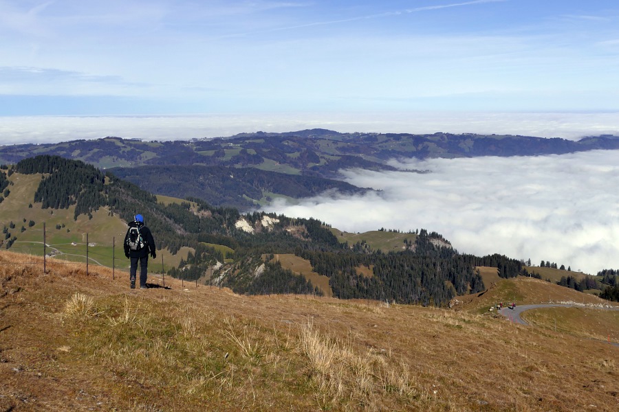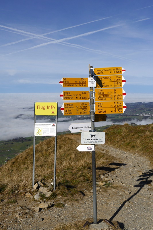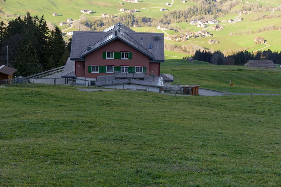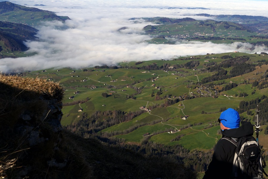Auf der Fahrt nach Brülisau erleben wir ein wahres Wechselbad zwar nicht der Gefühle aber der Wetterverhältnisse. Der Novembernebel hat den Bodensee fest im Griff, bewirkt aber auch relativ moderate Temperaturen. Je weiter wir nach oben kommen (Brülisau liegt auf über 900 m), desto kälter wird es natürlich in der Nebelsuppe, bis im Appenzellerland die Temperatur gerade so am Gefrierpunkt vorbeischrammt. Da entdecken wir ein erste blaues Loch in der Nebeldecke und sind schon vor Brülisau im strahlendsten Sonnenschein und gleichzeitig schnellt die Temperatur "über den Wolken, sprich über dem Nebel" innerhalb weniger Sekunden auf fast zehn Grad hoch.