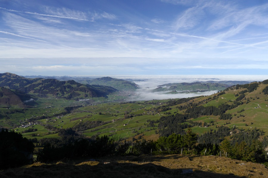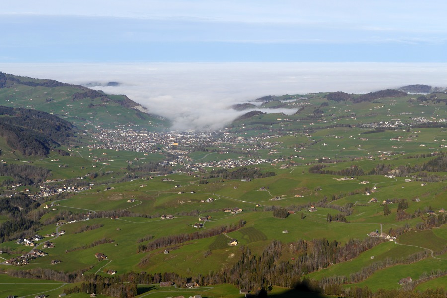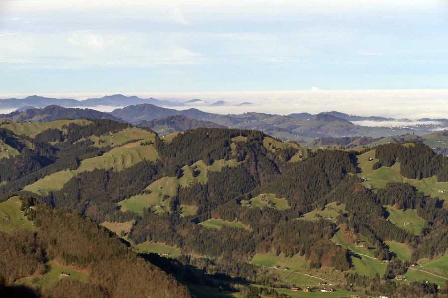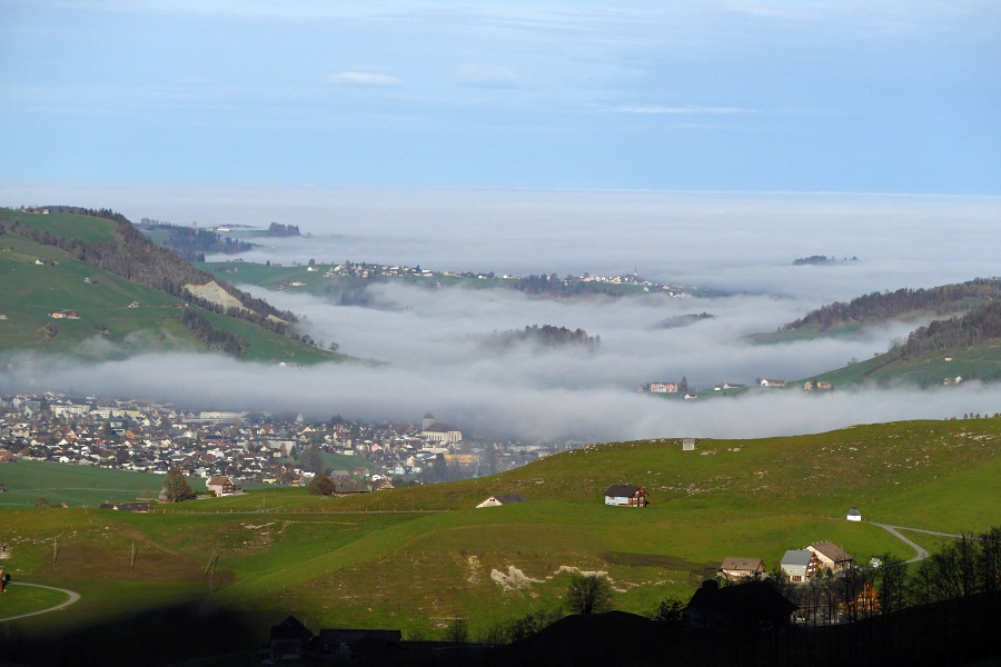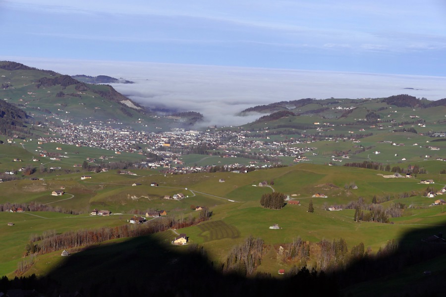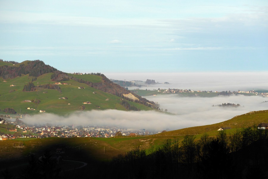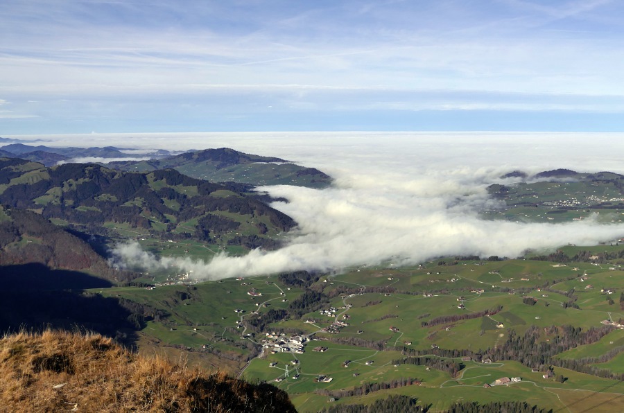 Der Nebel reicht bis Appenzell und nur vereinzelt ragen einige höher gelegene Dörfer oder Hügel daraus hervor.
