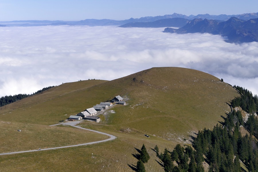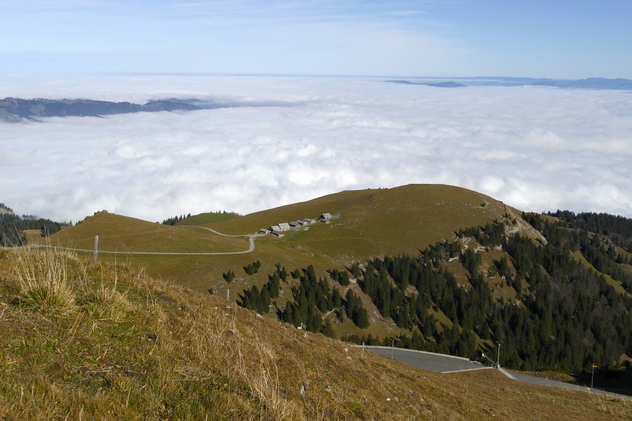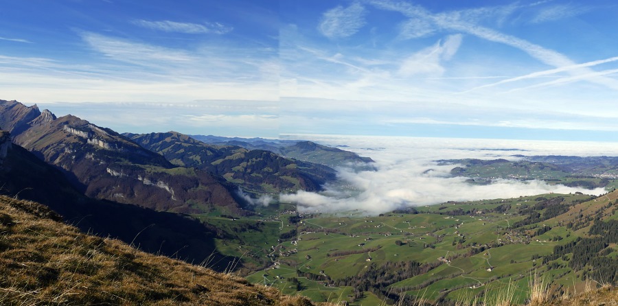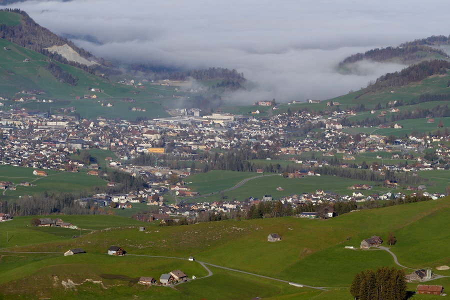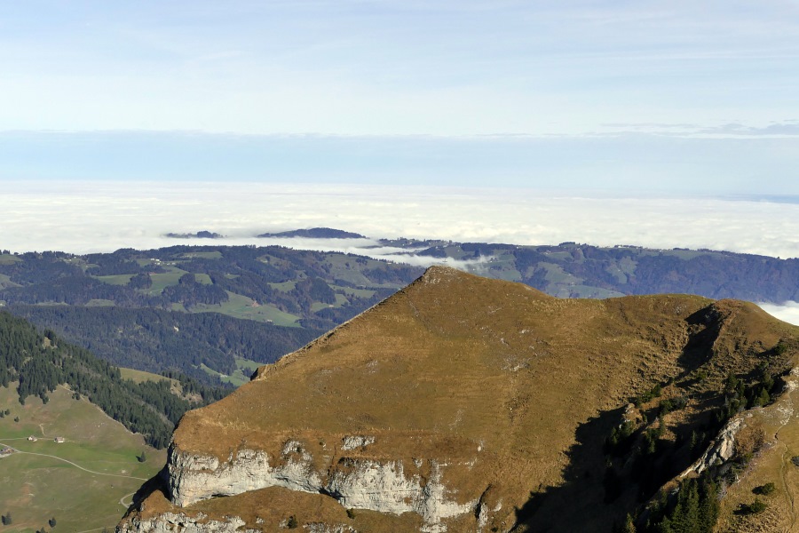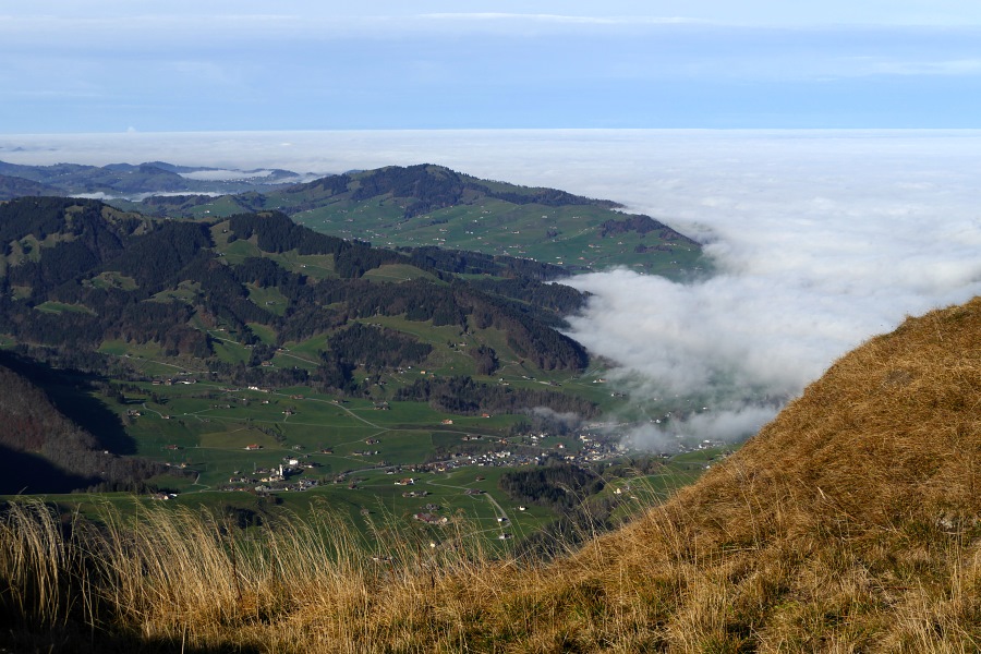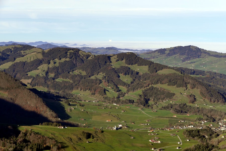 Der Nebel reicht bis Appenzell und nur vereinzelt ragen einige höher gelegene Dörfer oder Hügel daraus hervor.