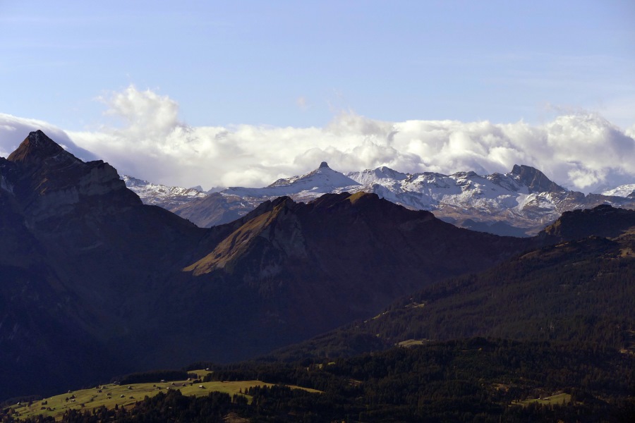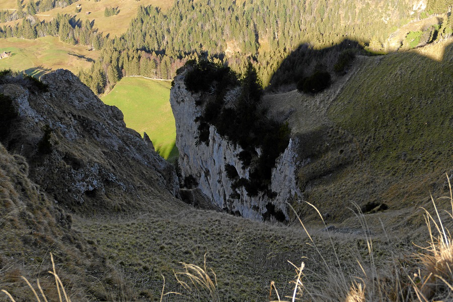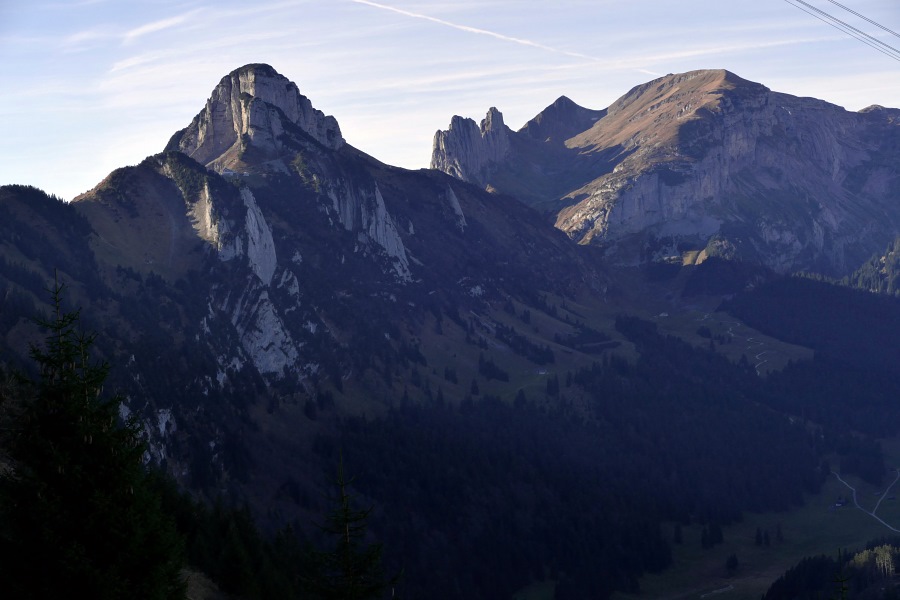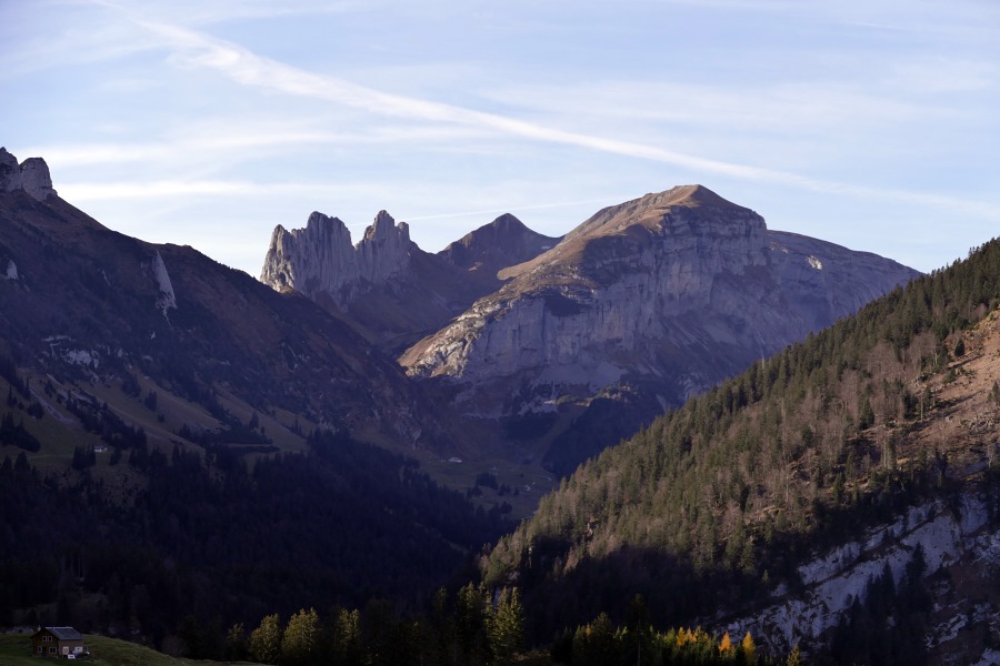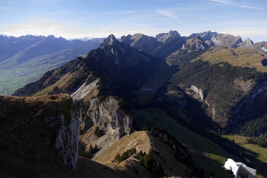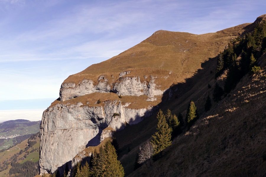 Blick zurück zum ebenfalls sonnenbeschienenen Chlosterspitz und zur Hundwiler Höhi.