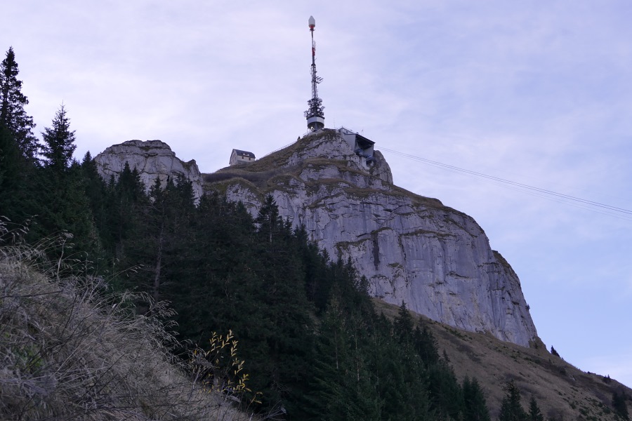 Das ist aber nicht das einig Kuriose. Am Auto muss man nun das Stuer gut festhalten, denn es setzt sofort nach Durchbrechen der Nebeldecke ein überaus böiger Wind ein. Und erst als wir das Auto abstellen und aussteigen erkennen wir, dass es sich hier um einen ausgewachsenen Föhnsturm handelt. Eine leere Mülltüte ist innerhalb von Sekunden hinter der Kirche verschwunden, die Kofferraumtür muss man festhalten, damit das Scharnier nicht durch die heftig wechselnde Böen Schaden nimmt. Auf dem Parkplatz haben sich schon zwei Reihen Autos breitgemacht, doch als deren Besitzer erfahren, dass die Seilbahn wegen der Föhnböen nicht fährt, machen sich die meisten wireder auf den Heimweg ode steuern andere Ziele an. Nur wenige machen sich wie wir zu Fuß auf den Weg. Erst abends gegen fünf Uhr beruhigt sich das Wetter schlagartig und die Seilbahn kann endlich doch die Wochenendgäste zu ihrem Ziel hochtragen.