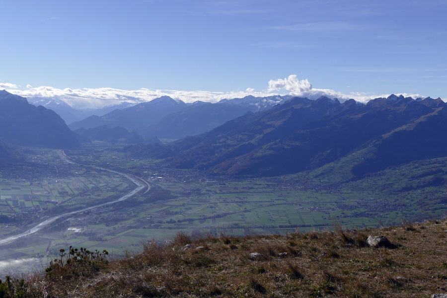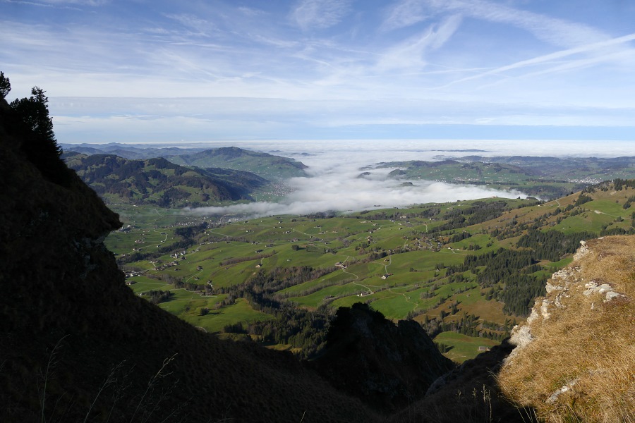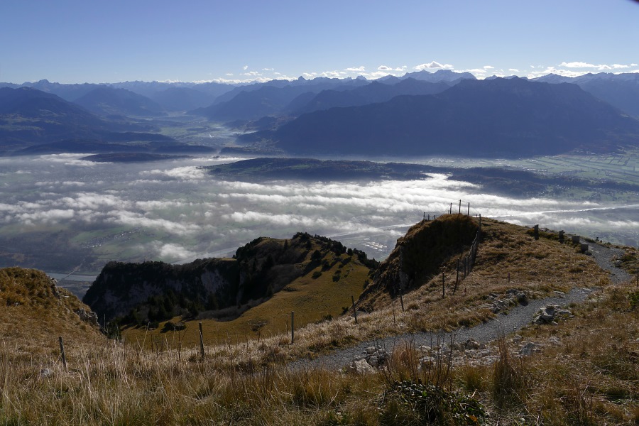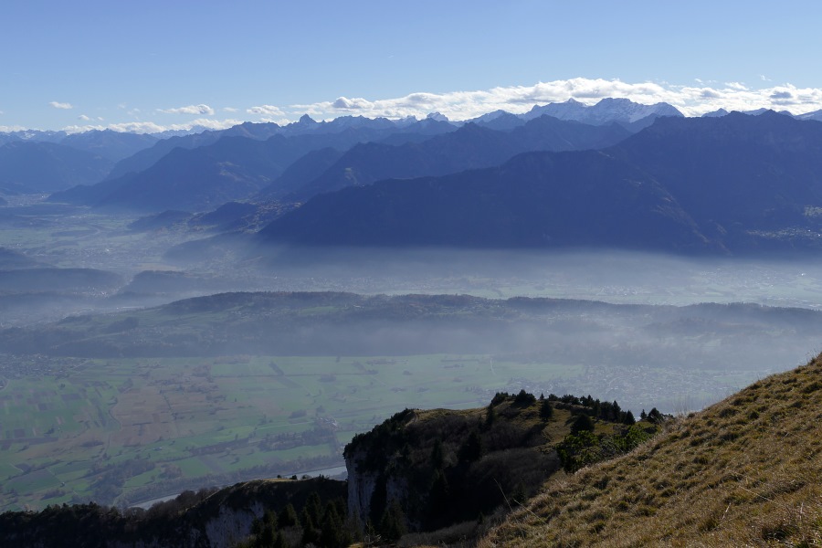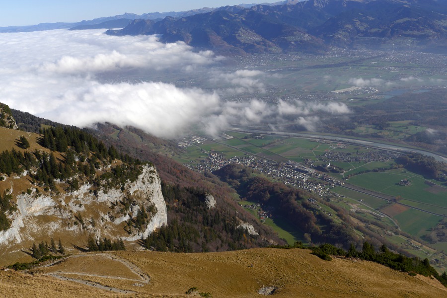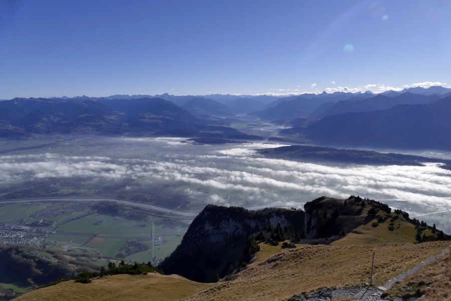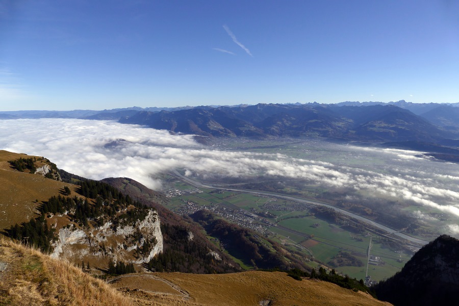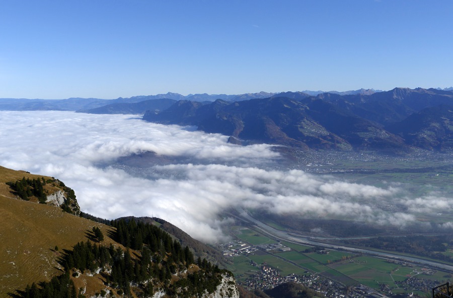 Endlich sind wir am Sattel angelangt und blicken nun ins Rheintal hinab. Hier herrscht zwar Dunst, aber der Nebel reicht nicht das ganze Rheintal hnauf.