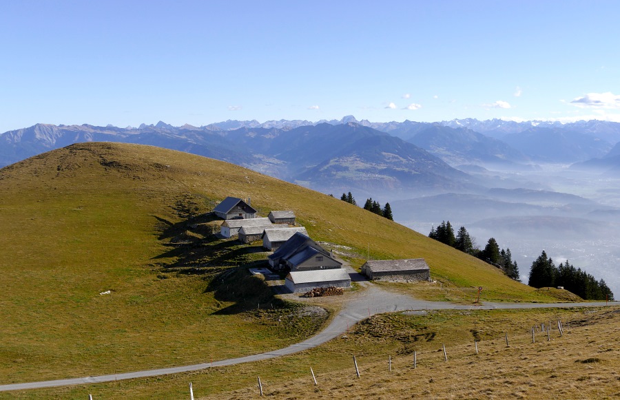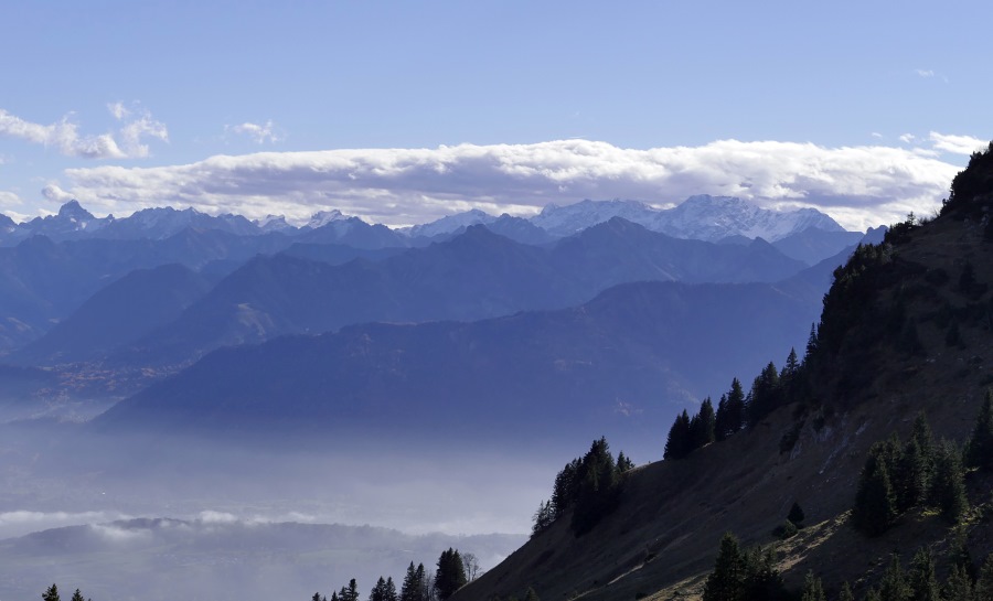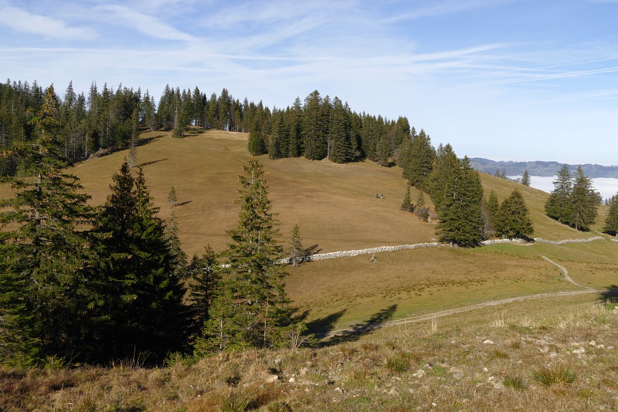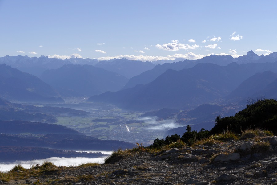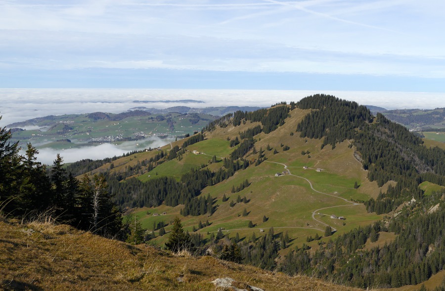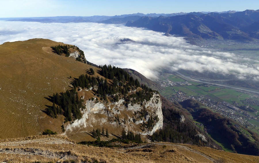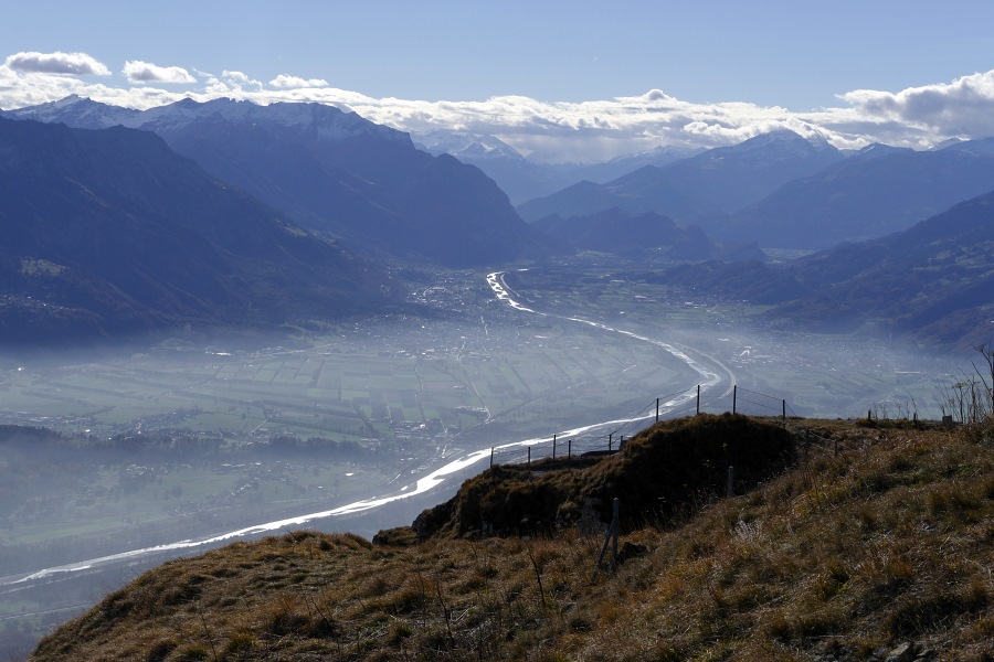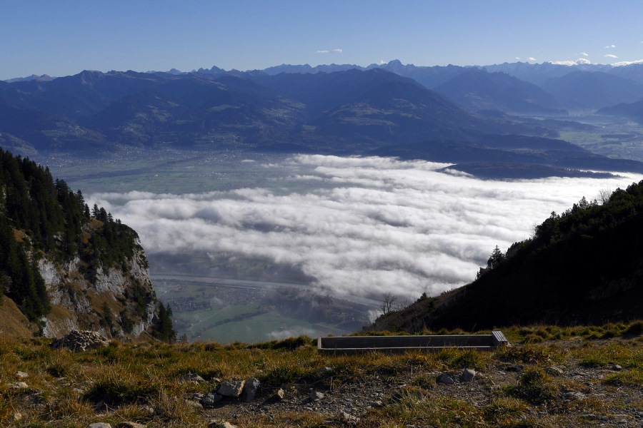Endlich sind wir am Sattel angelangt und blicken nun ins Rheintal hinab. Hier herrscht zwar Dunst, aber der Nebel reicht nicht das ganze Rheintal hnauf.