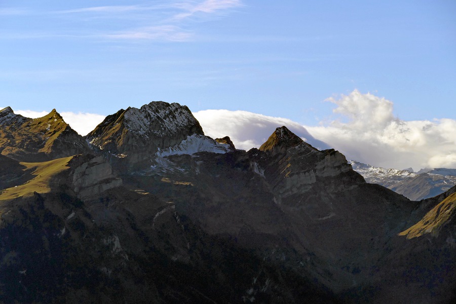 Altmann, Säntis, Marwees und darunter die markanten hellen Zähne der Dreifaltigkeit