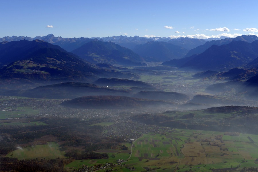 Rheintalebene mit den Nebelfetzen, die vom Bodensee heraufziehen