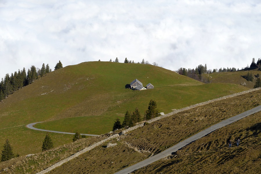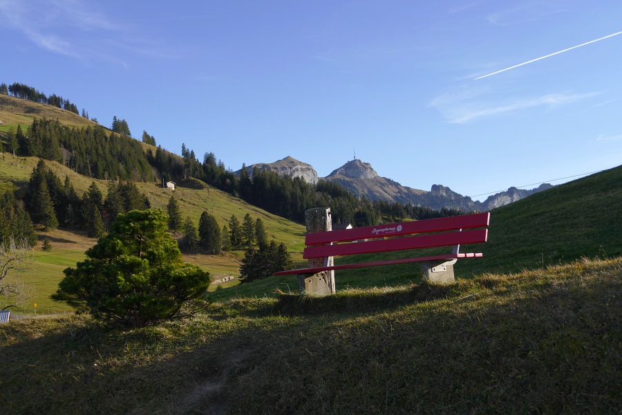 Ruhebänkchen beim Restaurant Eggli, wo uns die Zivilisation in Form eines vollgefüllten Parkplatzes wieder einholt. Während des ganzen übrigen Tages waren wir föhnbedingt nicht sehr vielen Wanderern oder Fahrradfahrern, wie sonst am Hohen Kasten üblich, begegnet.