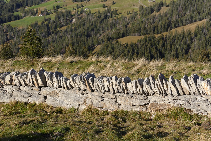 Noch eine Steinmauer am Punkt 1285 in der Nähe des Montlinger Schwamms, wo wir eine kleine Pause einlegen - und uns gegen den dritten Gipfel entscheiden. Als Ersatzziel ist nun das Restaurant Eggli vorgesehen.