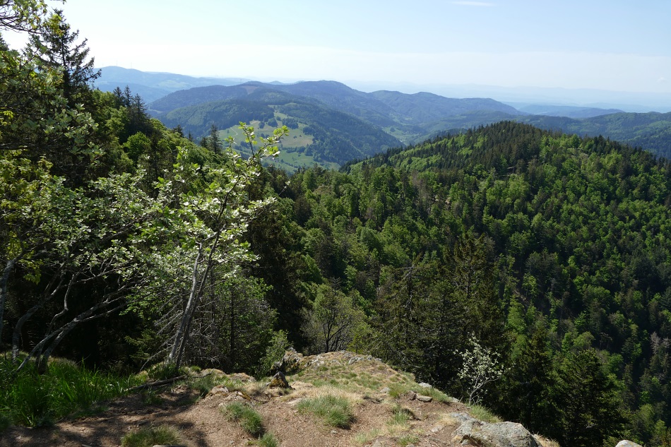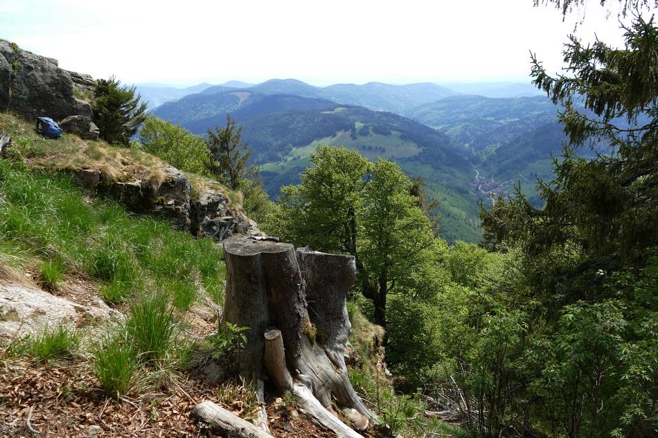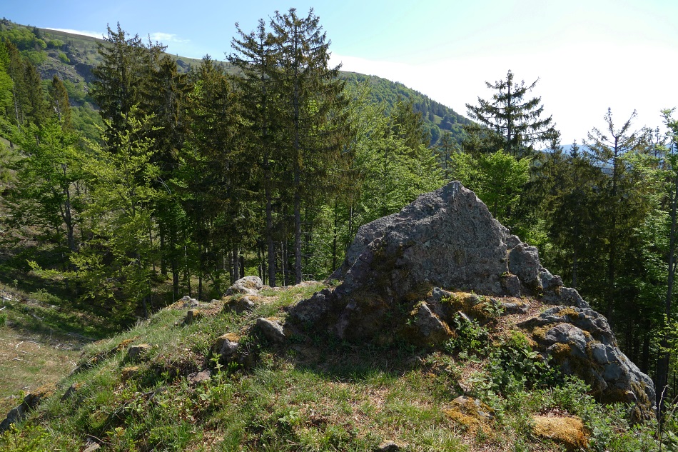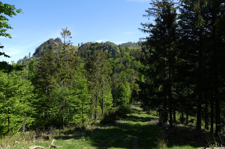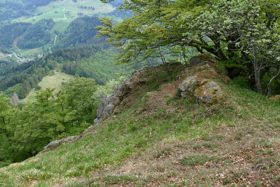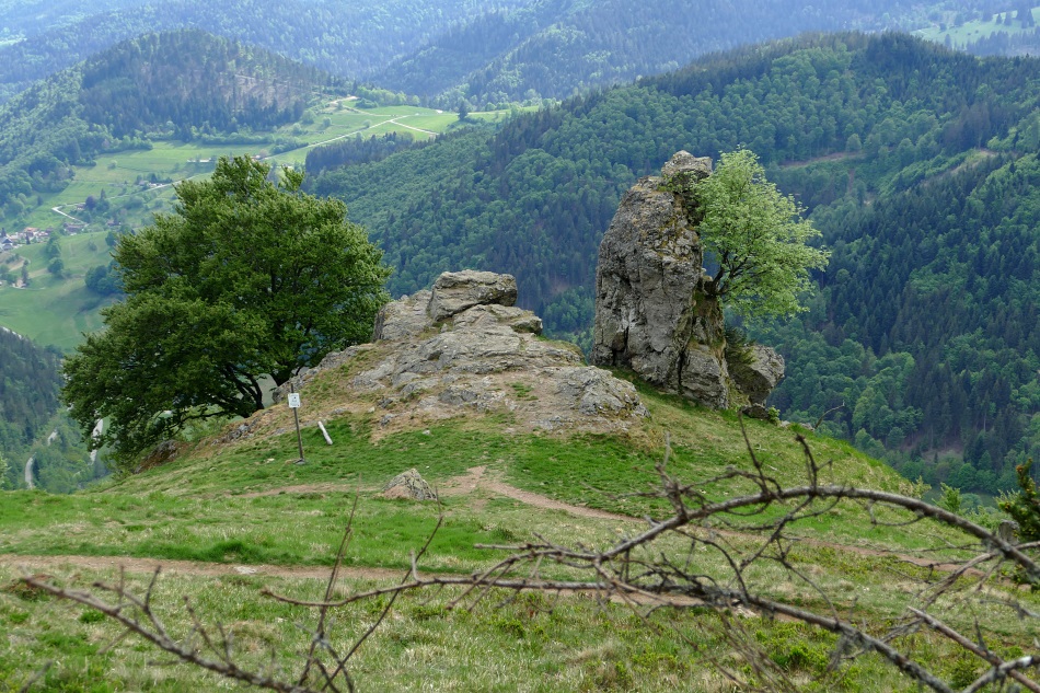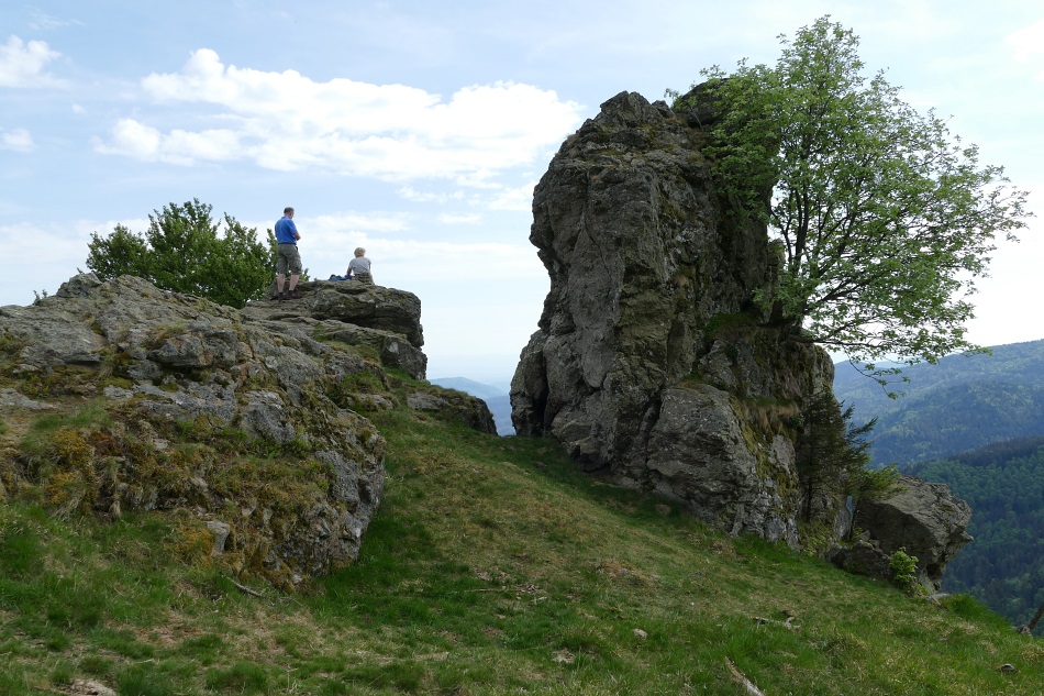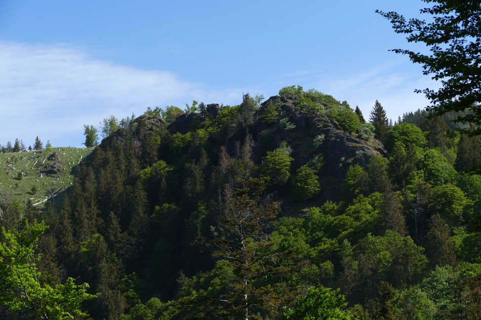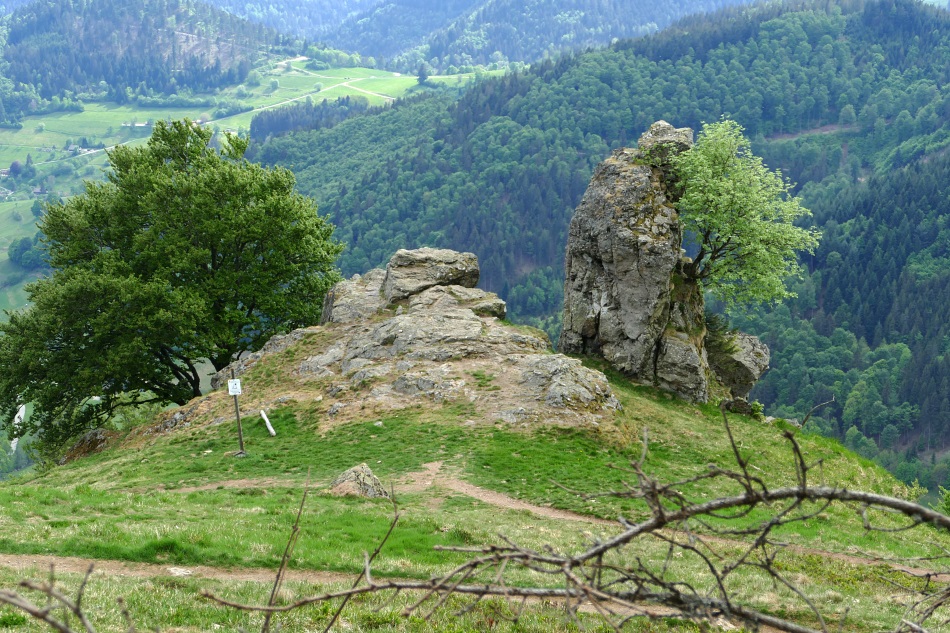 Felsen der Hohen Kelch, unterhalb denen der weitere Wanderweg verlaufen wird.