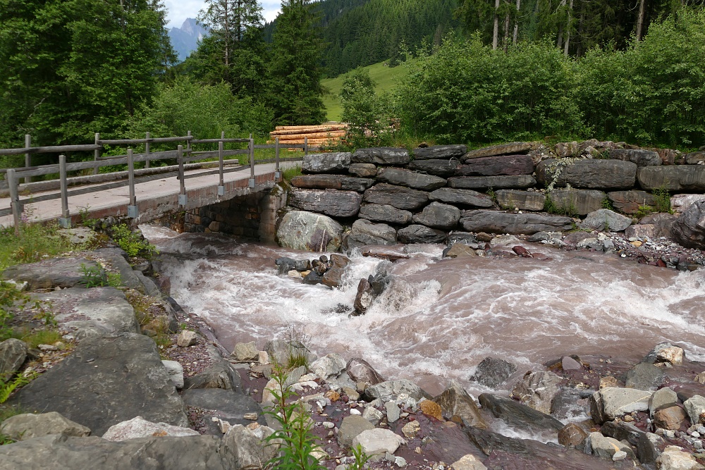 Los geht die Tour am offiziell noch kostenfrei befahrbaren Straßenende im Schilstal bei Steinbrugg. Hier ist offenes Weideland und so ist der Wanderparkplatz auch zum Schutz vor den Kühen komplett eingezäunt. Die Schils rauscht in diesen regenreichen Tagen als mächtiger, trübbauner, reißender Fluss durch sein Bachbett.