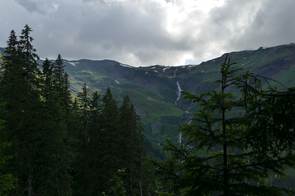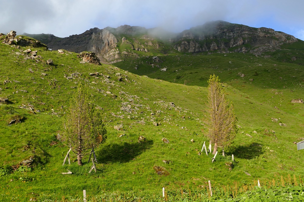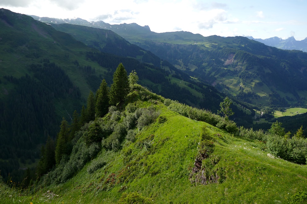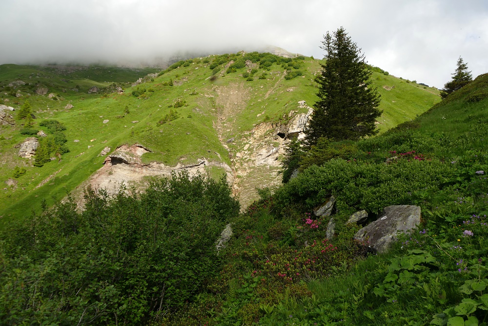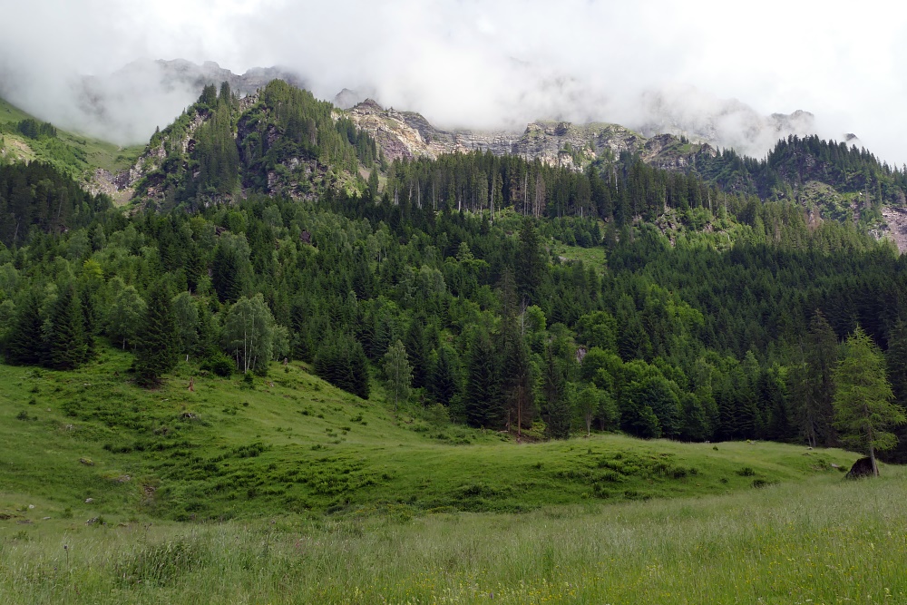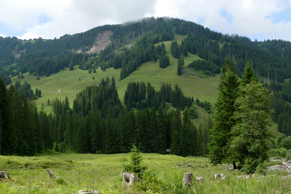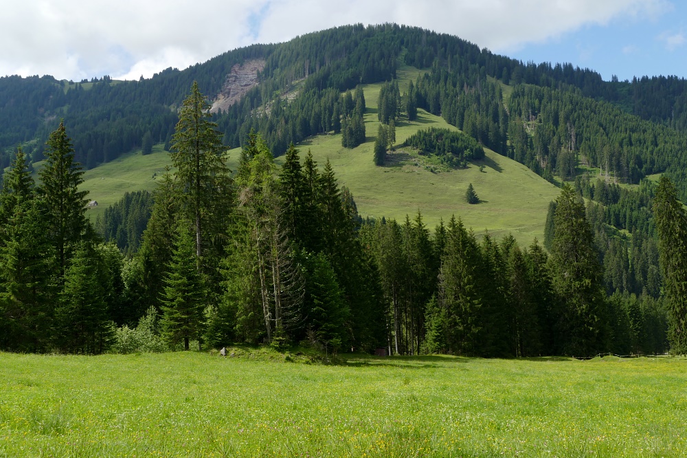 Bald darauf verzweigt sich der Weg. Geradeaus wäre für den Wanderer eine Sackgasse, der ausgeschilderte Wanderweg führt nach links hoch zur Alpe Werdenböl. Von hier aus ist bereits das vor mir liegende Aufstiegsweg zu erkennen und auch der höchste Punkt schon zu erahnen. Der Weg führt zunächst rechts durch den Bruchwald, quert dann nach links bis zum tief eingeschnittenen Fansbach und umgeht den Felssporn in der Bildmitte auf der linken Seite. In sehr steilem Aufstieg erreicht man schließlich den kahlen Hang rechts vom Felssporn und hat dann fast schon die Alpe Rinderfans erreicht.