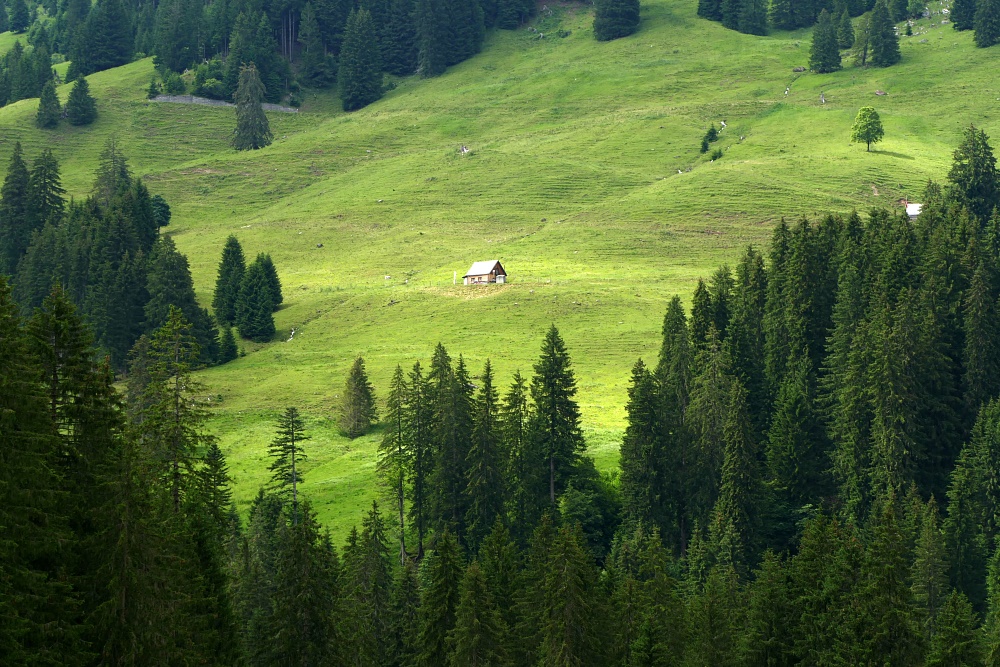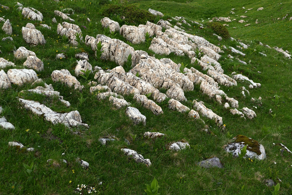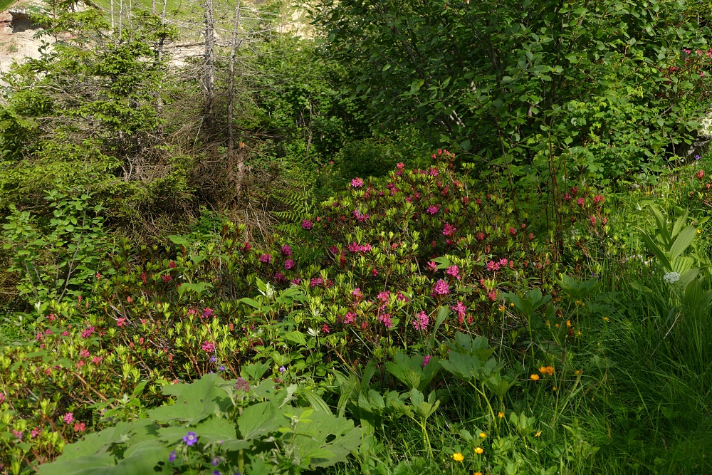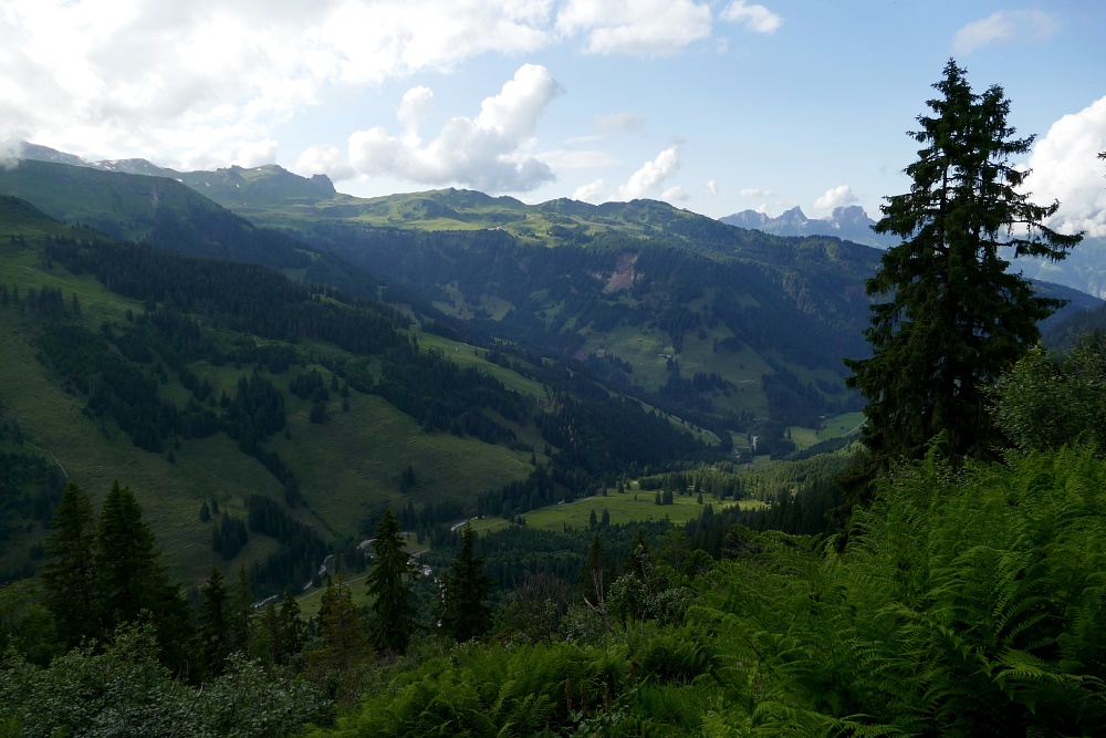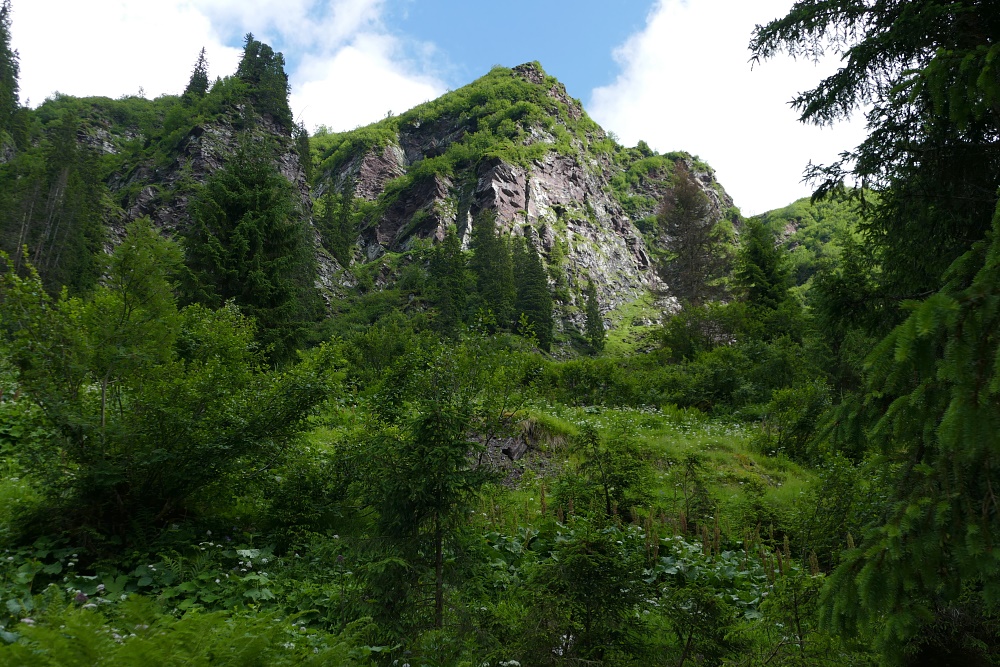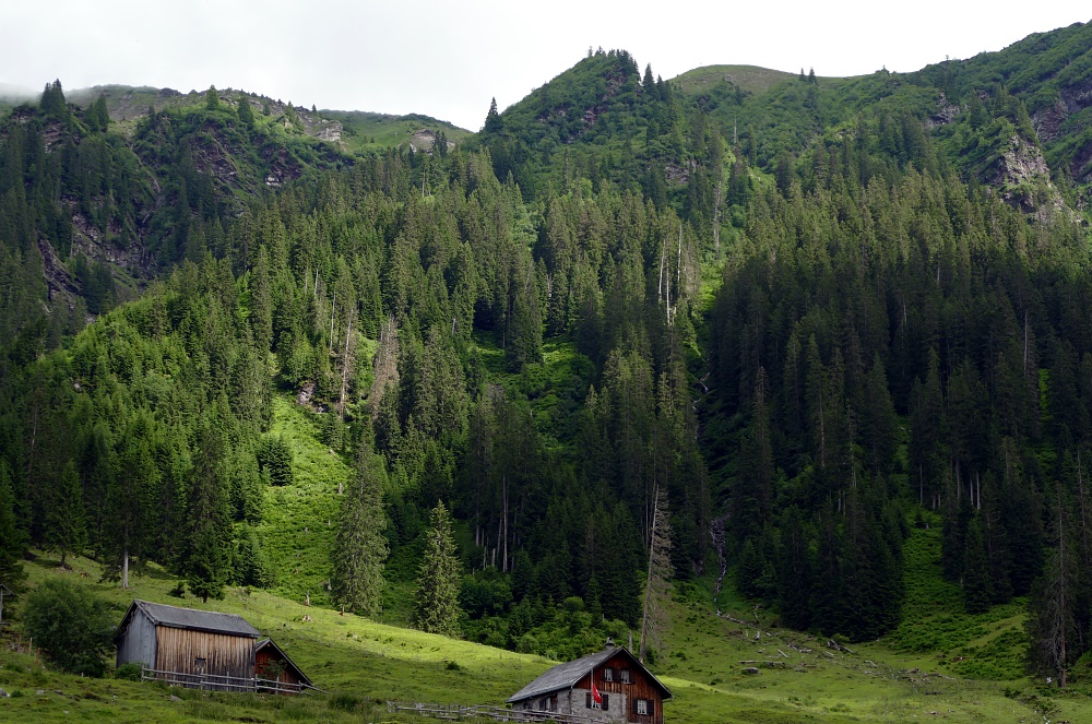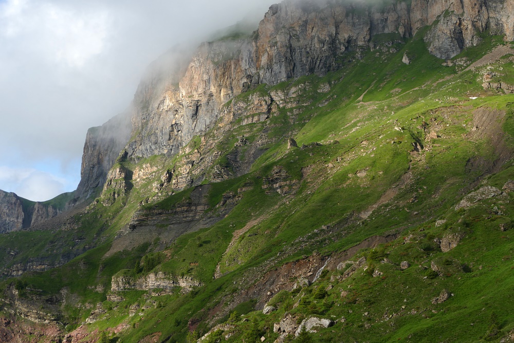 Bald darauf verzweigt sich der Weg. Geradeaus wäre für den Wanderer eine Sackgasse, der ausgeschilderte Wanderweg führt nach links hoch zur Alpe Werdenböl. Von hier aus ist bereits das vor mir liegende Aufstiegsweg zu erkennen und auch der höchste Punkt schon zu erahnen. Der Weg führt zunächst rechts durch den Bruchwald, quert dann nach links bis zum tief eingeschnittenen Fansbach und umgeht den Felssporn in der Bildmitte auf der linken Seite. In sehr steilem Aufstieg erreicht man schließlich den kahlen Hang rechts vom Felssporn und hat dann fast schon die Alpe Rinderfans erreicht.