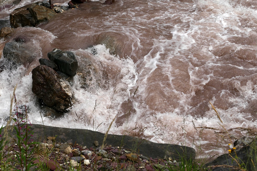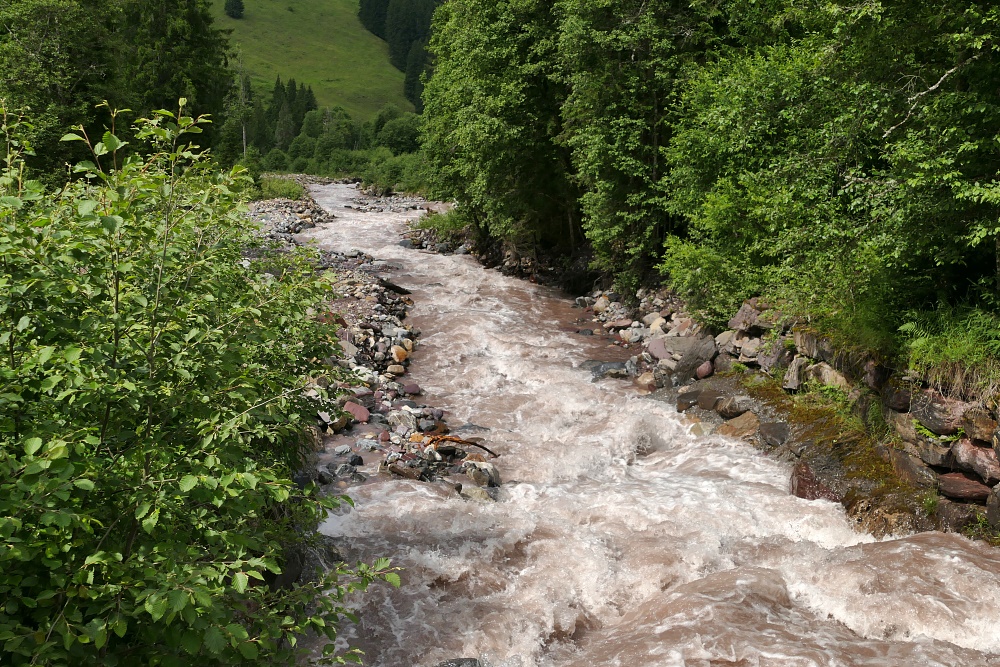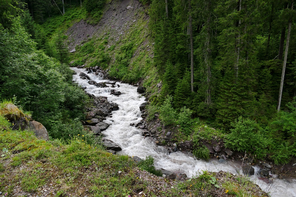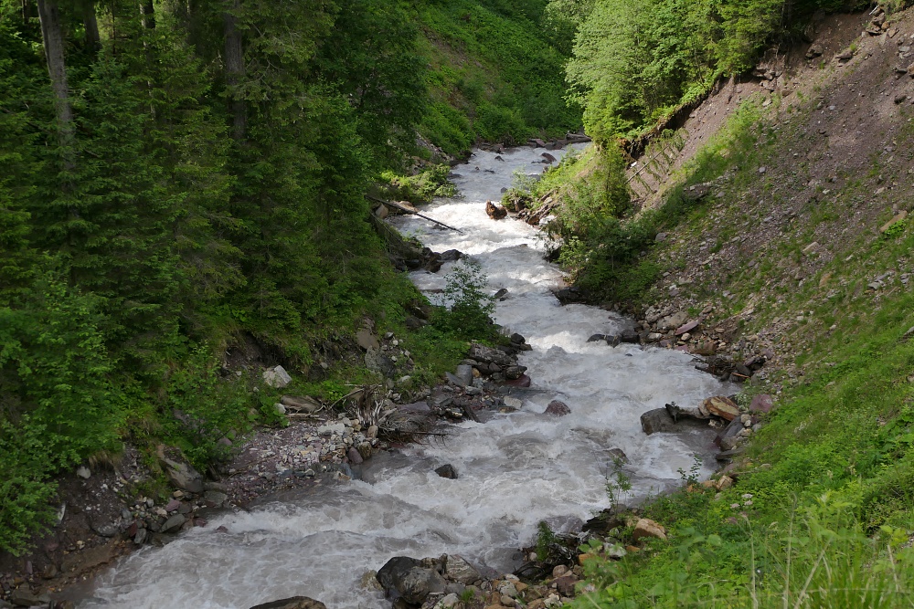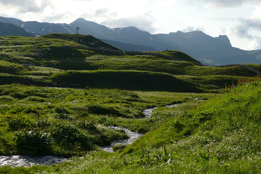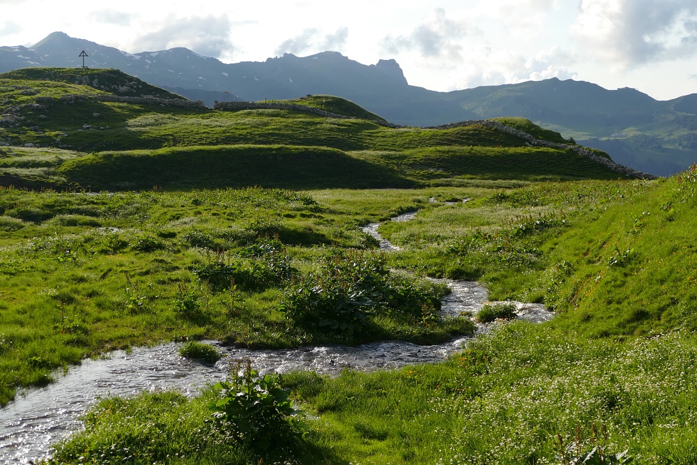 Ein Bachlauf führt unmittelbar an der Alpe Rinderfans vorbei.