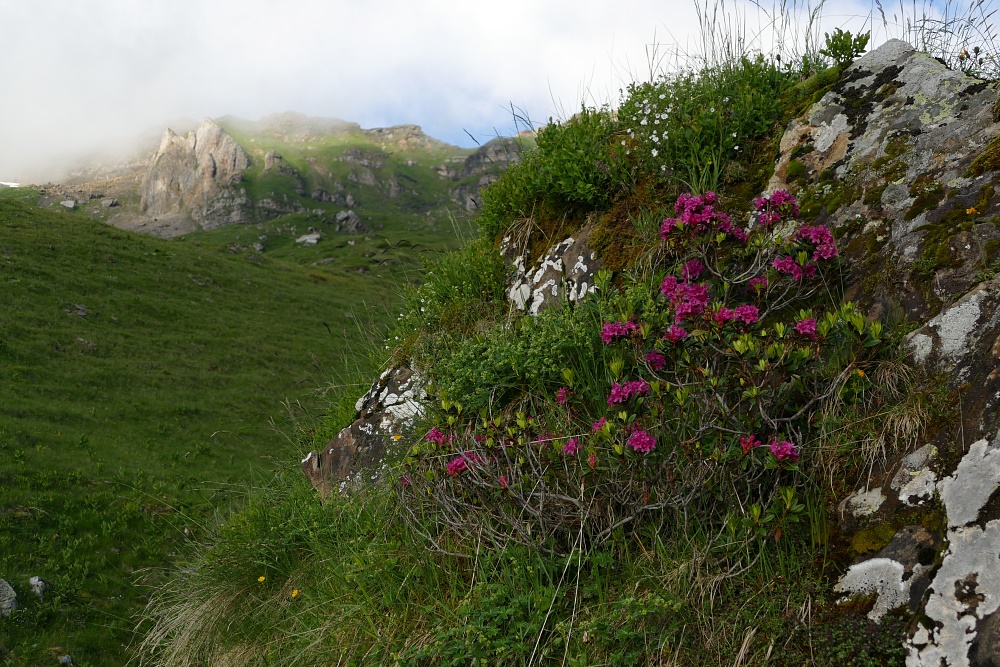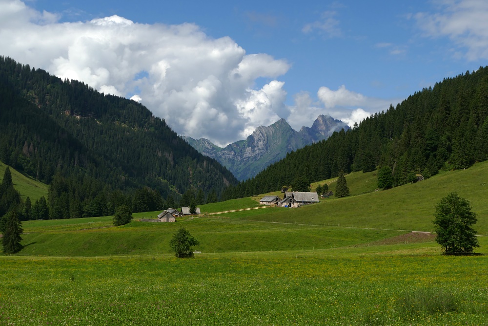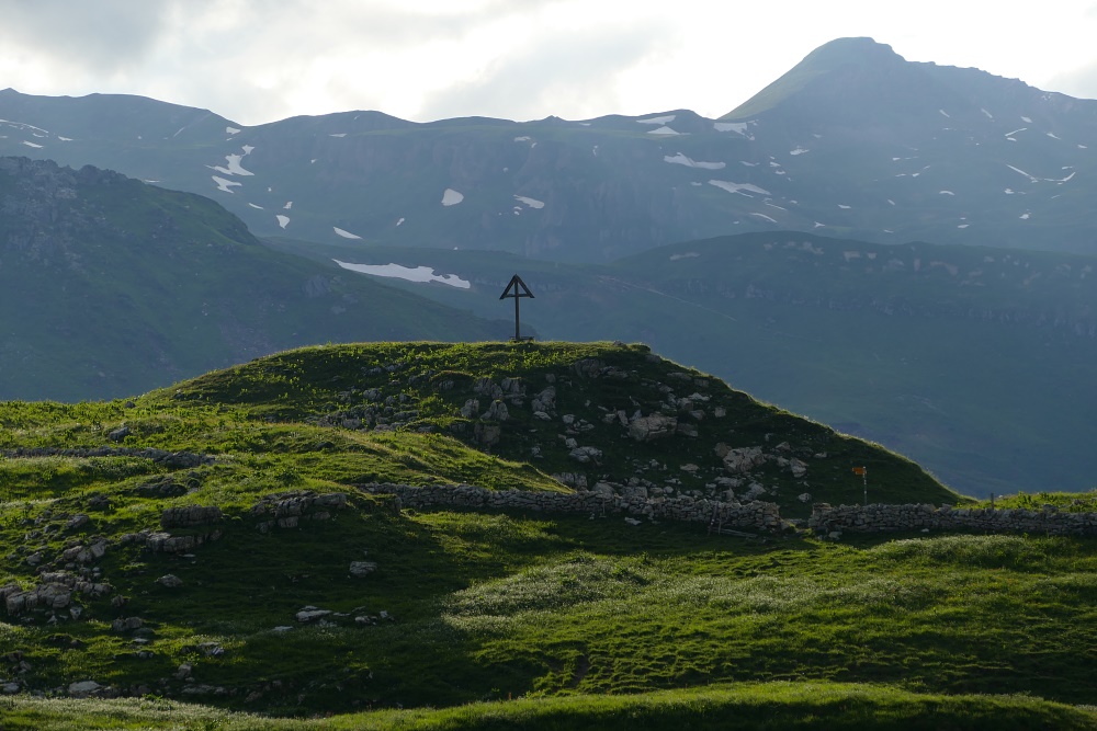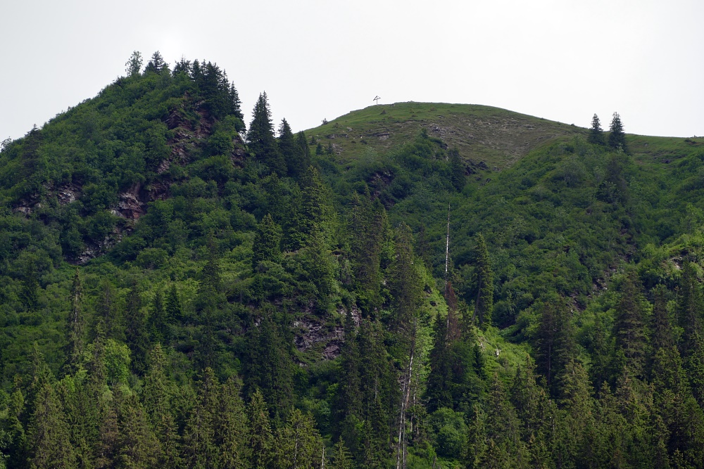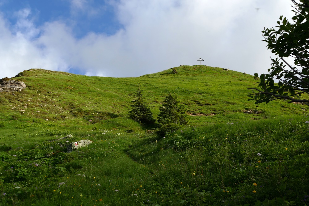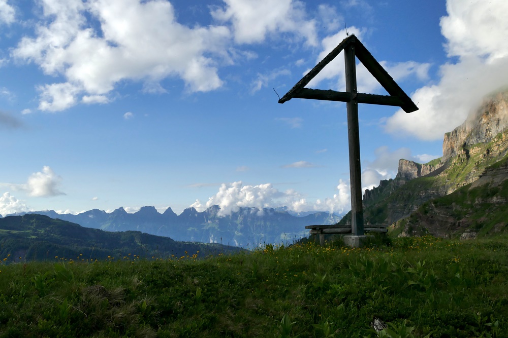 Von weitem ist auch bereits das Gipfelkreuz bei der Alpe Rinderfans erkennbar.
