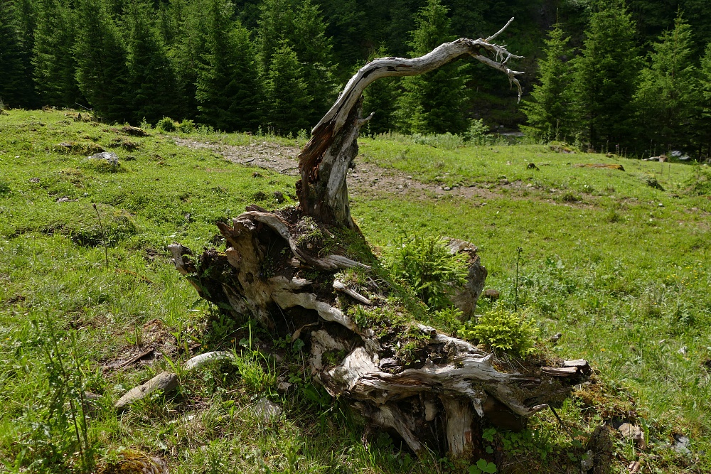 Wurzel-Stillleben mit darauf wachsenden Jungfichten