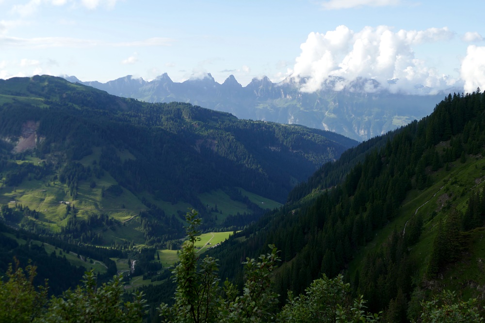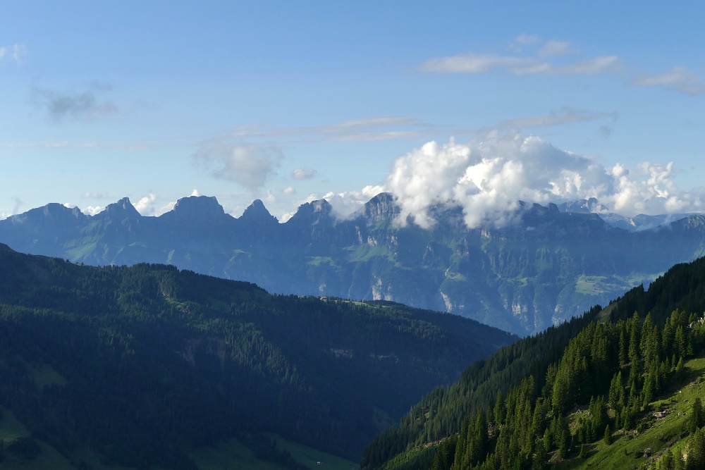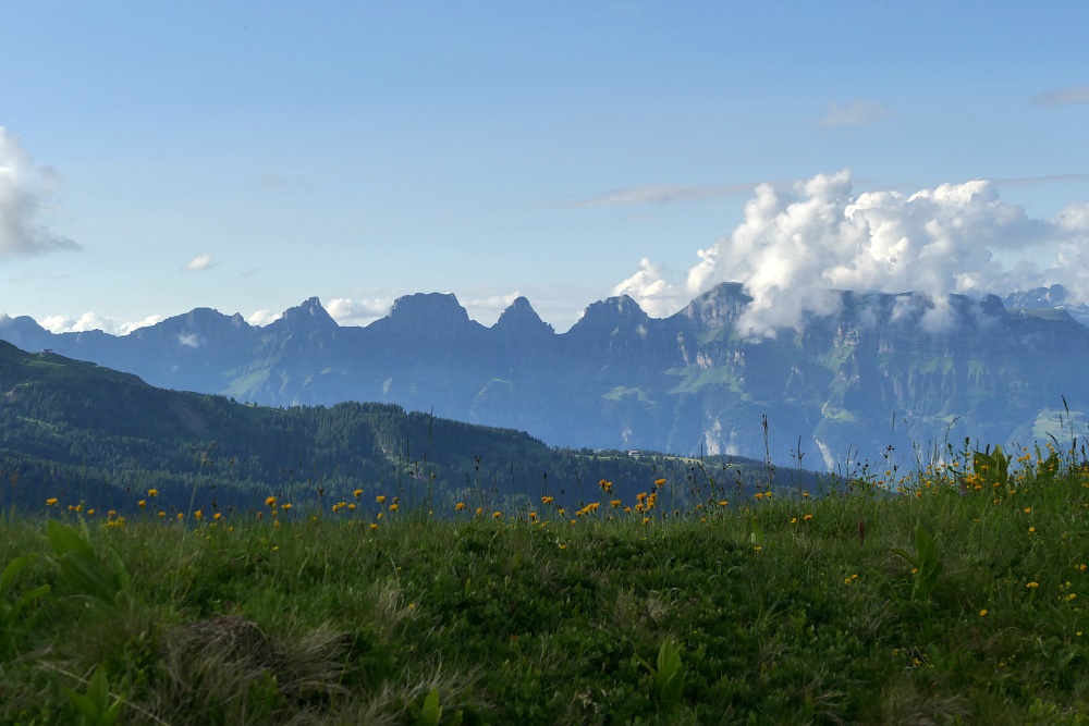 Langsam weitet sich auch der Ausblick. Im Norden dminieren die Zacken der Churfirsten, im Vordergrund erkennt man insbesondere die Liftanlagen der Skigebiete um die Flumserberge.