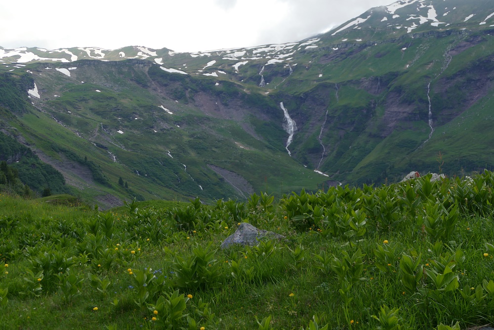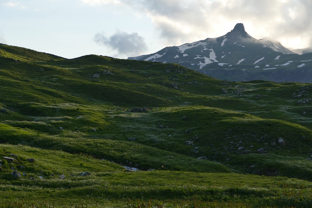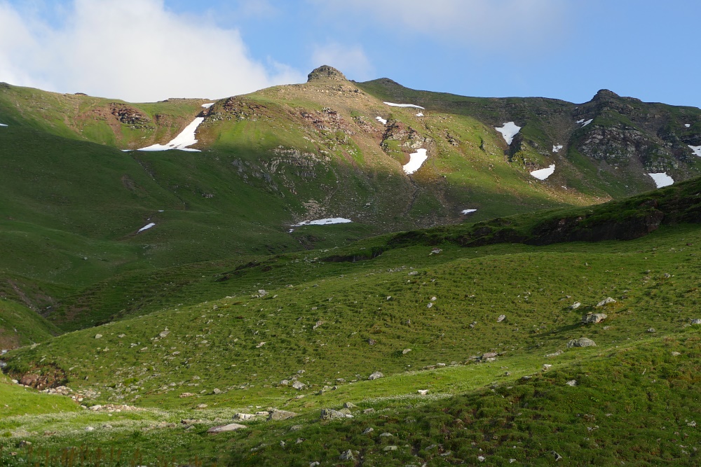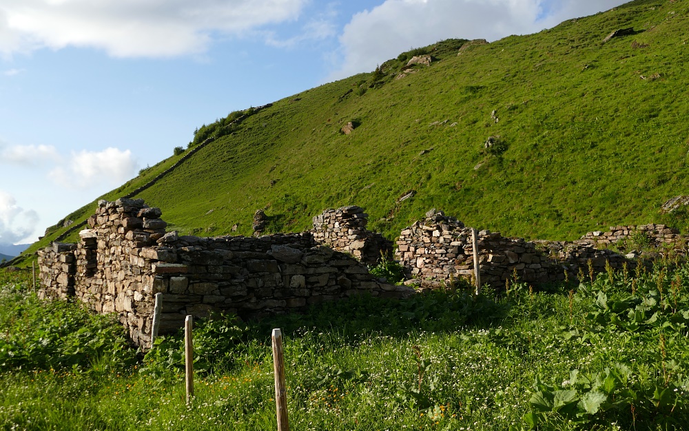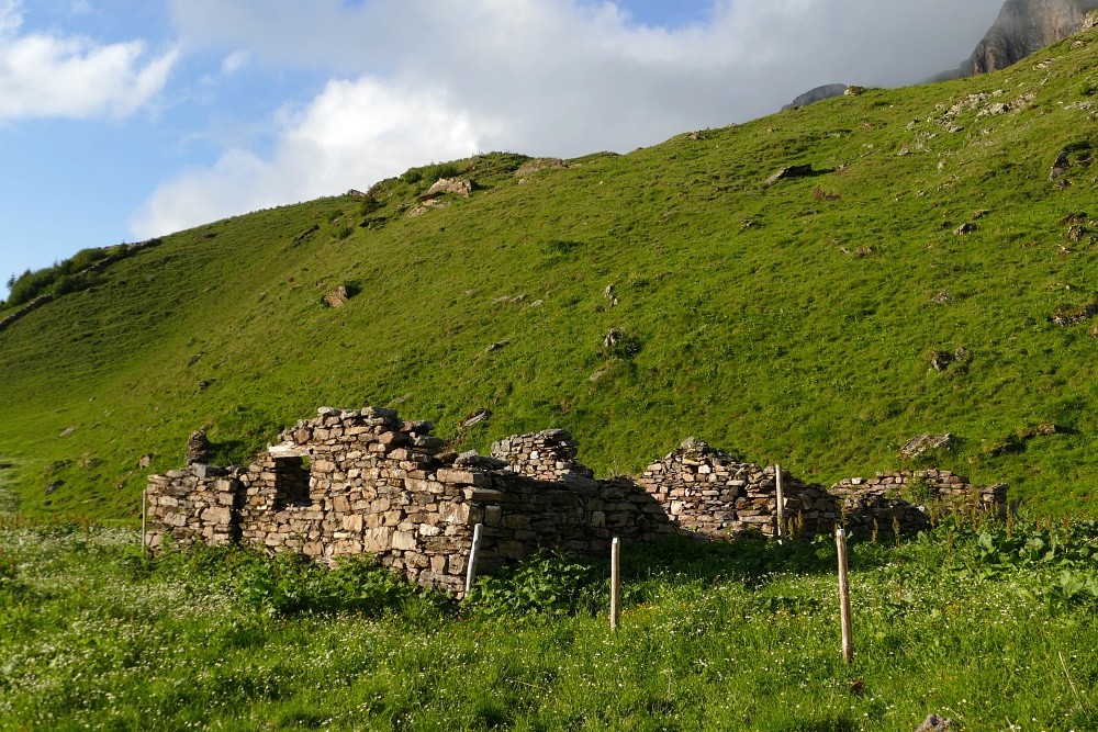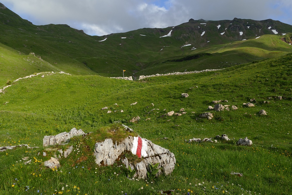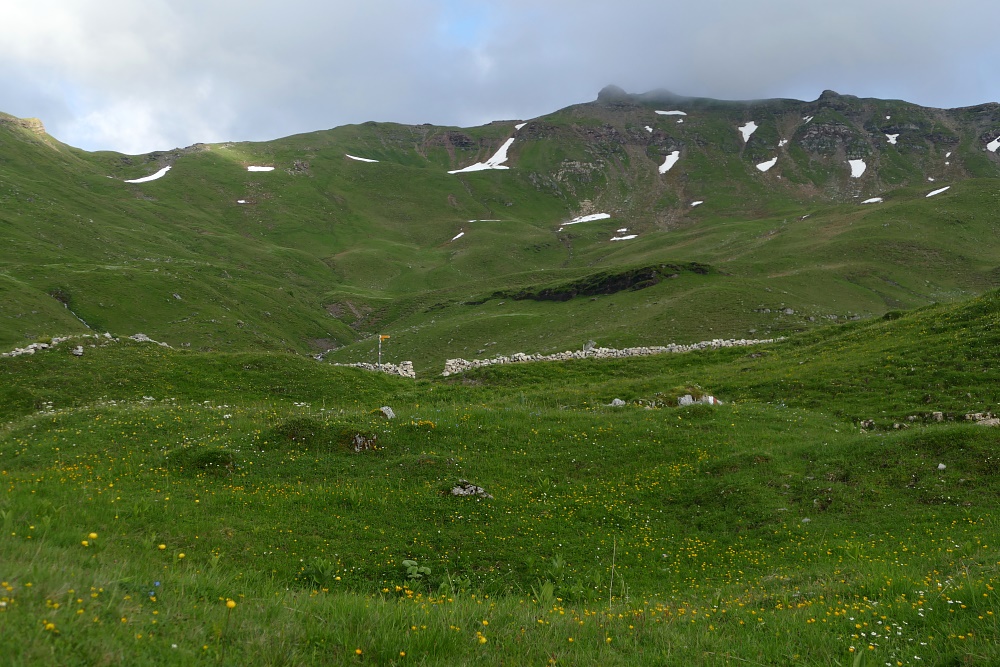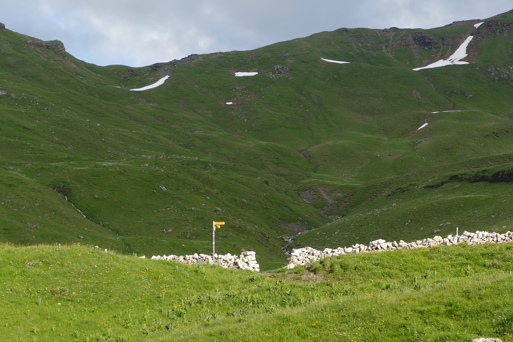 Die Wiesen der Alpe Rinderfans, die durch eine lange steinere Mauer abgegrenzt sind; ein Wegweiser weist darauf hin, dass hier der offizielle Wanderweg zum Spitzmeilen nach rechts abbiegt. Ich möchte jedoch stattdessen am nächsten Tag hoch zur Chläuifurggla, dem Einschnitt ganz auf der linken Seite des Bildes.
