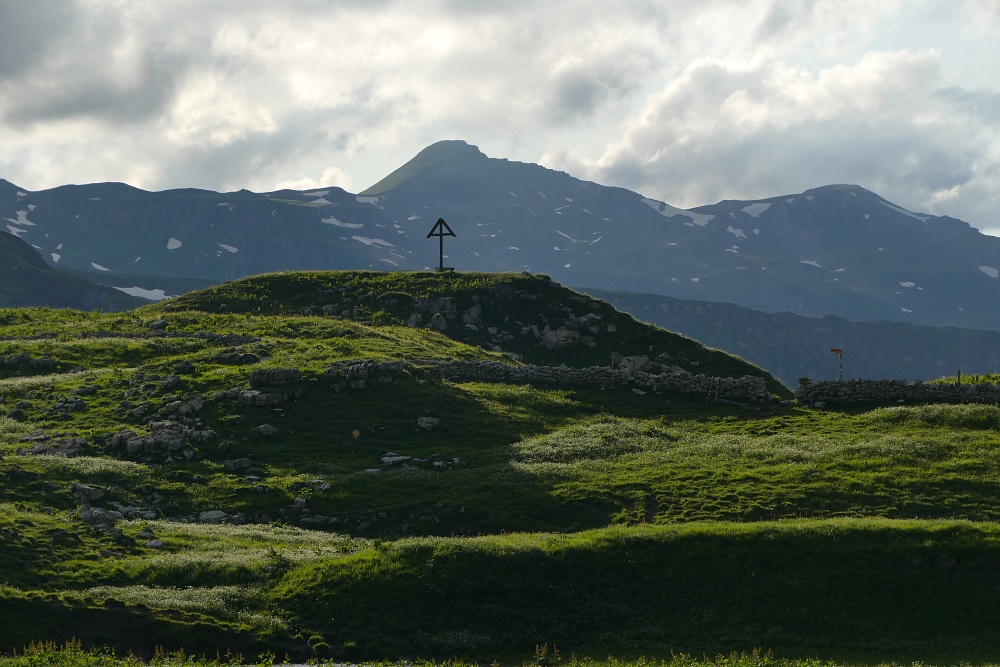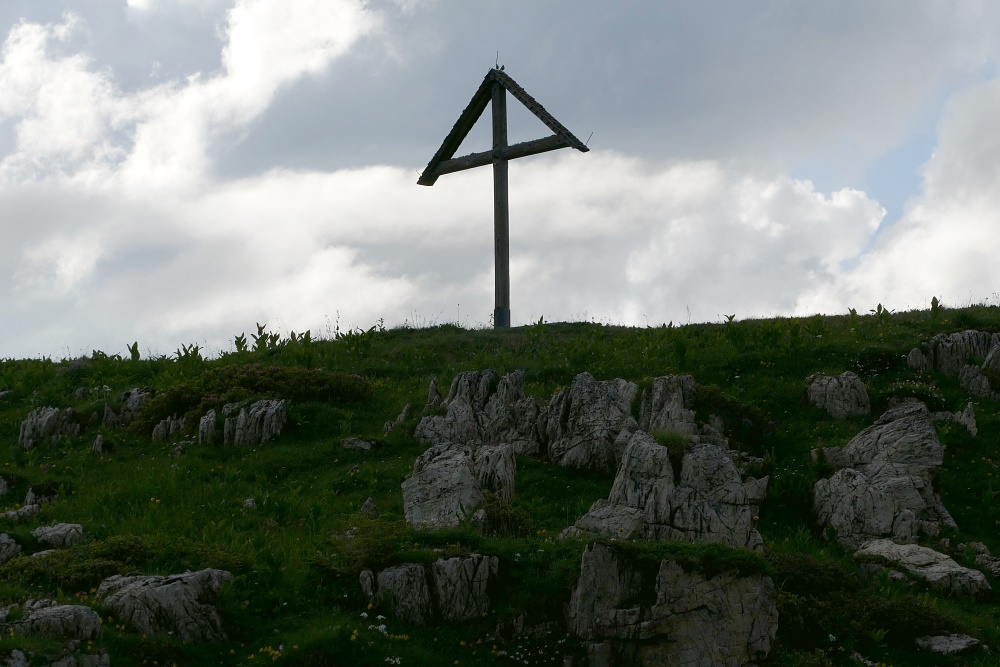 Das Kreuz ist an einem schönen Aussichtspunkt (dem Heubüel, 1973 m), ganz in der Nähe des Alpgebäudes aufgestellt.