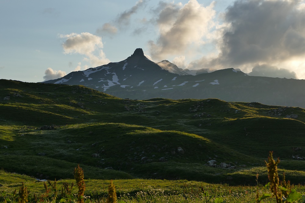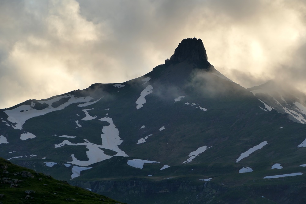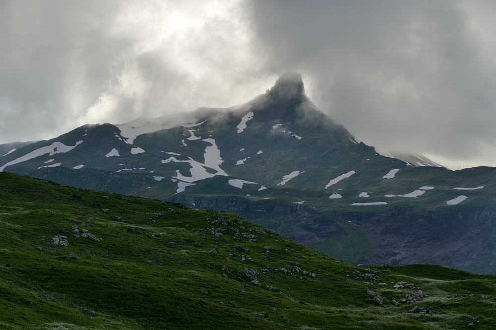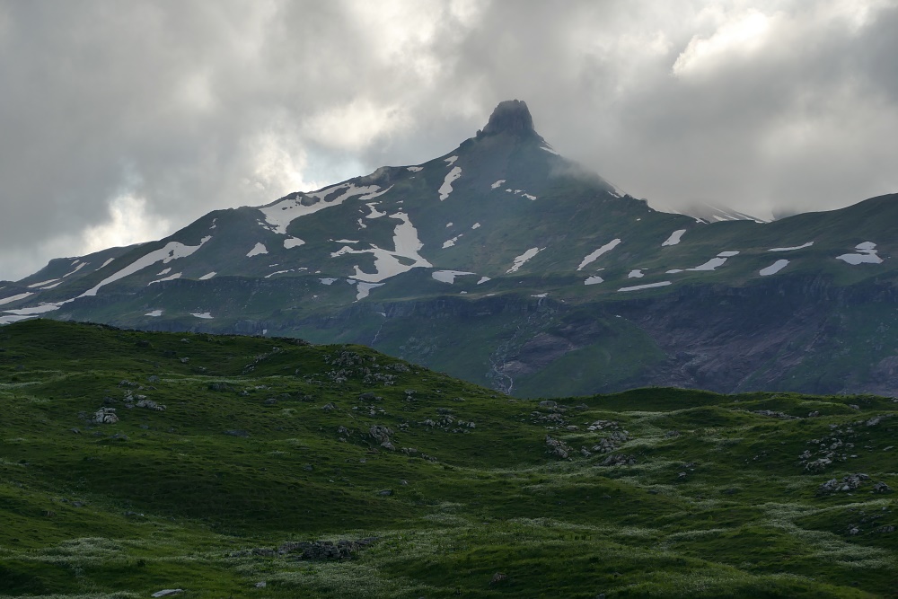 Langsam klart der Himmel über dem Spitzmeilen etwas auf. Dennoch ist die Wetterlage, erkennbar an den über den Himmel jagenden Wolken, sehr dynamisch.