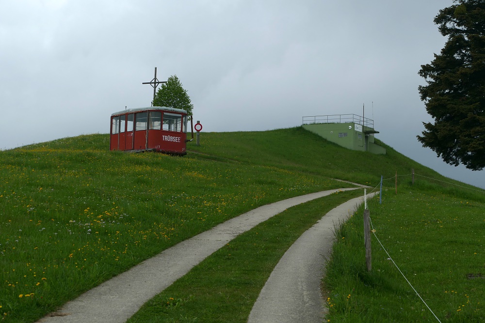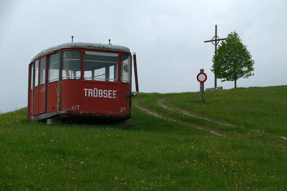 Von dort geht es auf den Alpenpanoramaweg. Kurz nach Aetzleschwand ist in Sichtweite eines Kreuzes und einem Wasserreservoir auf einem Hügel eine ausrangierte Kabine der Trübsee-Seilbahn abgestellt.