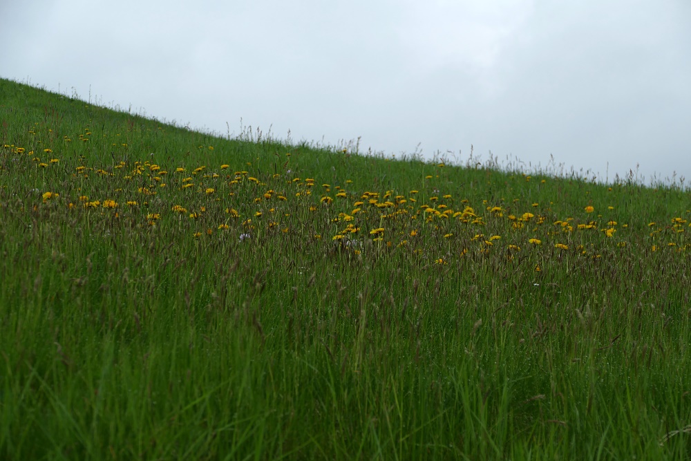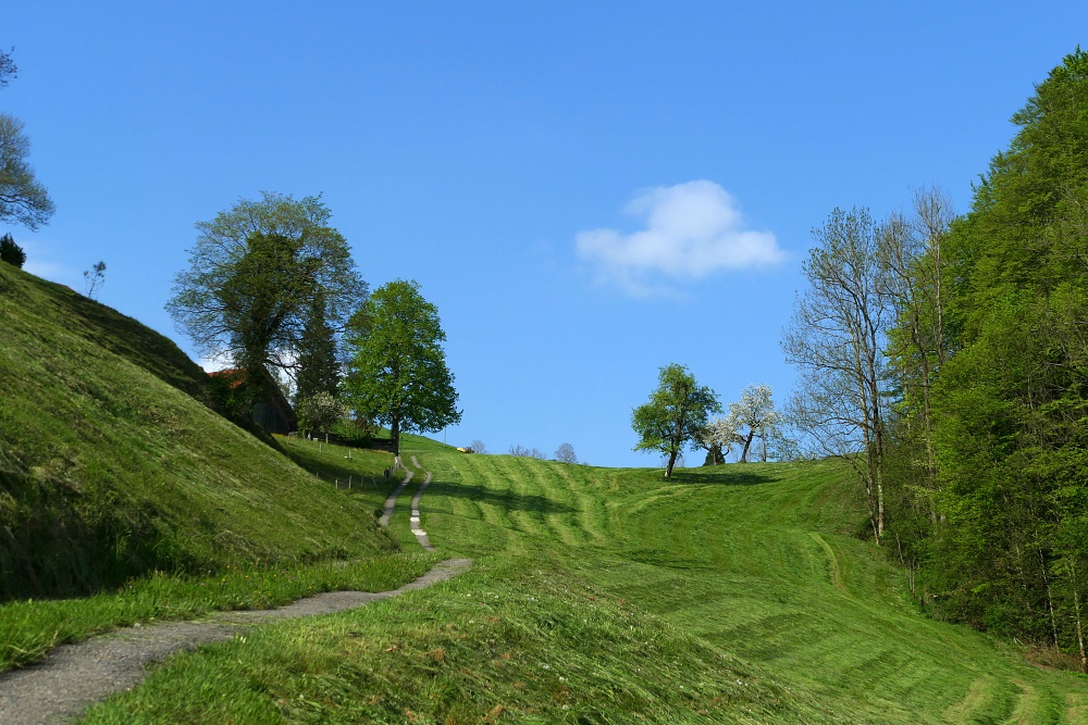 Ich bin inzwischen schon 250 Meter unterhalb meines Startpunktes, so dass es nun heißt, einen Aufstiegsweg zu finden. Steil geht es nun in der Nachmittagshitze hoch Richtung Neumatt. Der Name ist heute gerade passend, da die Matten frisch gemäht sind, und deswegen riecht die Luft auch jetzt wunderbar nach frischem Heu.