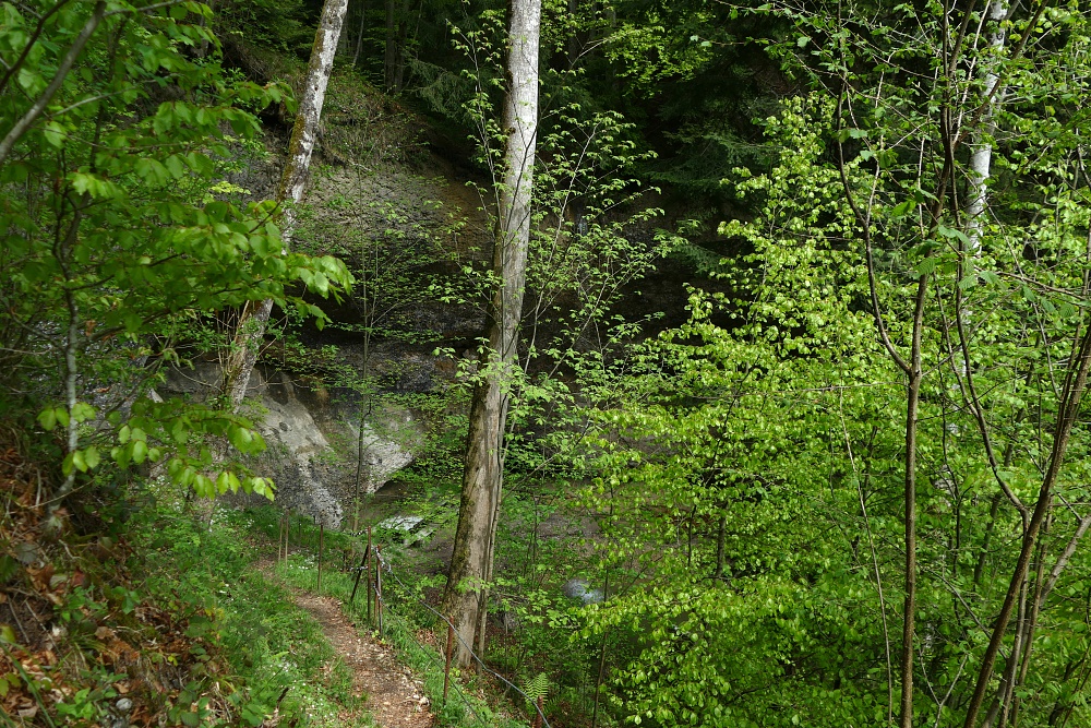 Menzberg streife ich nur am Rande und laufe dann nach Süden ins Tal der Kleinen Emme hinunter. Kurz bevor der Wanderweg auf einen Forstweg trifft, überrascht mich die Aussicht auf einen malerischen Wasserfall.