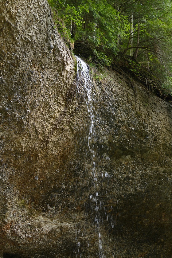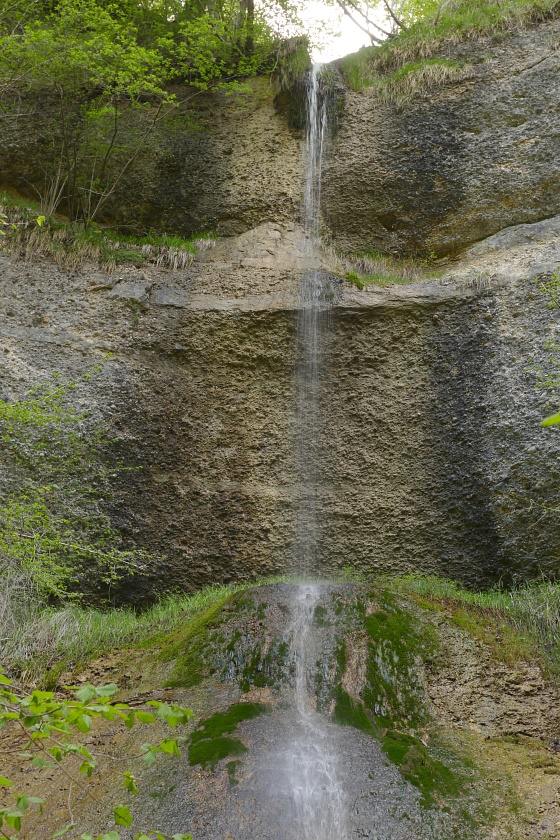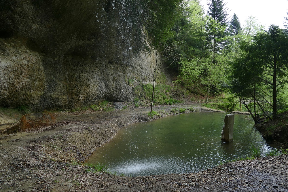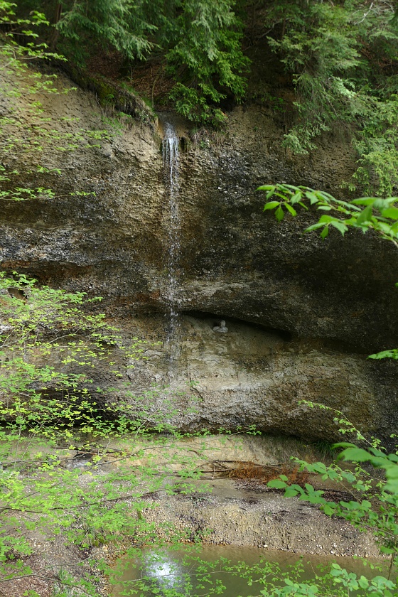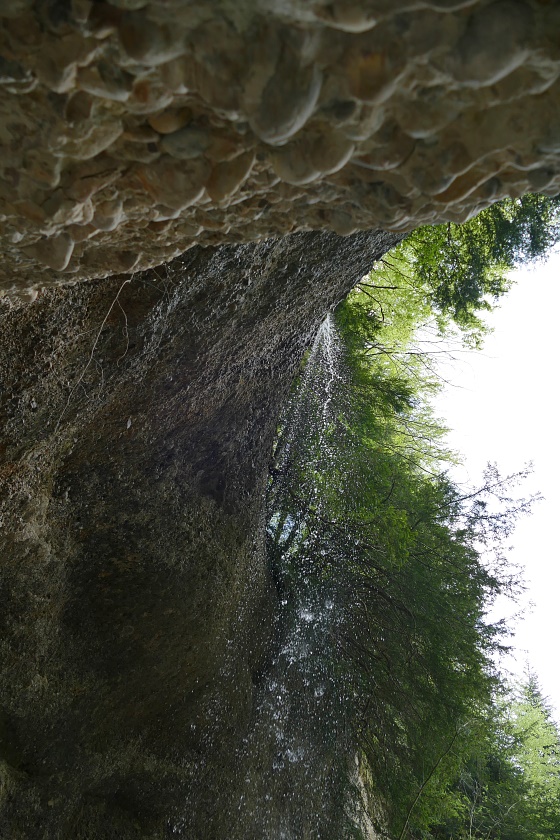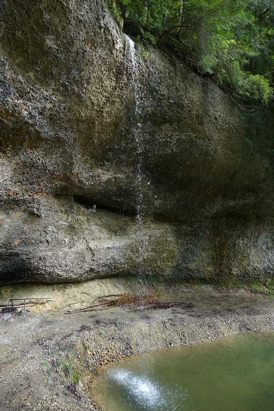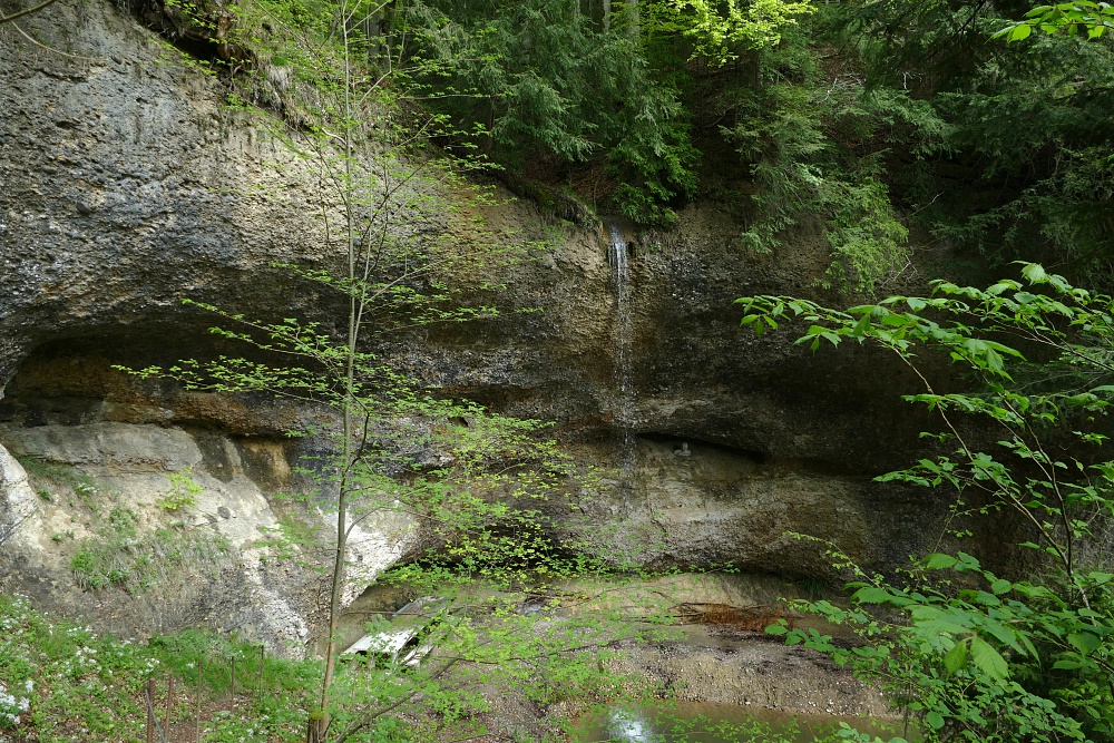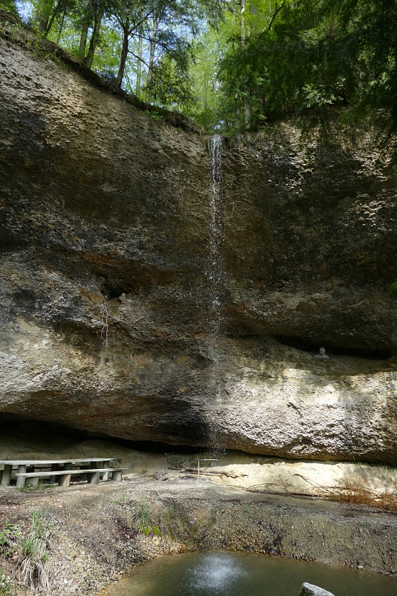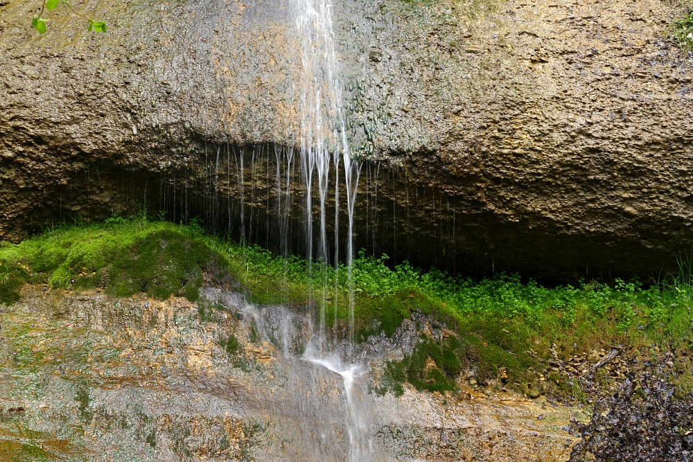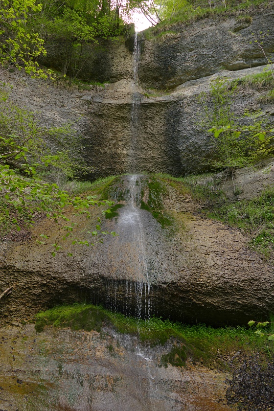 Der Wasserfall, typisch in vielen Vorgebirgen der Alpen mit Nagelfluh-Ablagerungen, bei denen sich ein Bach durch hartes Gestein, gefolgt von weicheren Ablagerungen hindurcharbeiten muss. Dabei bildet sich immer eine mehr oder weniger geräumige Höhlung.