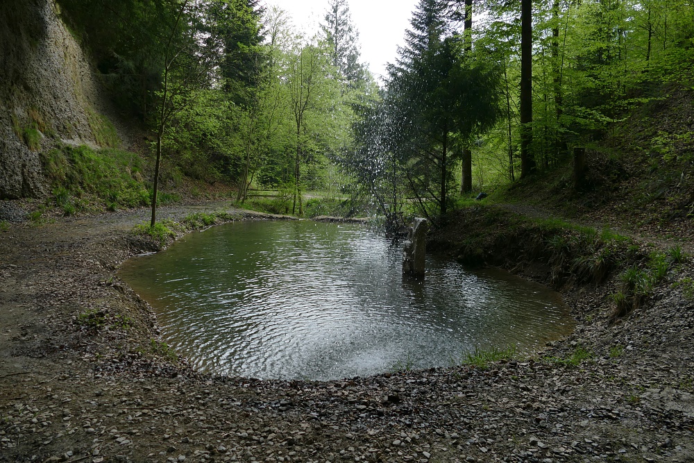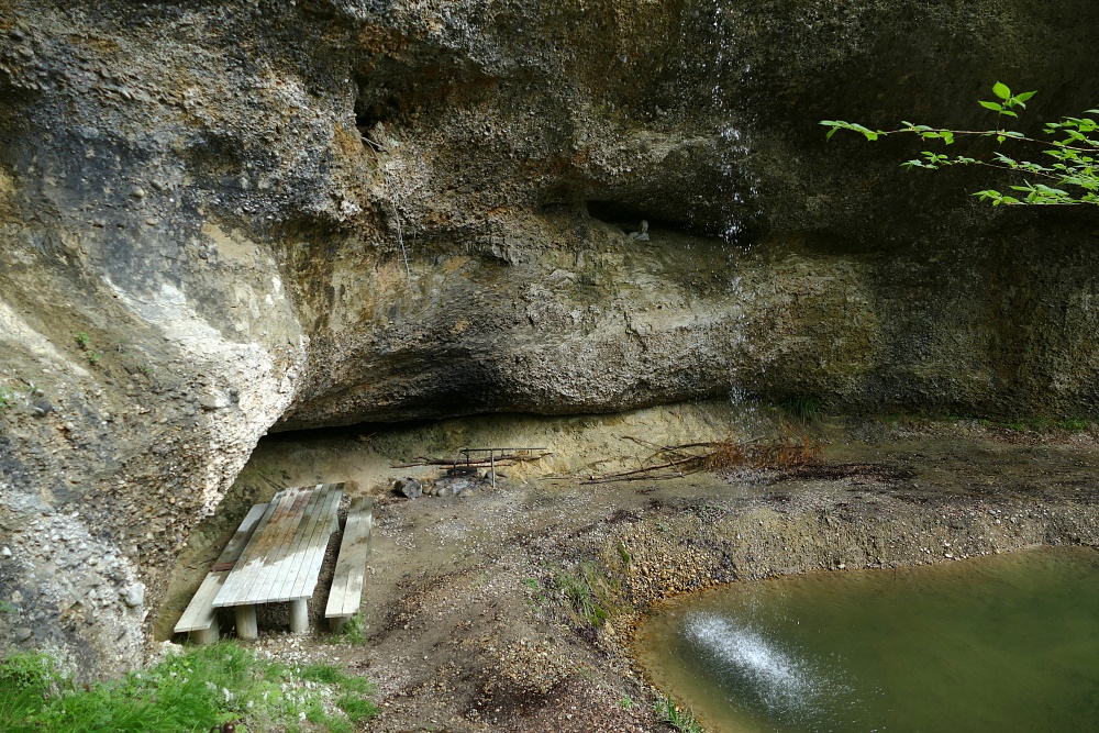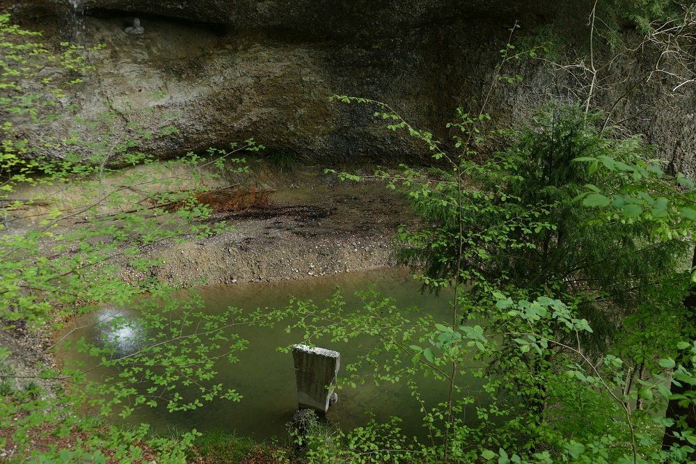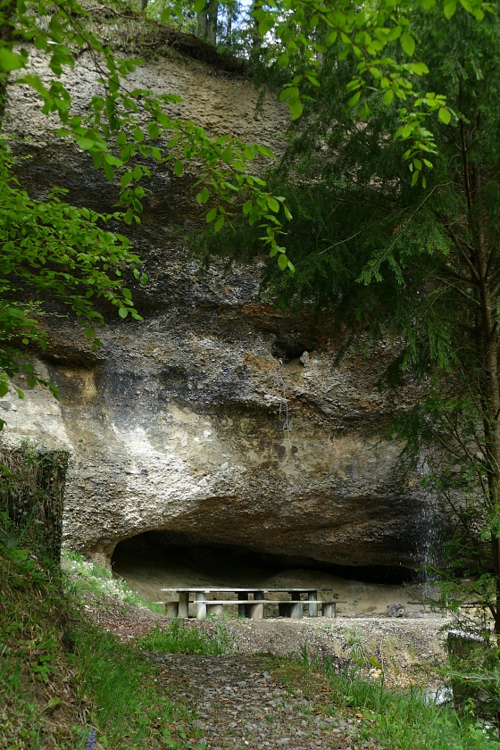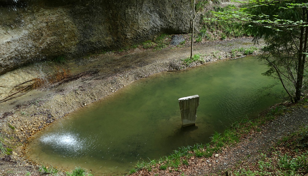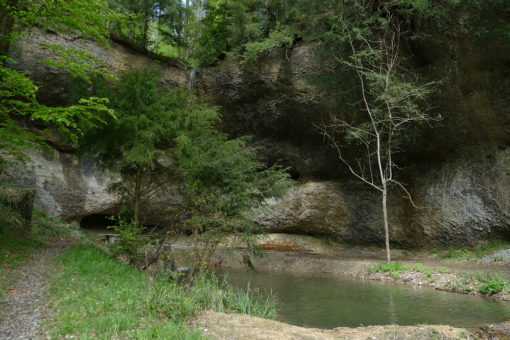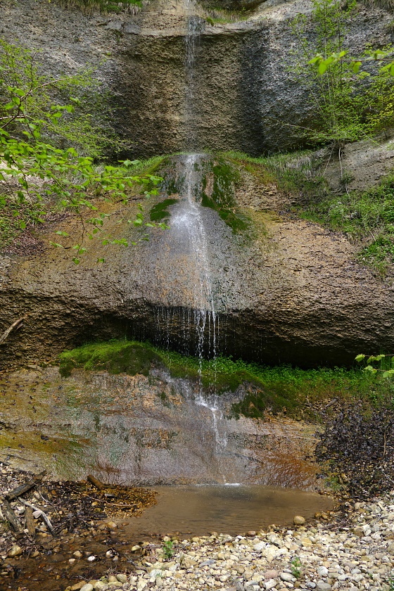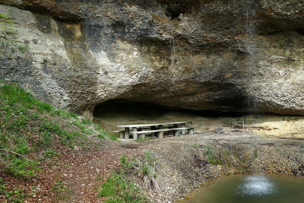 Der Wasserfall, typisch in vielen Vorgebirgen der Alpen mit Nagelfluh-Ablagerungen, bei denen sich ein Bach durch hartes Gestein, gefolgt von weicheren Ablagerungen hindurcharbeiten muss. Dabei bildet sich immer eine mehr oder weniger geräumige Höhlung.