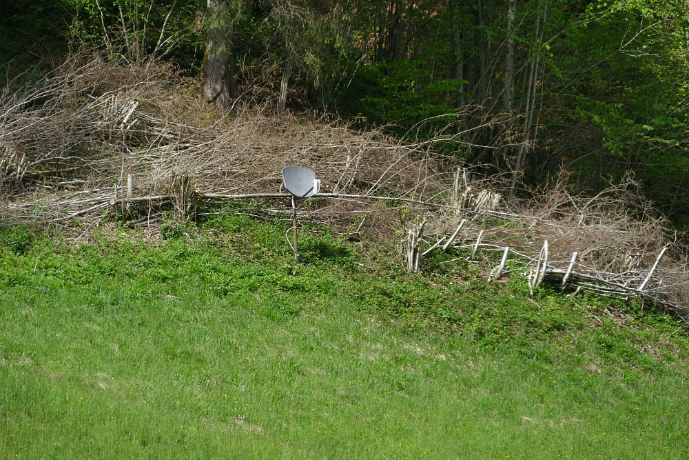 Da es sich um ein tief eingeschnittenes Tal handelt, kann man die Satellitenschüssel nicht einfach auf dem Dach installieren, sondern muss sich dafür einen etwas erhöhten und soweit nördlich wie möglich gelegenen Standort auswählen. Hier etwa 30 m vom Gebäude entfernt am Waldrand. Der geostationäre Orbit des Fernsehsatelliten erfordert eine ungehinderte Sicht in Richtung von etwas über 40 Grad und damit doch recht schräg.