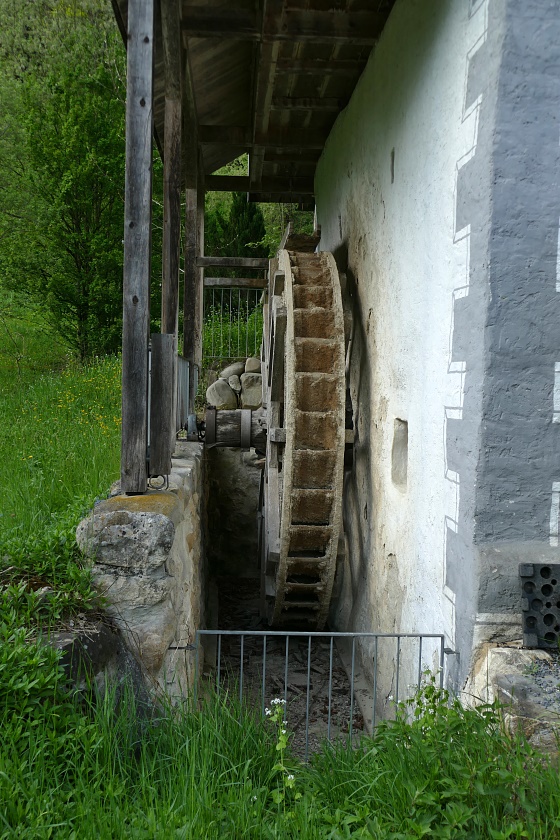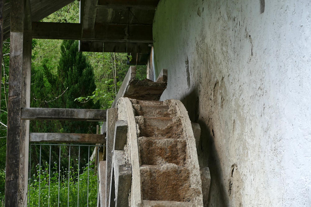 Altes Mühenrad bei Widacher (Fontannen-Mühle). Die mineralischen Ablagerungen zeugen von langem Gebrauch.