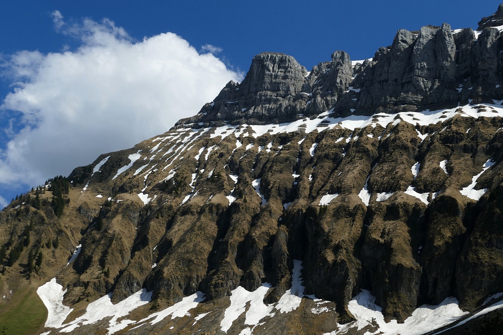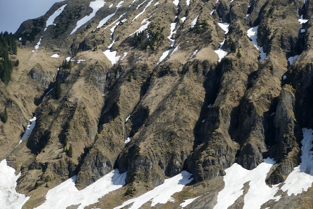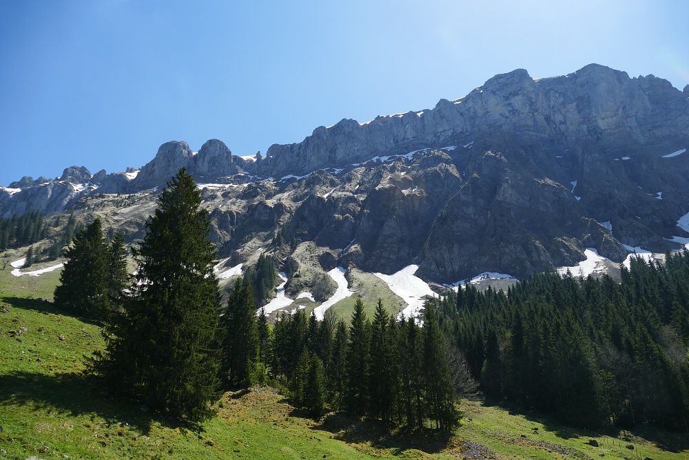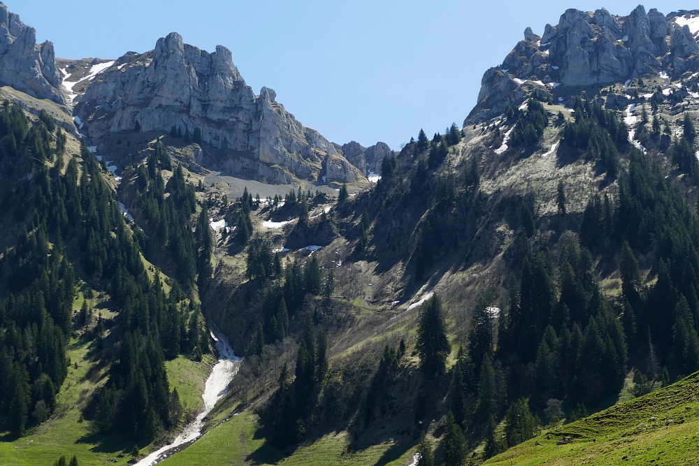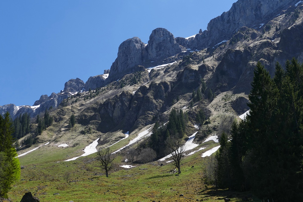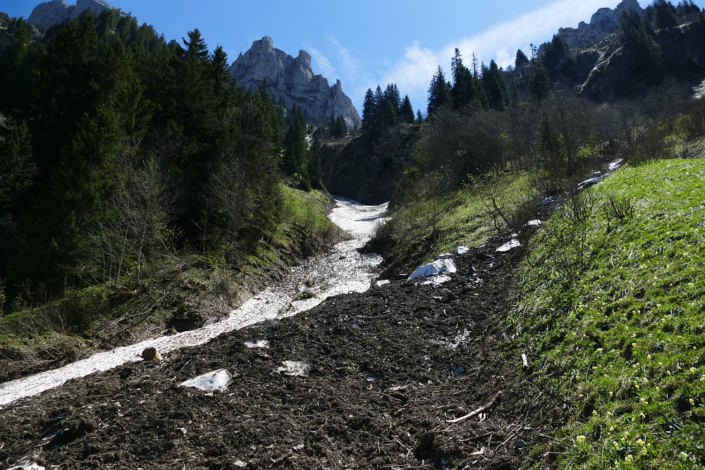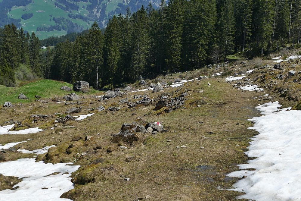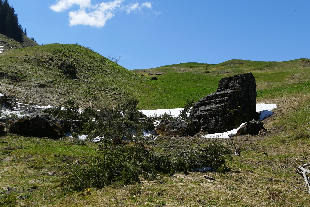 Nun biege ich nach Osten ab und nehme den Wanderweg am Fuß des Hohgant entlang. Immer wieder liegen in Rinnen noch Schneereste, aber auch immer wieder sind die Folgen abgegangener Lawinen zu sehen: ab- oder umgeknickte Bäumchen, murenähnliche Abgänge, von den Lawinen mitgerissene oder mitgeführte Erdklumpen oder Grasnarben.