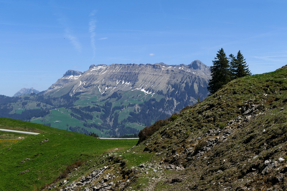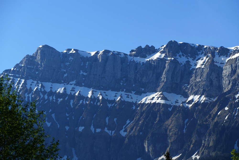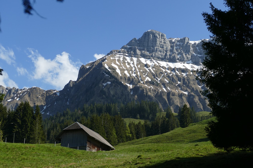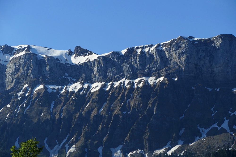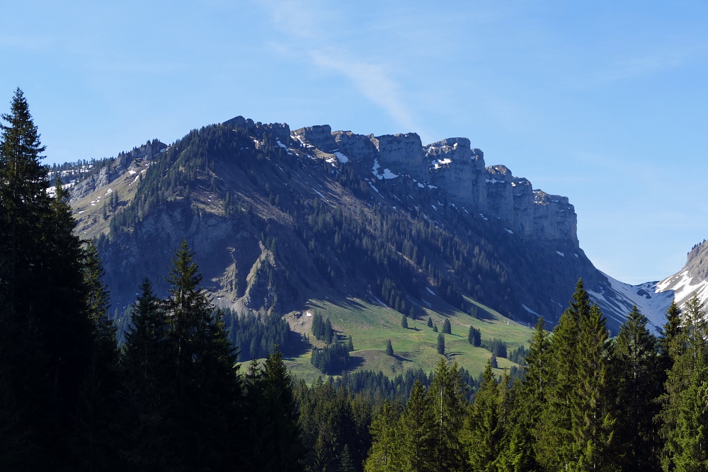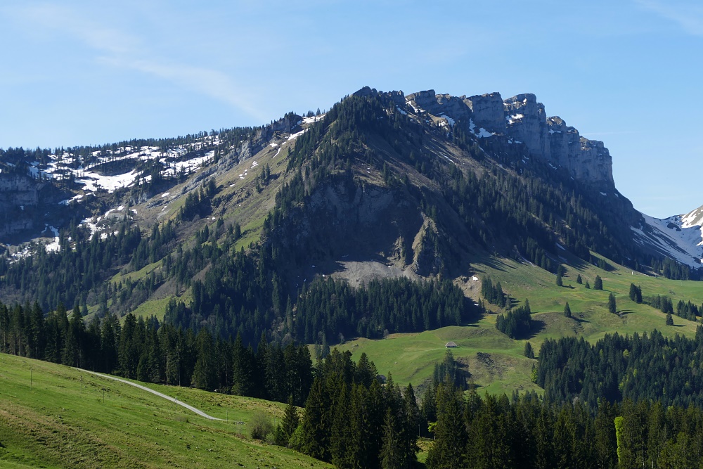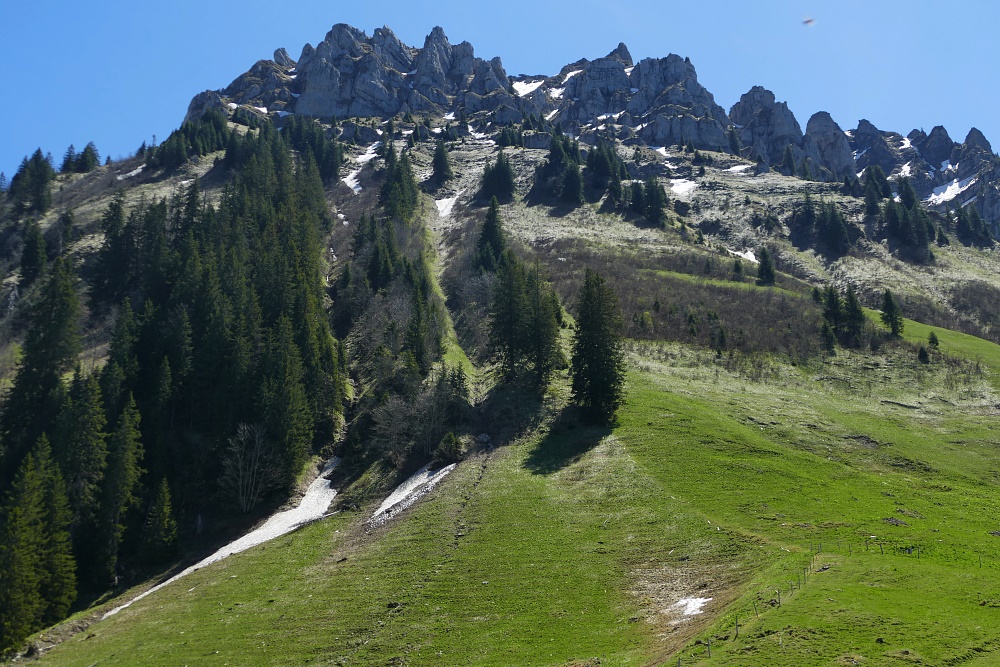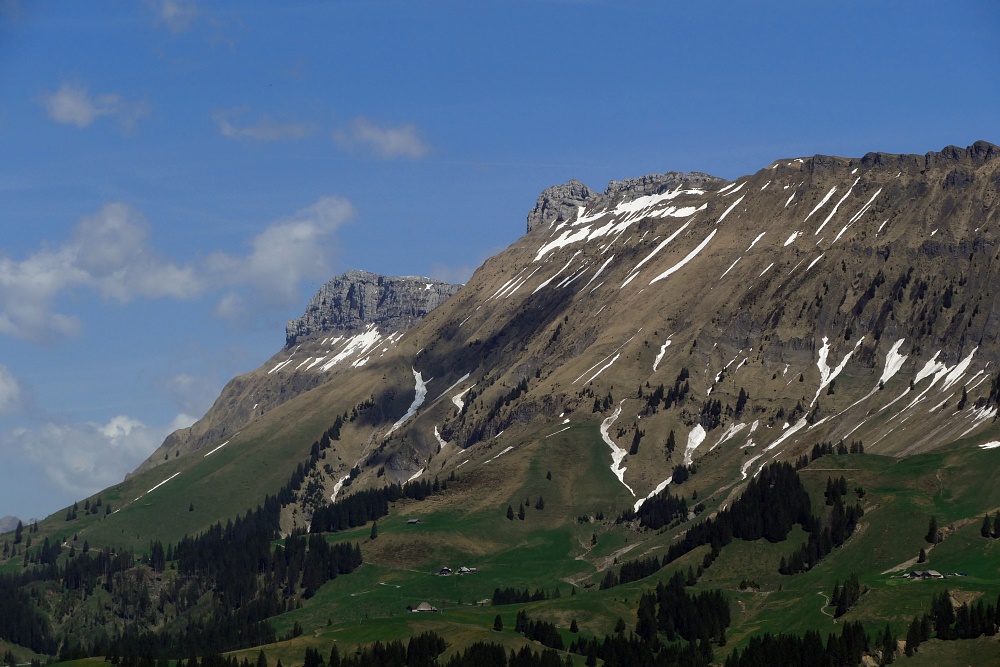 Nun biege ich nach Osten ab und nehme den Wanderweg am Fuß des Hohgant entlang. Immer wieder liegen in Rinnen noch Schneereste, aber auch immer wieder sind die Folgen abgegangener Lawinen zu sehen: ab- oder umgeknickte Bäumchen, murenähnliche Abgänge, von den Lawinen mitgerissene oder mitgeführte Erdklumpen oder Grasnarben.