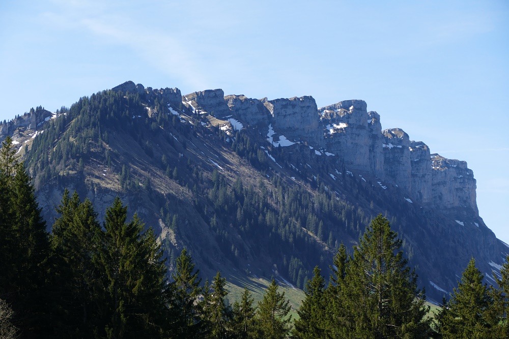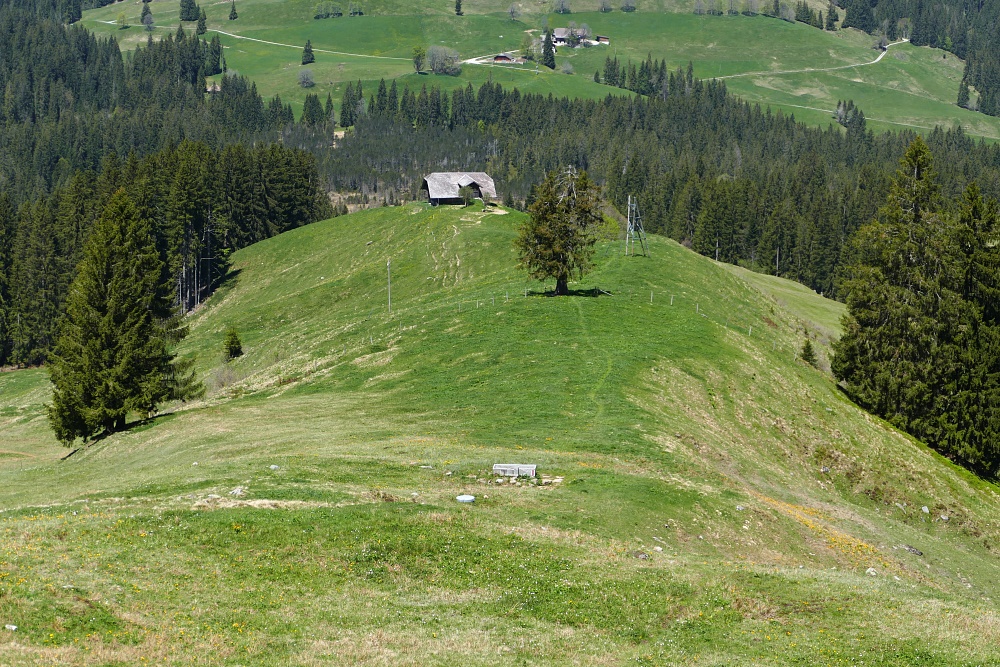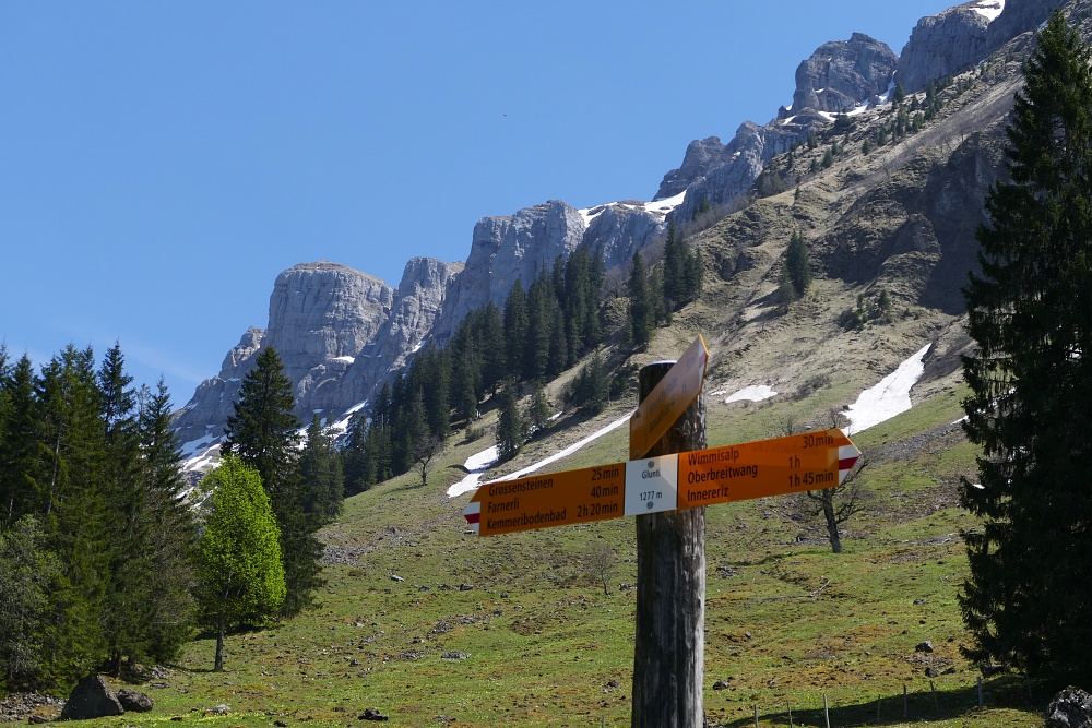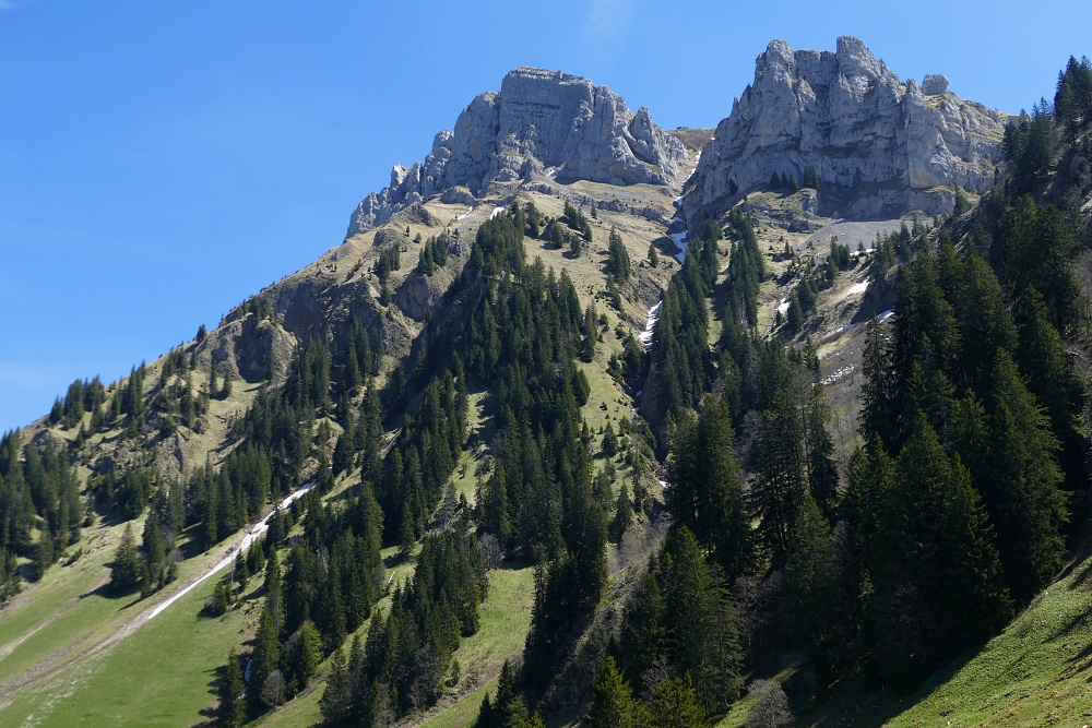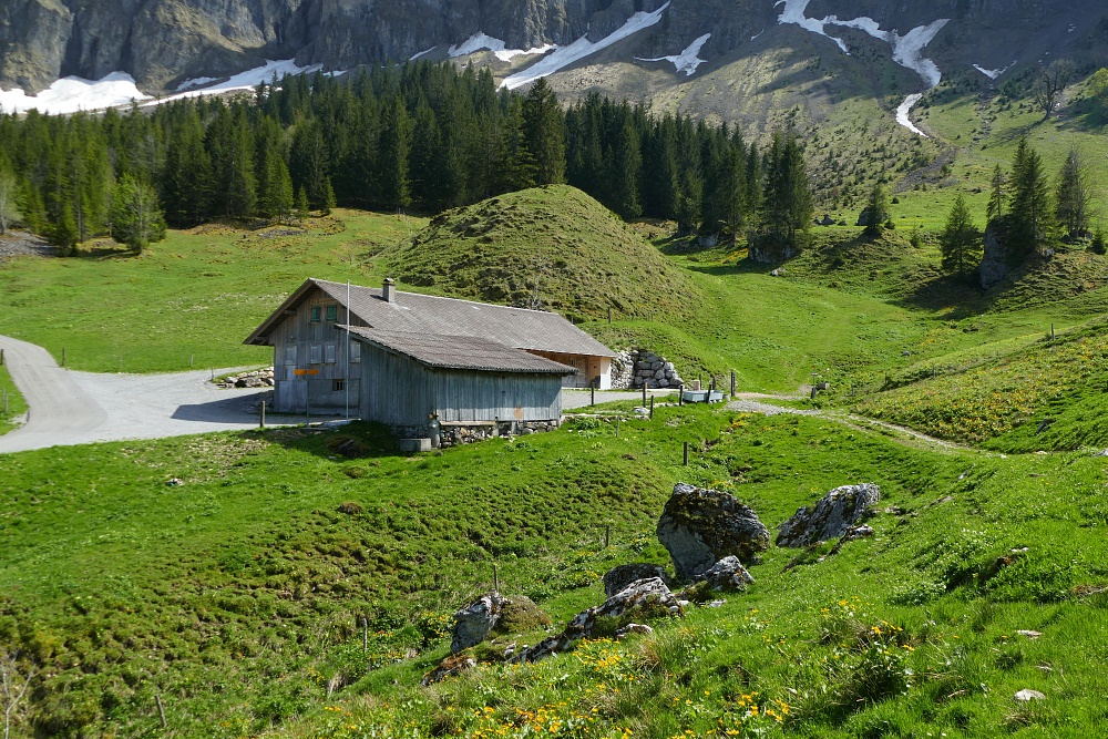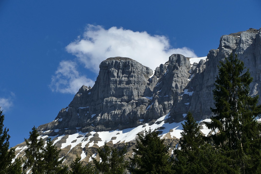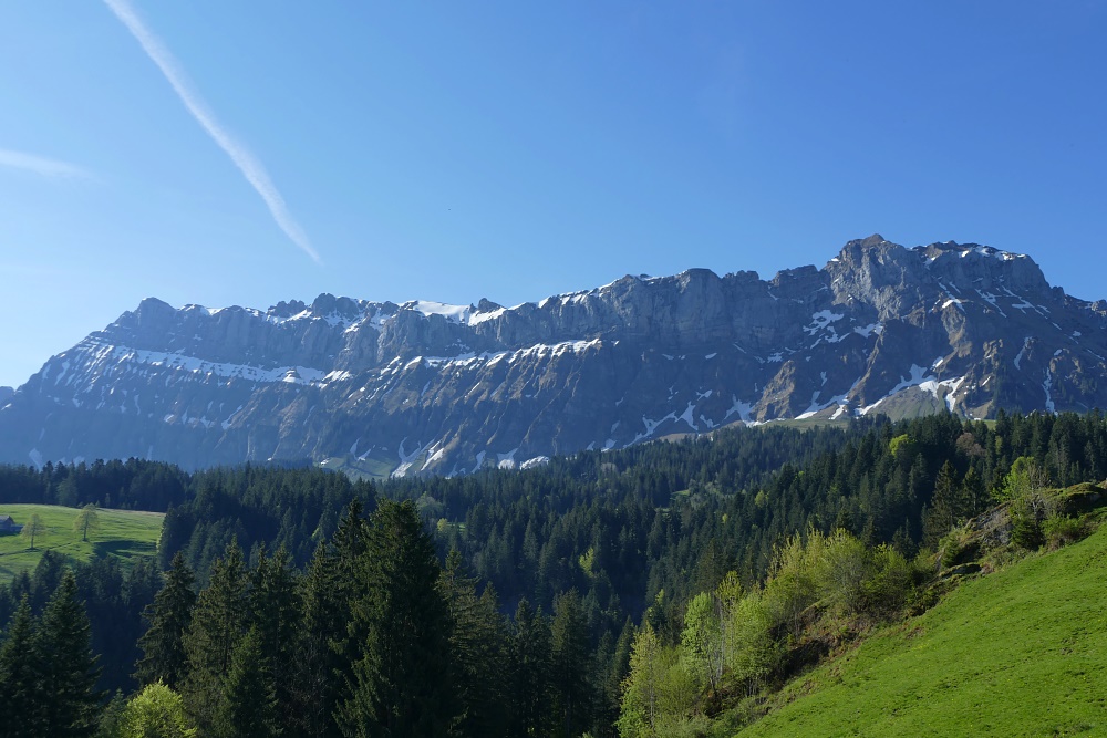 Nun biege ich nach Osten ab und nehme den Wanderweg am Fuß des Hohgant entlang. Immer wieder liegen in Rinnen noch Schneereste, aber auch immer wieder sind die Folgen abgegangener Lawinen zu sehen: ab- oder umgeknickte Bäumchen, murenähnliche Abgänge, von den Lawinen mitgerissene oder mitgeführte Erdklumpen oder Grasnarben.