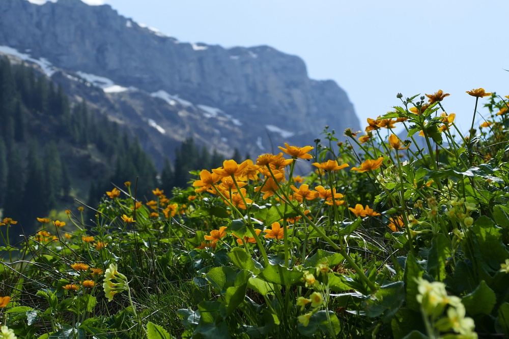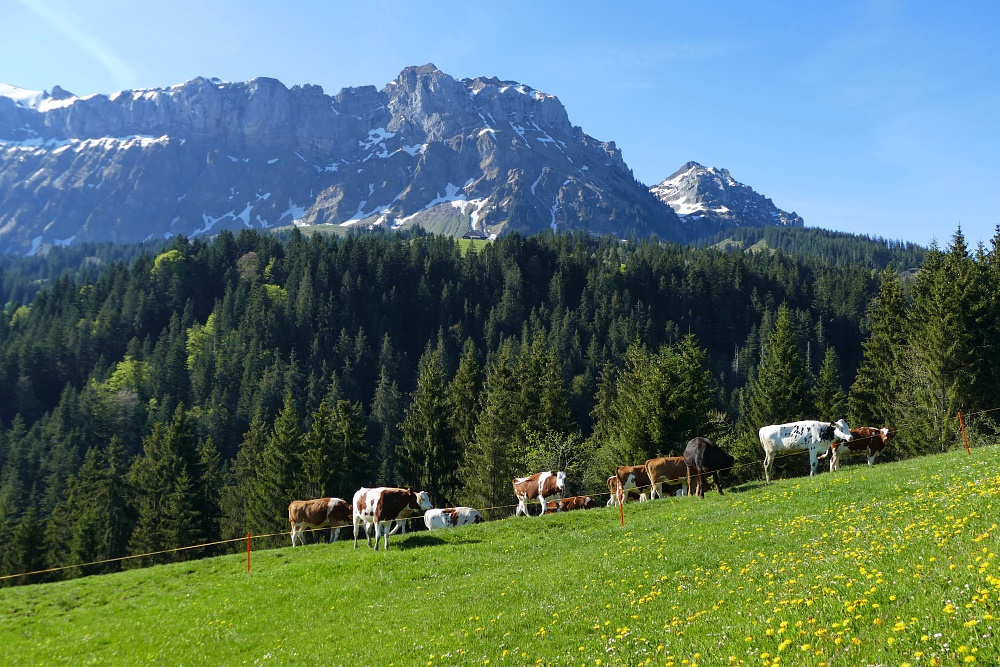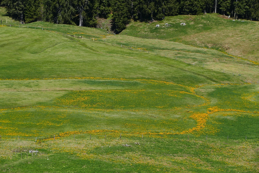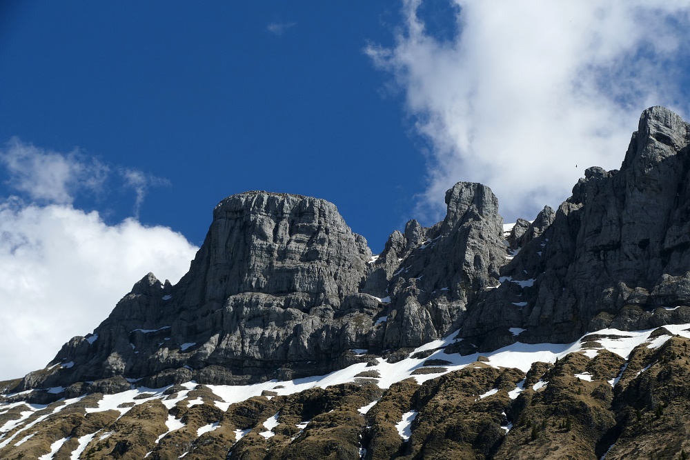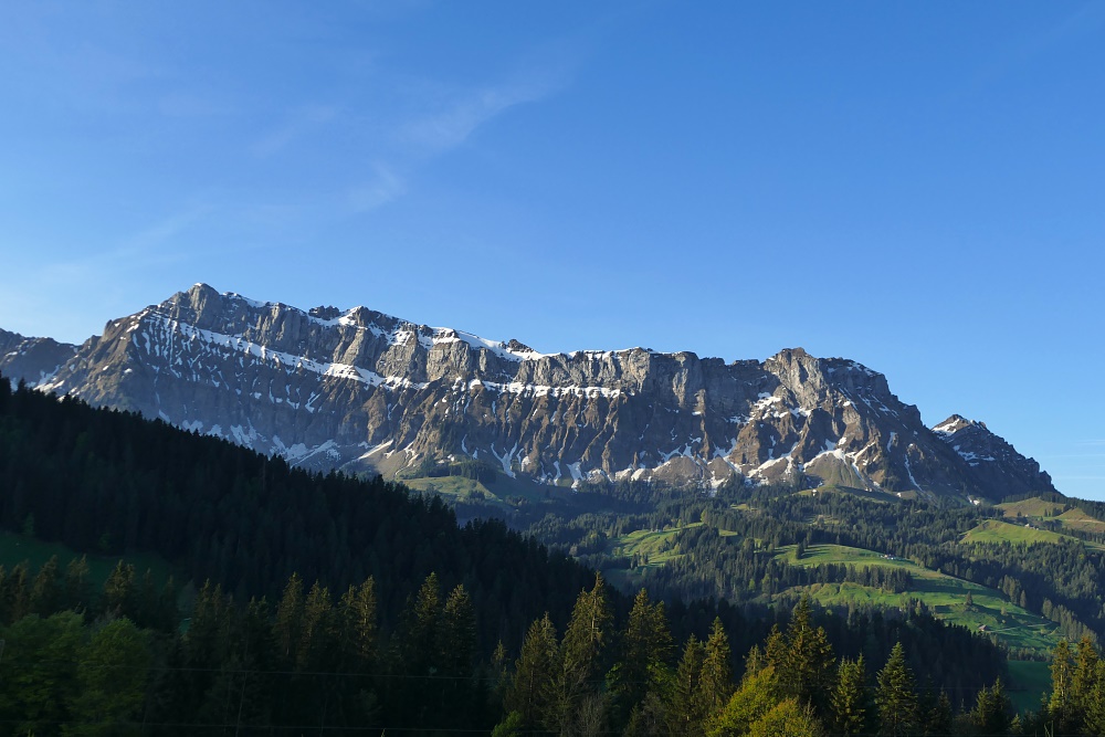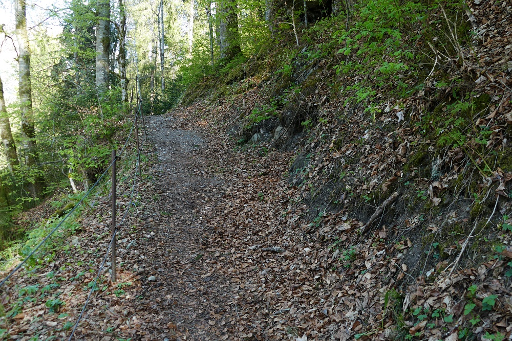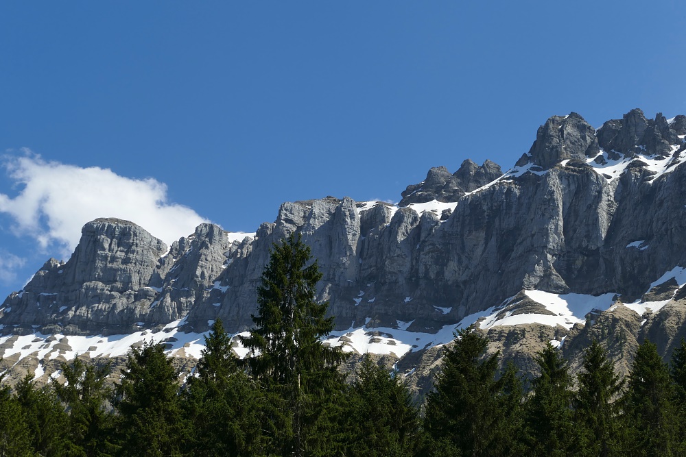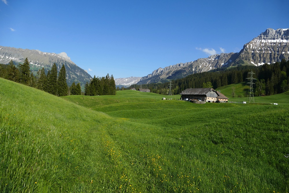 Nun biege ich nach Osten ab und nehme den Wanderweg am Fuß des Hohgant entlang. Immer wieder liegen in Rinnen noch Schneereste, aber auch immer wieder sind die Folgen abgegangener Lawinen zu sehen: ab- oder umgeknickte Bäumchen, murenähnliche Abgänge, von den Lawinen mitgerissene oder mitgeführte Erdklumpen oder Grasnarben.