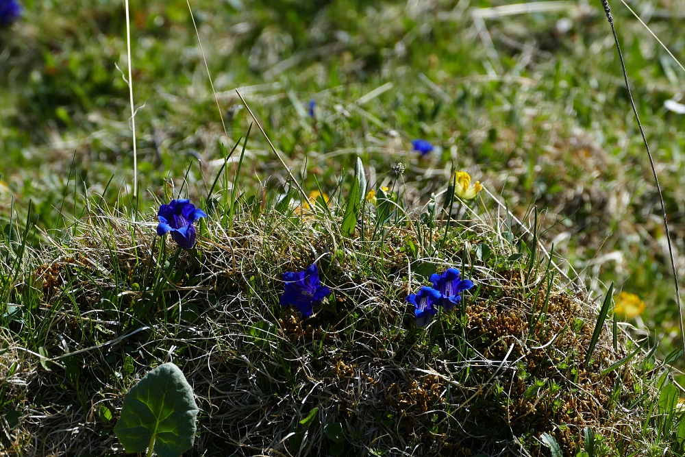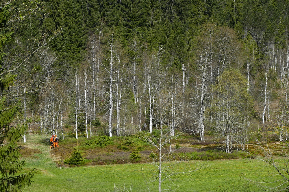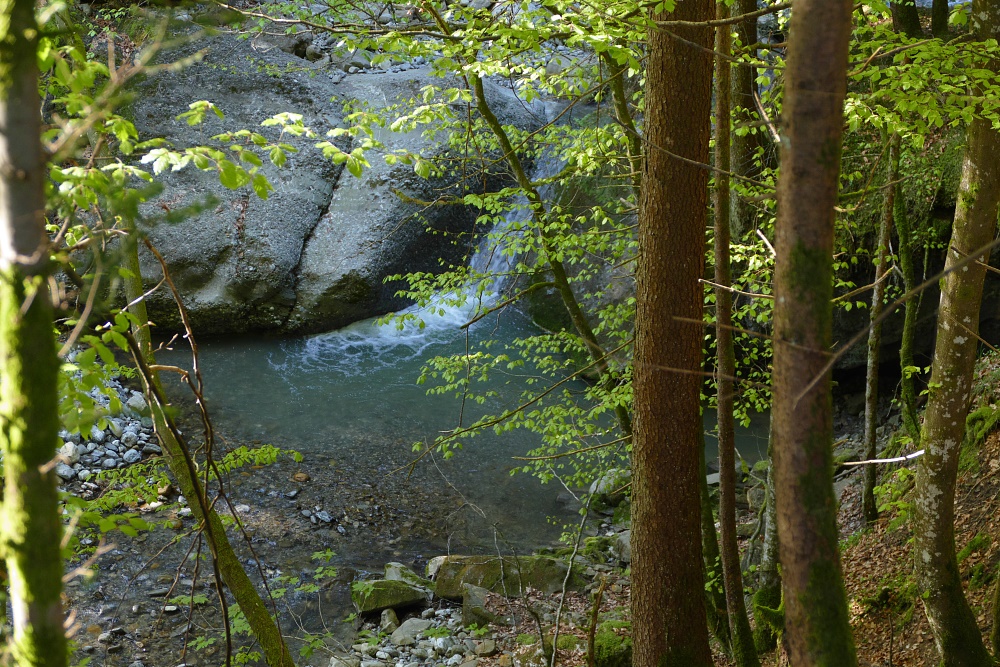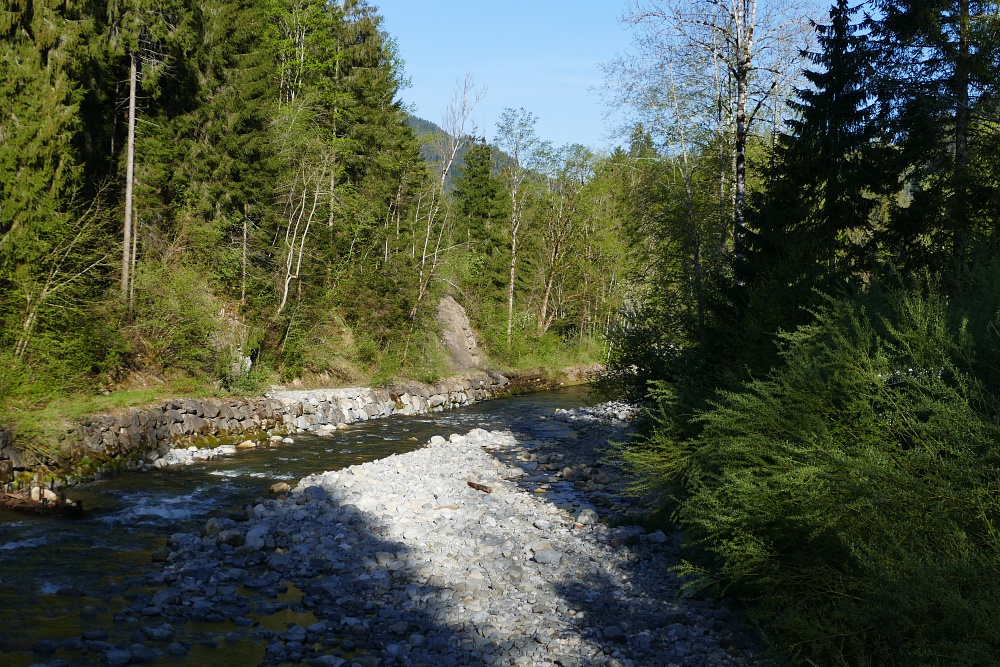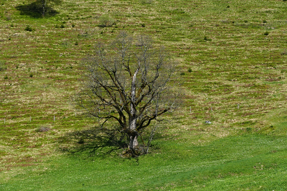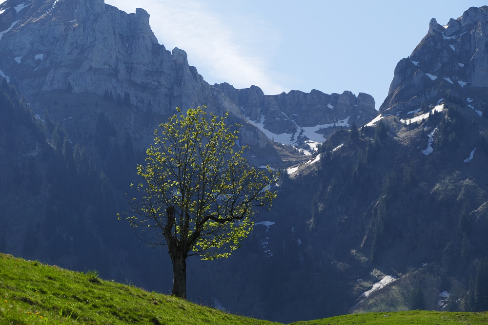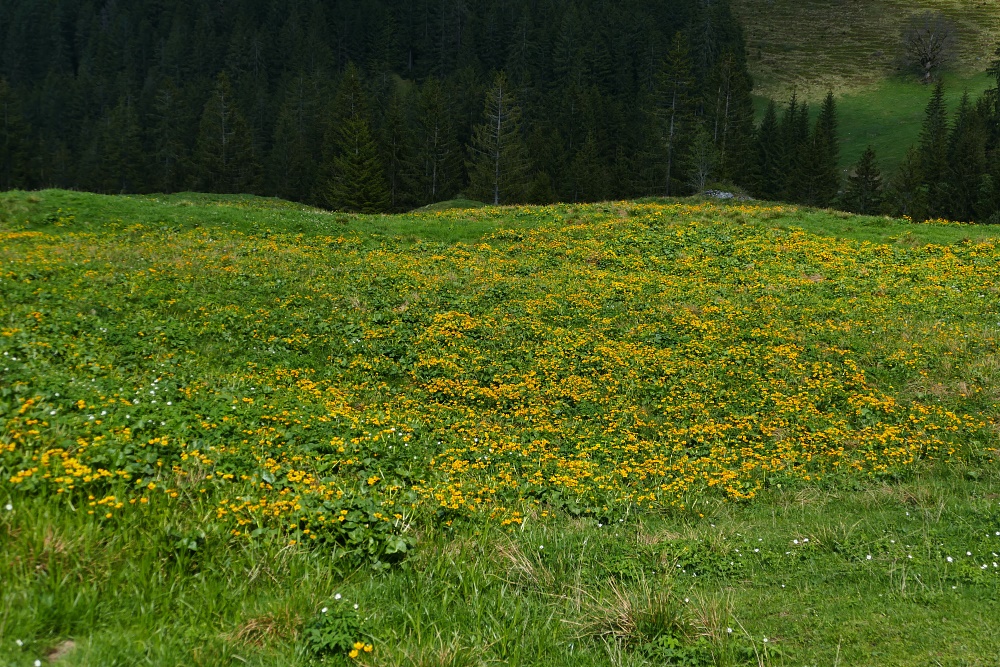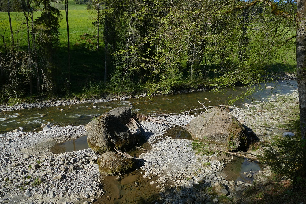 Nun biege ich nach Osten ab und nehme den Wanderweg am Fuß des Hohgant entlang. Immer wieder liegen in Rinnen noch Schneereste, aber auch immer wieder sind die Folgen abgegangener Lawinen zu sehen: ab- oder umgeknickte Bäumchen, murenähnliche Abgänge, von den Lawinen mitgerissene oder mitgeführte Erdklumpen oder Grasnarben.