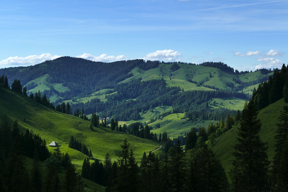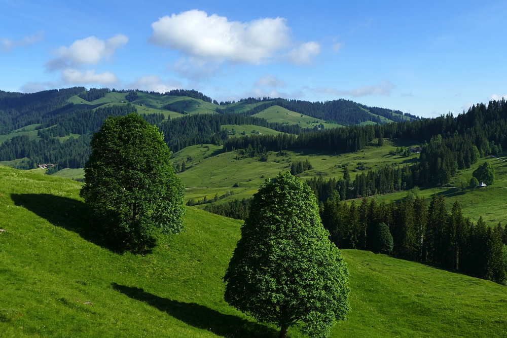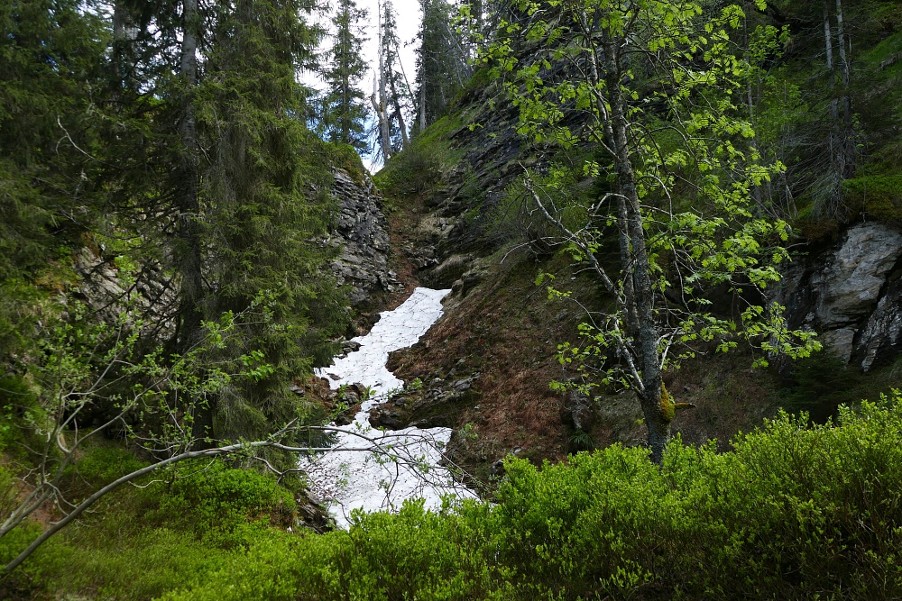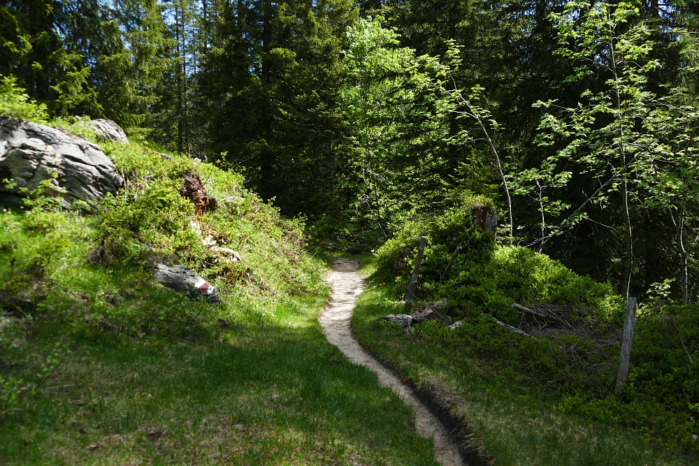 Der Weiterweg ist nun vorgegeben und gut erkennbar. Teils durch Mischwald, teils durch feuchte Freiflächen geht es nun mehr oder weniger geradeaus hinunter bis zum Grüneberg. Dort macht der Weg einen leichten Schlenker nach rechts, um dann bei Chänuchehr auf den bereits im Aufstieg begangenen Ziehweg zu stoßen.