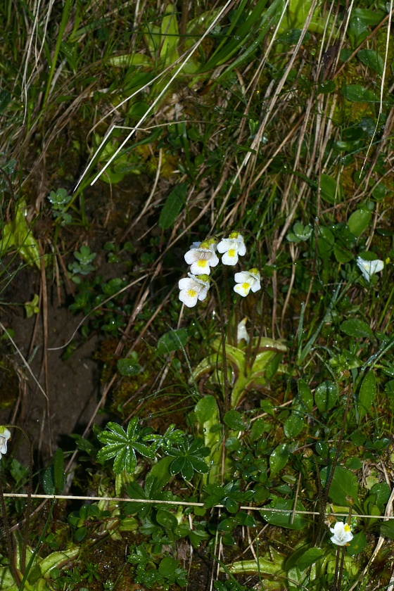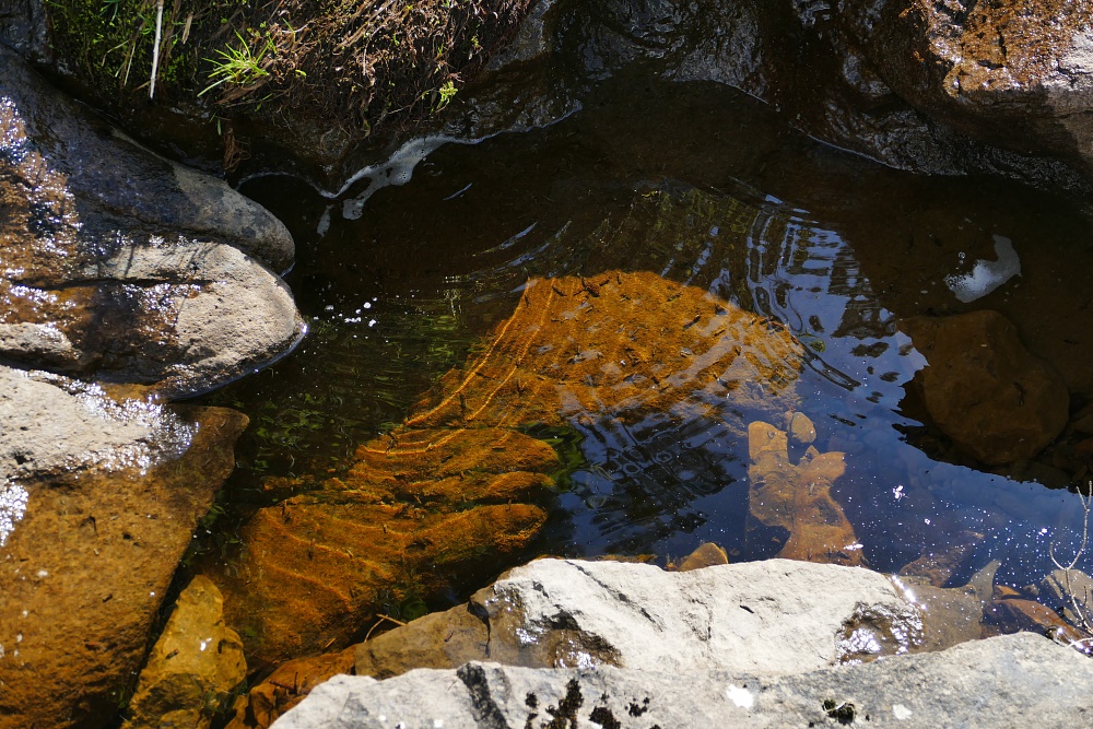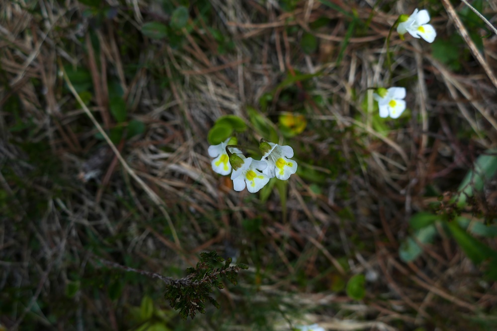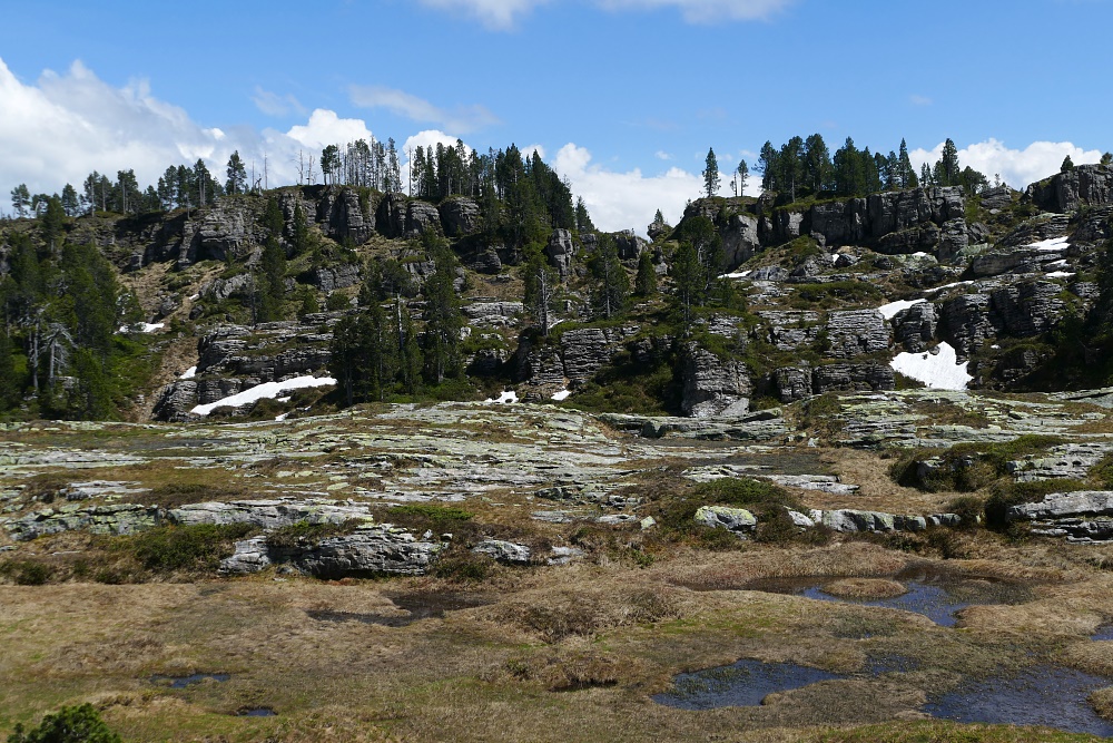 Blick hinunter auf eine Moorlangschaft, zu der ich eigentlich absteigen will. Aber eine geeignete Stelle finde ich nicht. So wende ich mich nach Westen, wo eine leichte Spur erkennbar ist. Diese hört aber nach einiger Zeit bei einem Aussichtspunkt auf. Von dort aus liegt die angestrebte Ebene ausgebreitet vor mir und ich muss nur noch einen steile Felsstufe überwinden um hinunterzugelangen.