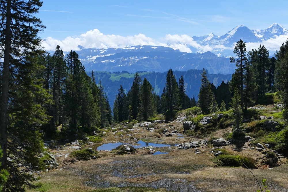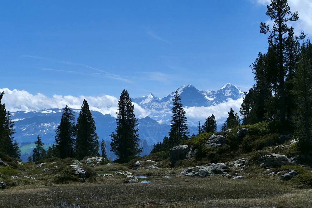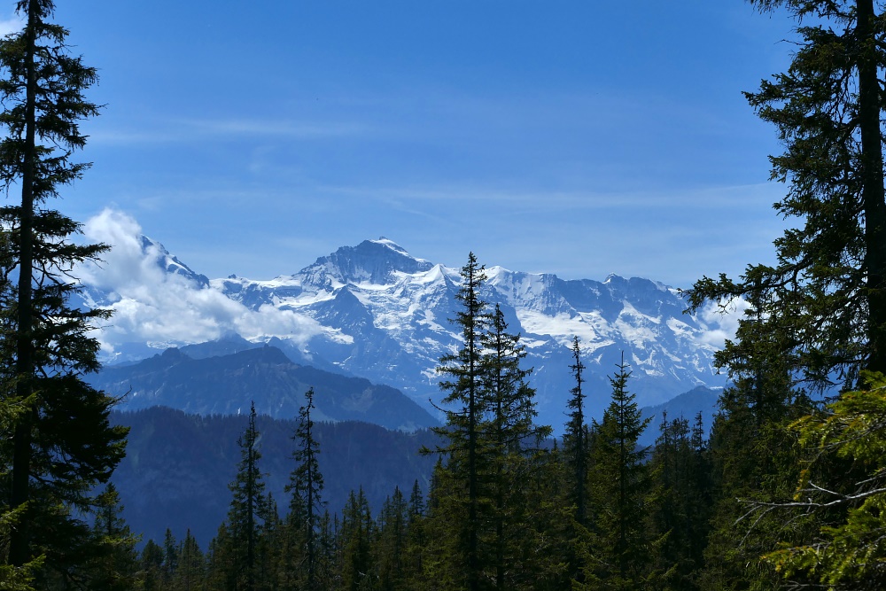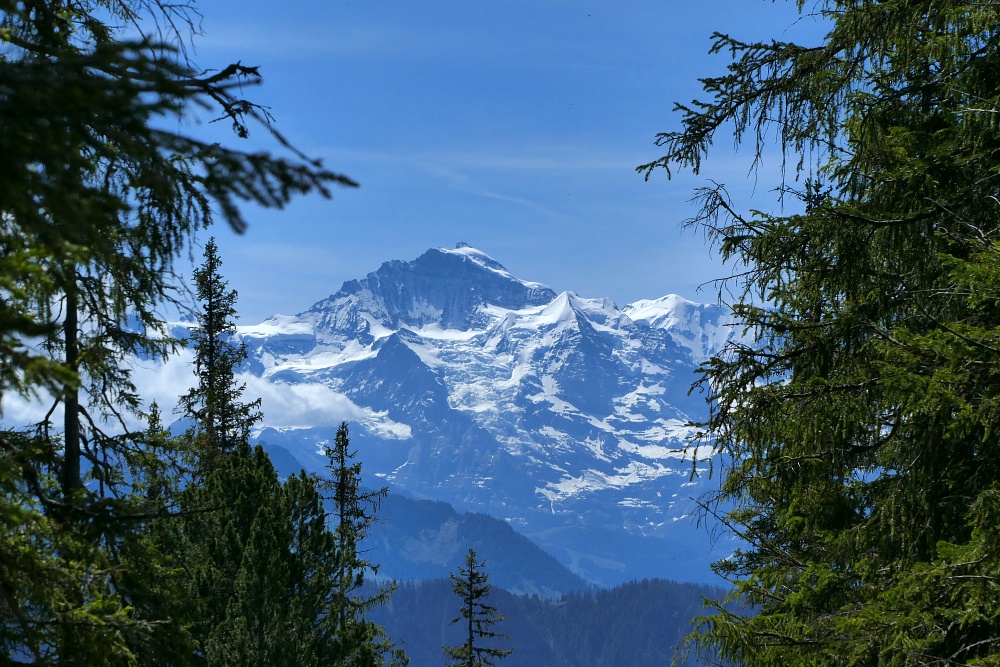 Nur selten gibt der lockere Bewuchs den Blick auf die Umgebung frei - dann aber ist er überwältigend! Hier flankiert von Bäumen der majestätische Gipfel der Jungfrau (4158 m)