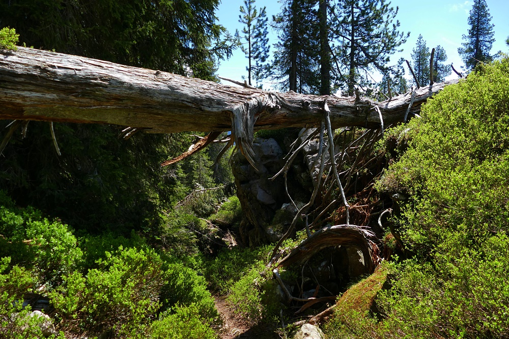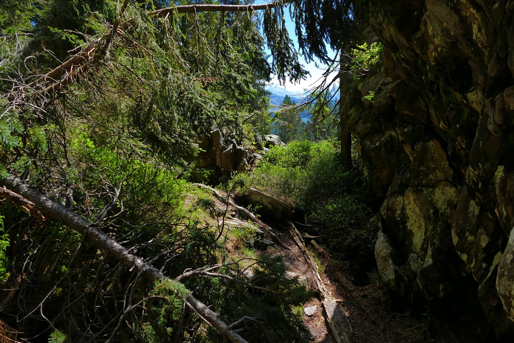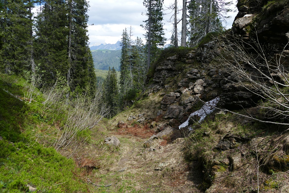 Langsam beginnt sich auch eine Abstiegsspur herauszuschälen. Ich atme etwas auf. Nachträglich stellt sich heraus, dass meine Wegstrecke ab der Ebene fast genau dem zum Beispiel in der "Reit- und Wanderkarte" eingezeichneten Pfad entspricht.