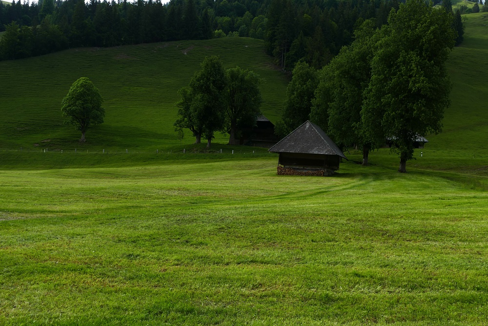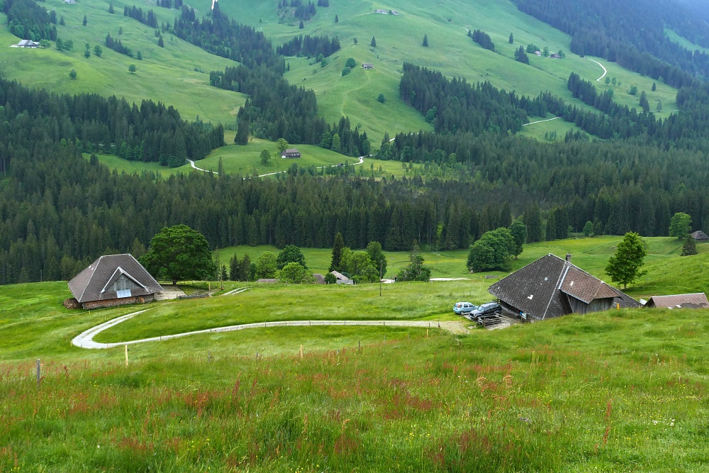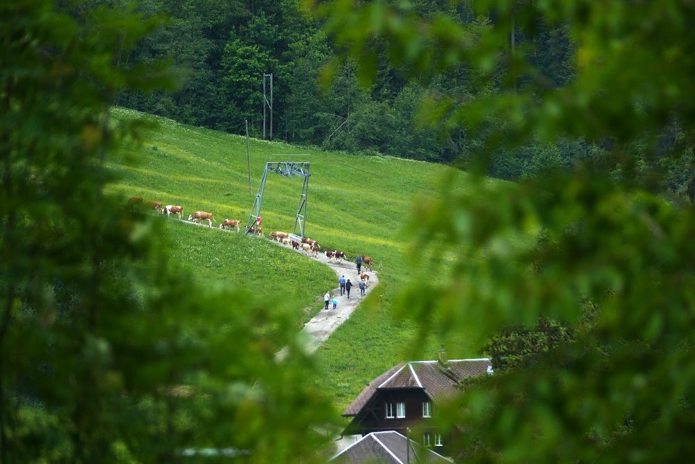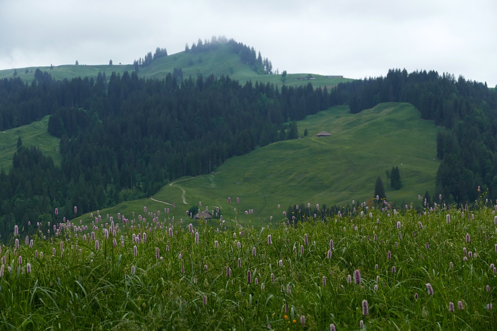 Der heutige Tag beginnt mit Grau in Grau vermischt mit ein paar Wassertröpfchen. So nehme ich mir eine gemütliche Tour vor und wähle als Ziel die Honegg-Runde aus. Gleich hinter meiner BnB-Unterkunft führt ein steiler Weg empor. Glockengebimmle begleitet mich und bald stelle ich die Ursache dafür fest: Es ist der Alpauftrieb Richtung Rotmoos, der an diesem Tag stattfindet.