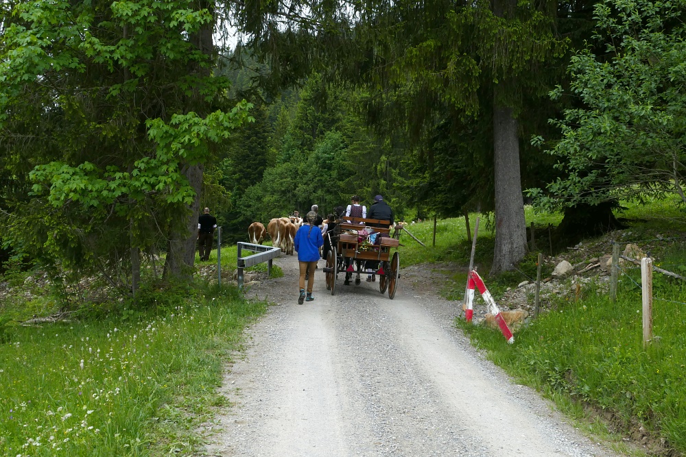 Als ich auf dem Ziehweg bei etwa 1200 m angekommen bin, erreiche ich gerade noch das Ende des Viehauftriebes mit der Kutsche.
