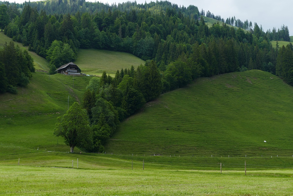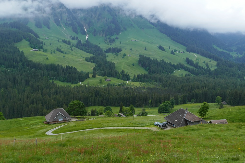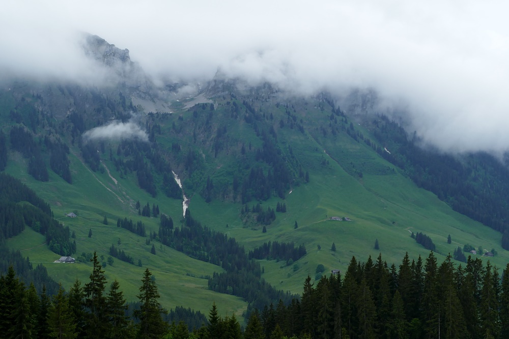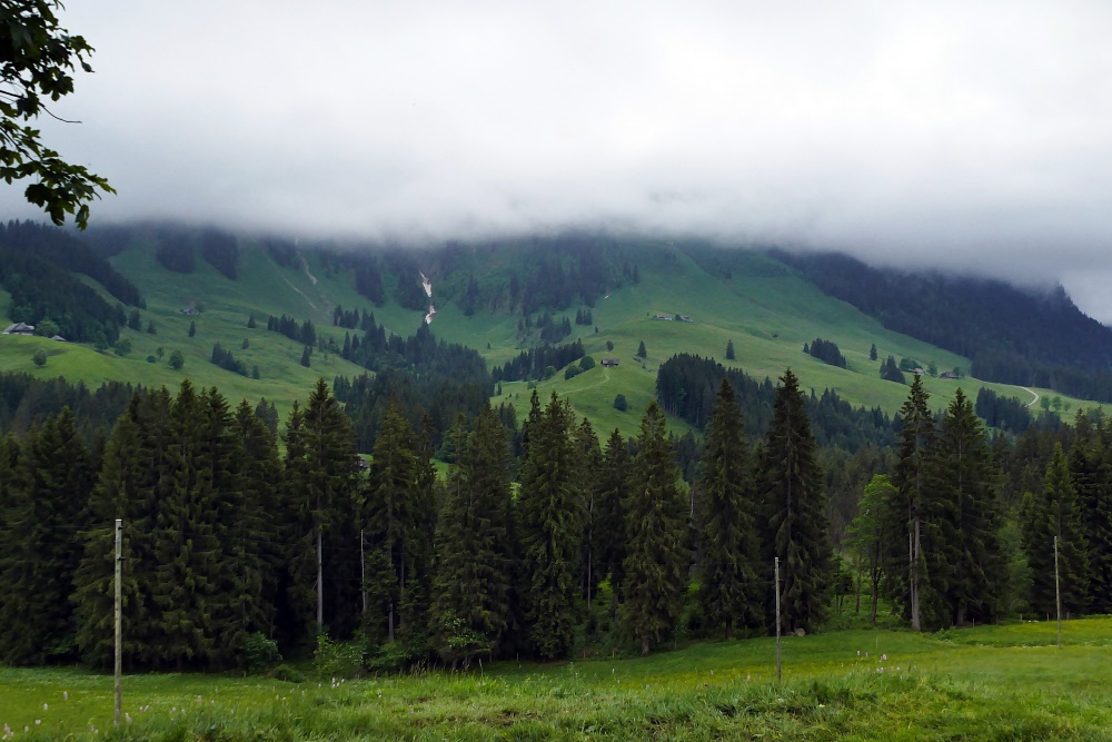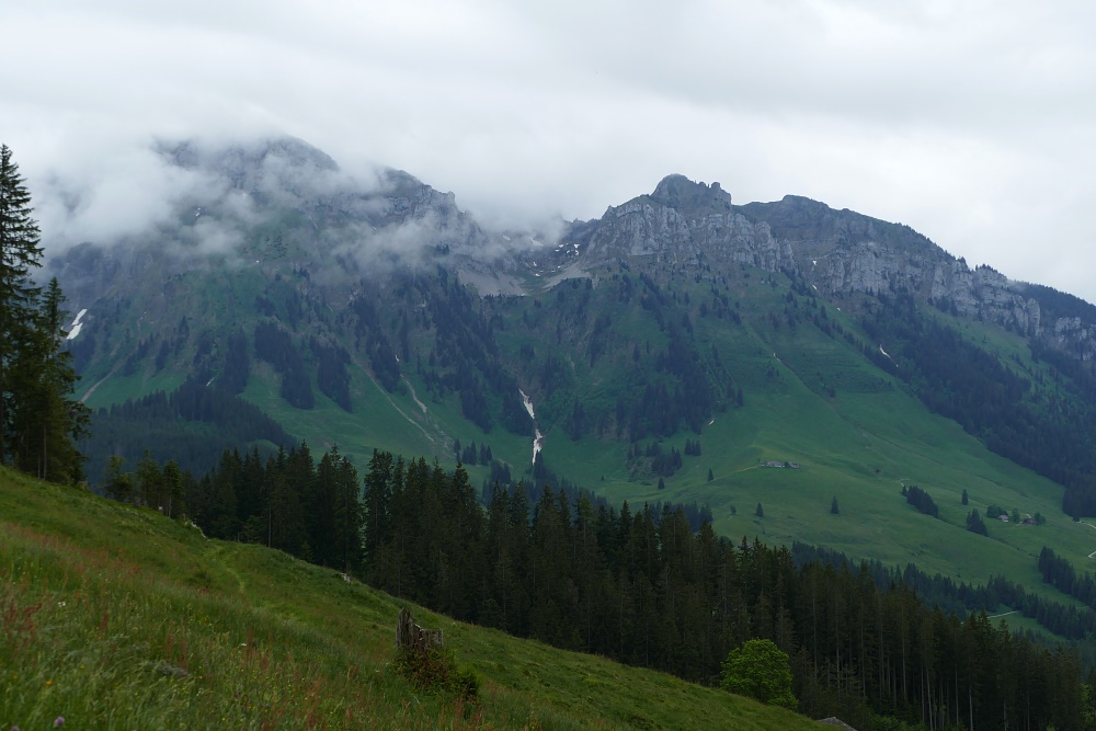 Der Hohgant ist zu diesem Zeitpunkt fast gänzlich in Nebel gehüllt; nur die Breitwang ist auf ihrem Hügel gut zu erkennen.