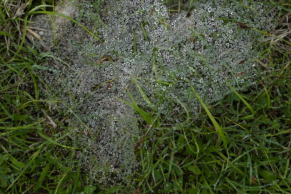 Auch hier oben hängen die Wassertropfen noch unangetastet in den bodennahen Fangnetzen der Spinnen