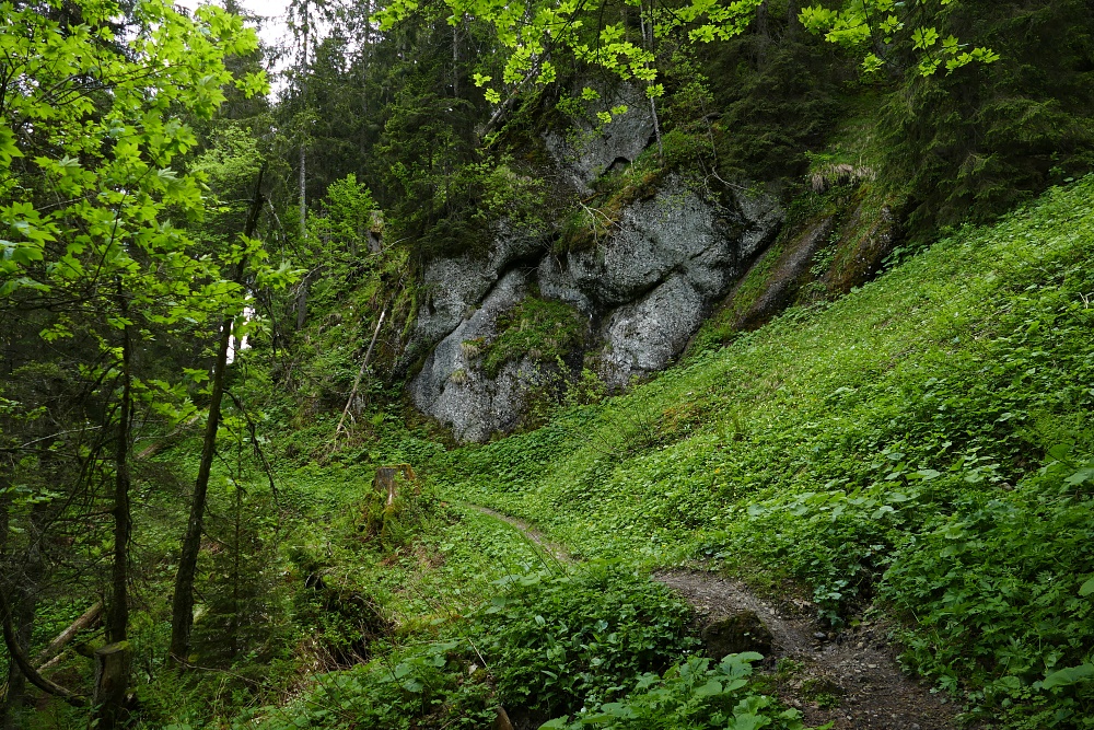 vorbei an einer Felsplatte