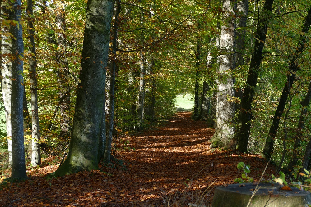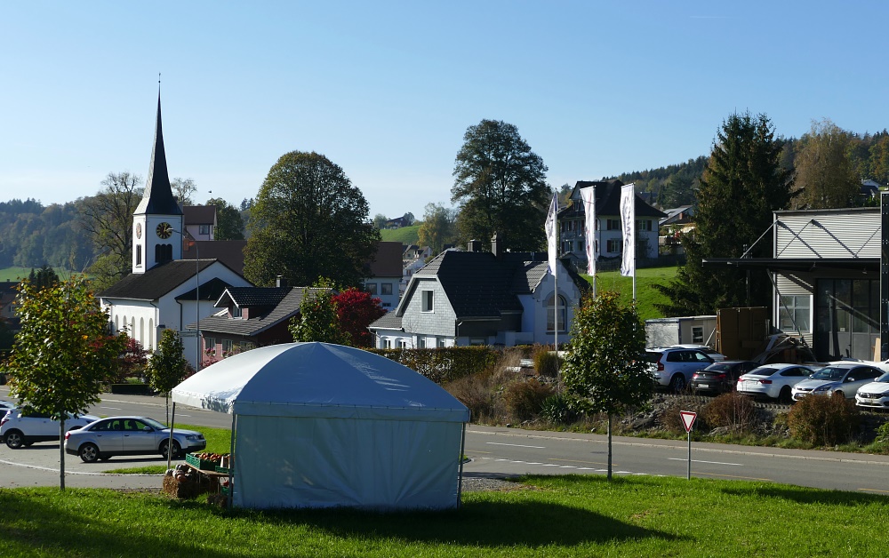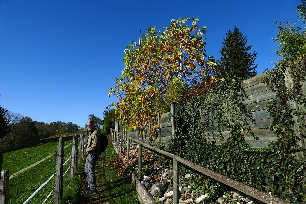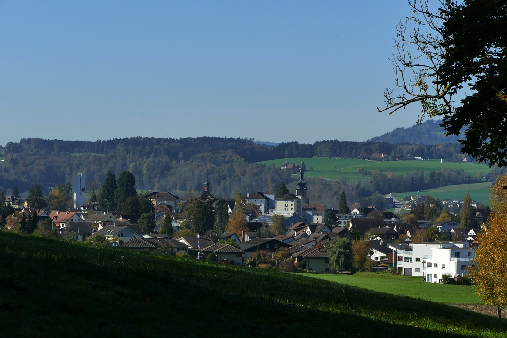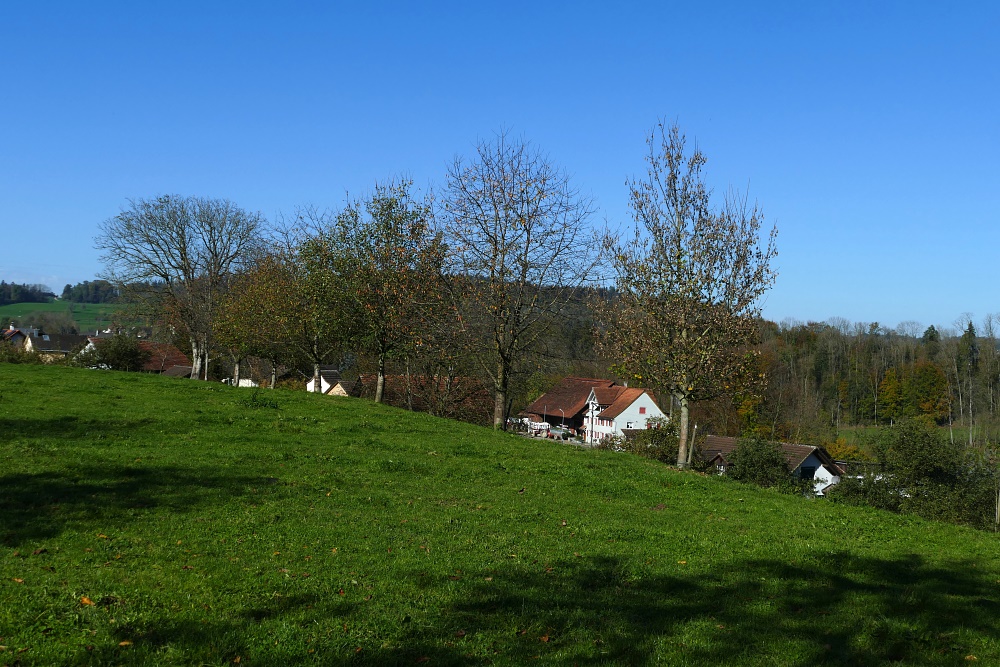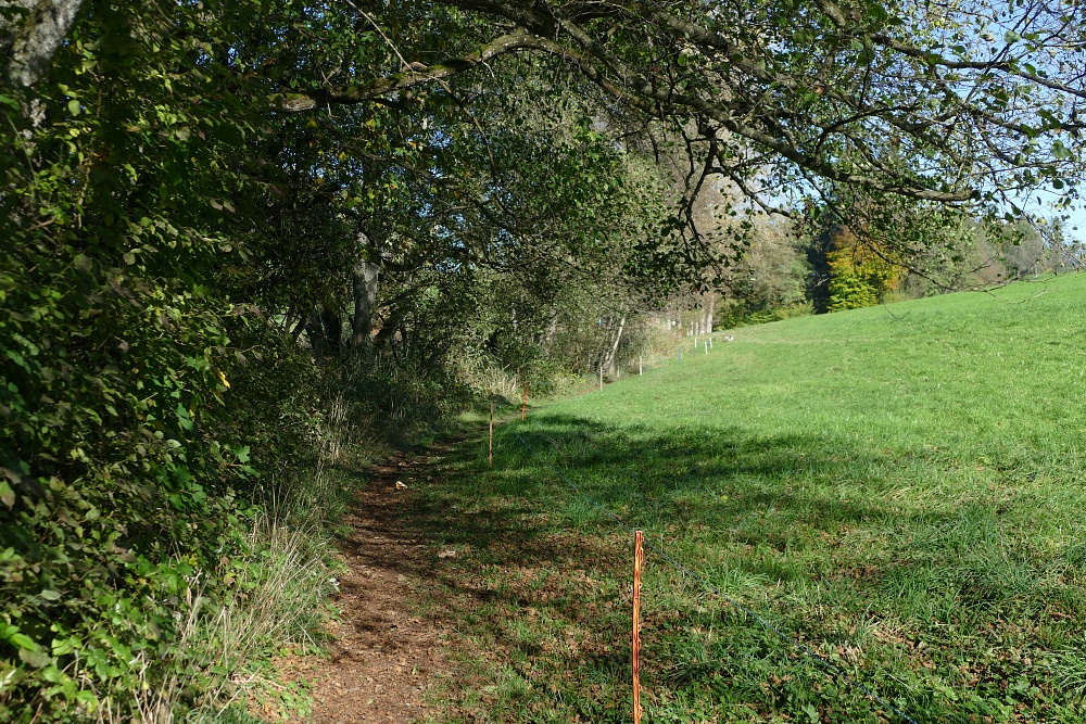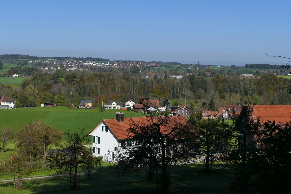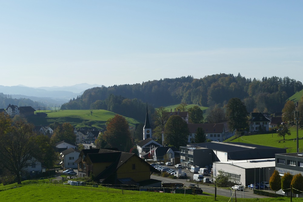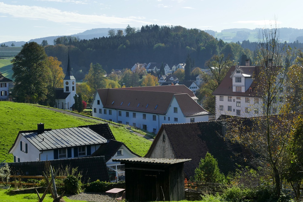 Wir marschieren durch das Wahrzeichen Hauptwils, bleiben kurz auf der Teerstraße und biegen danach links ab, wo ein Wanderweg direkt in Verlängerung der Rebhusstraße unterhalb der Siedlung am Hang entlangführt.