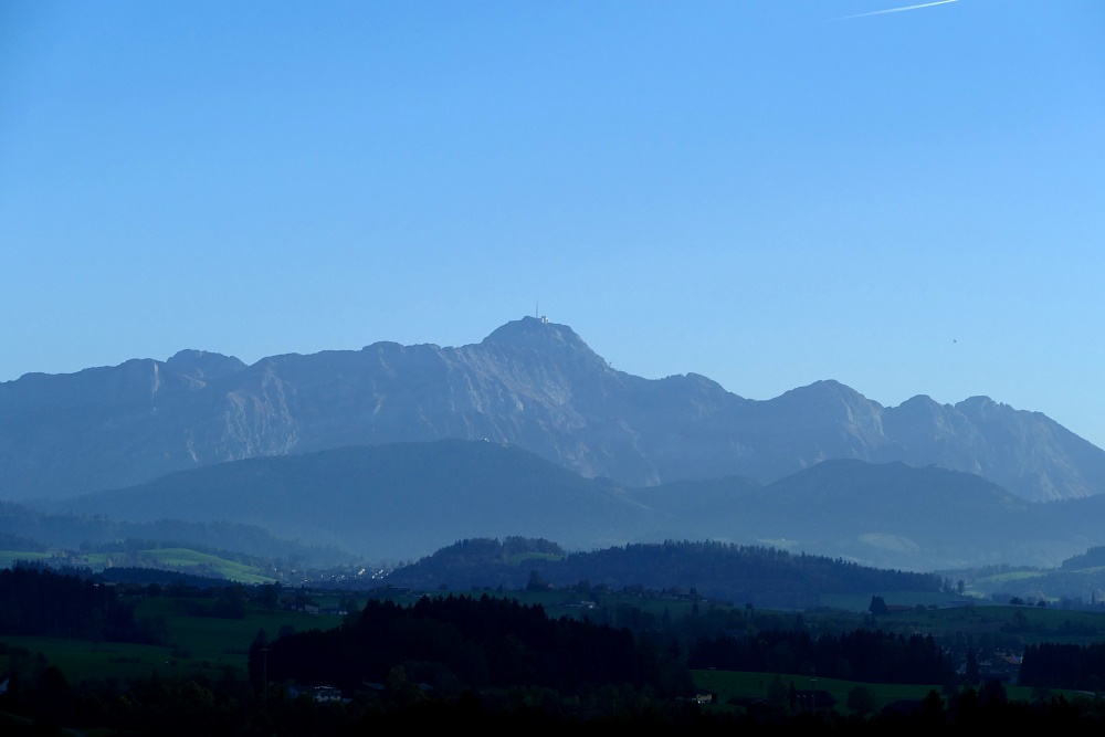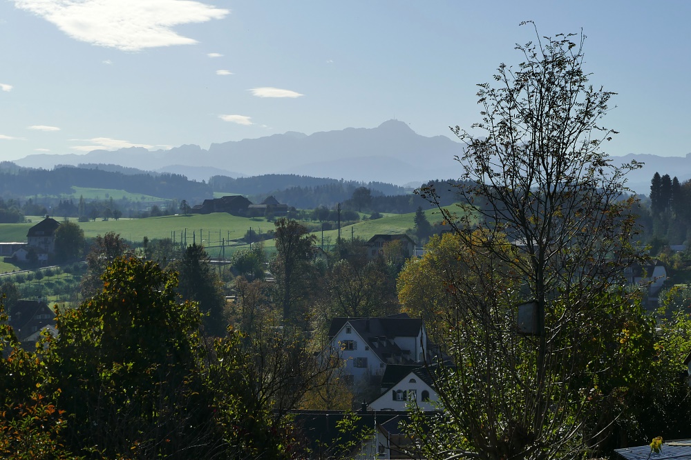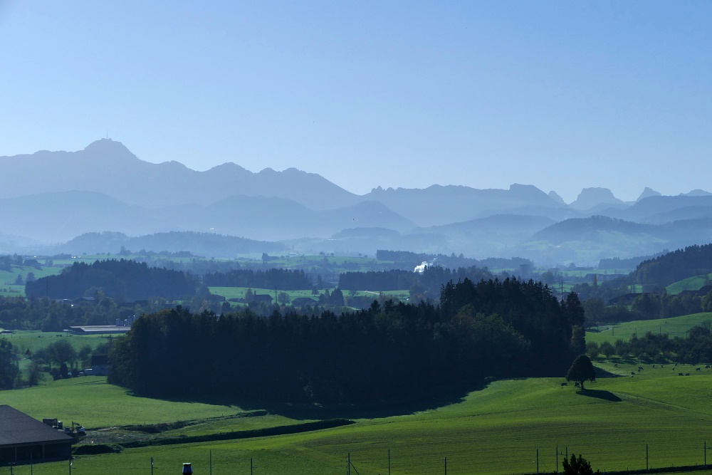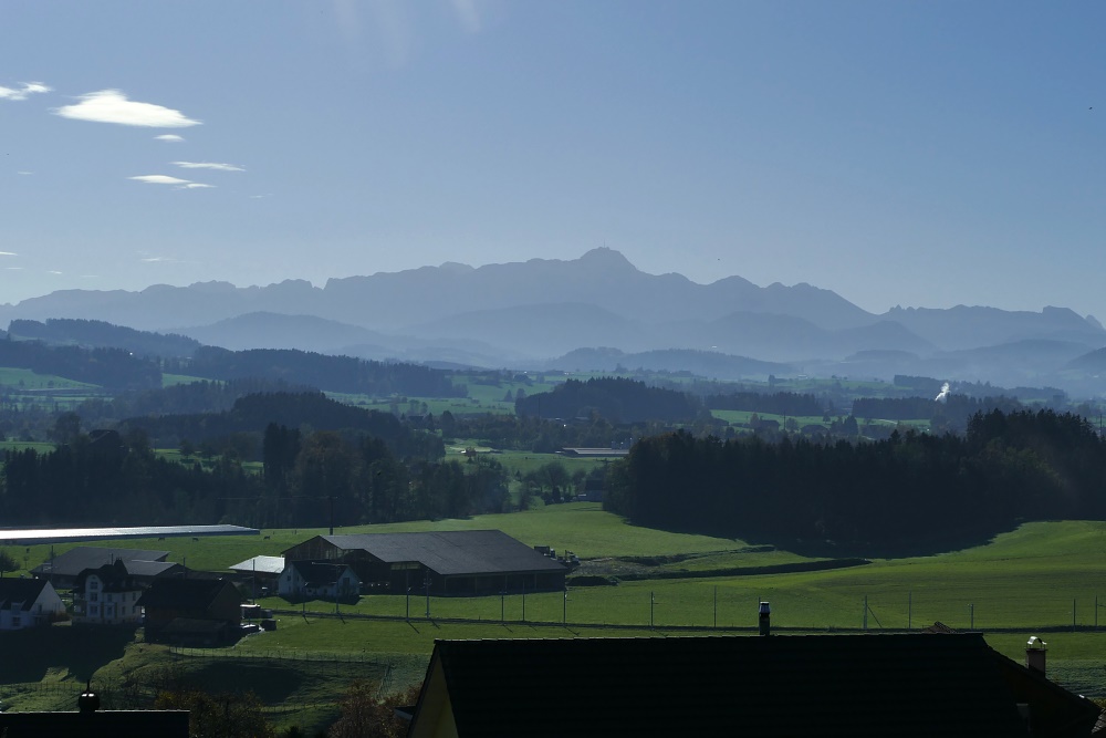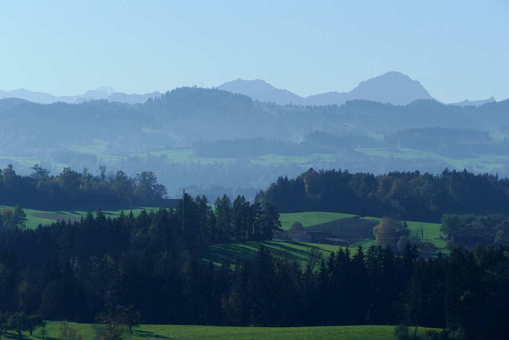 Bald biegt der Wanderweg nach Norden ab und in wenigen Minuten erreichen wir die vielbesuchte Waldschenke. Kein Wunder, denn hier bekommt man nicht nur ein gutes Vesper, sondern als Zugabe gleich noch die komplette Alpsteinkette serviert.