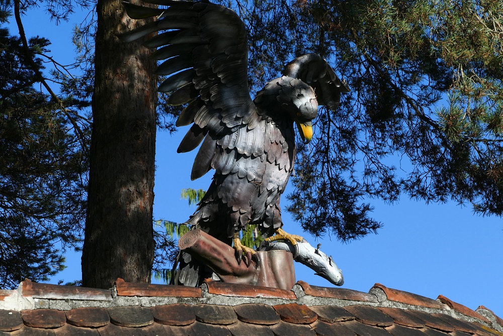der überdimensionale Greifvogel bewacht die wertvollen Grundstücke am Hang