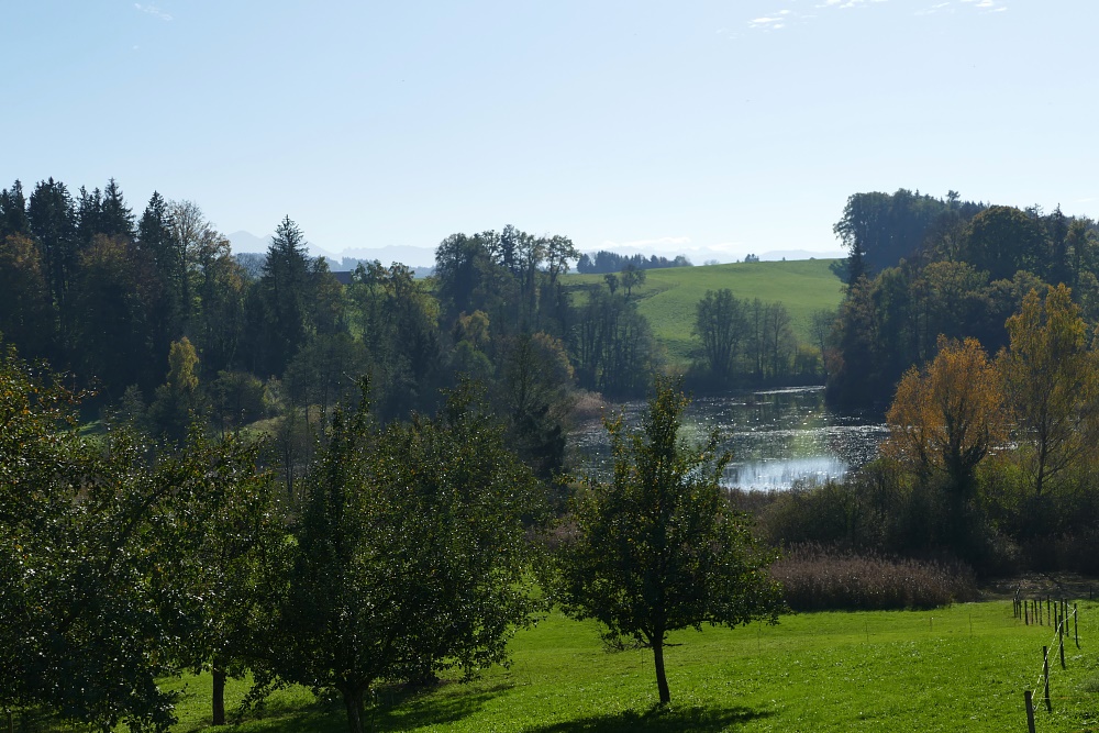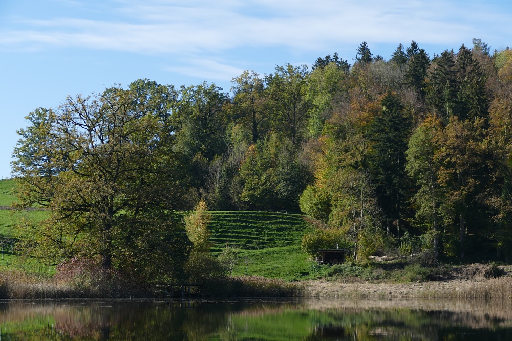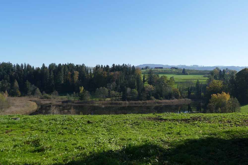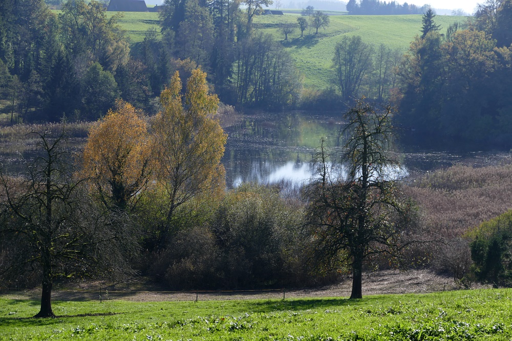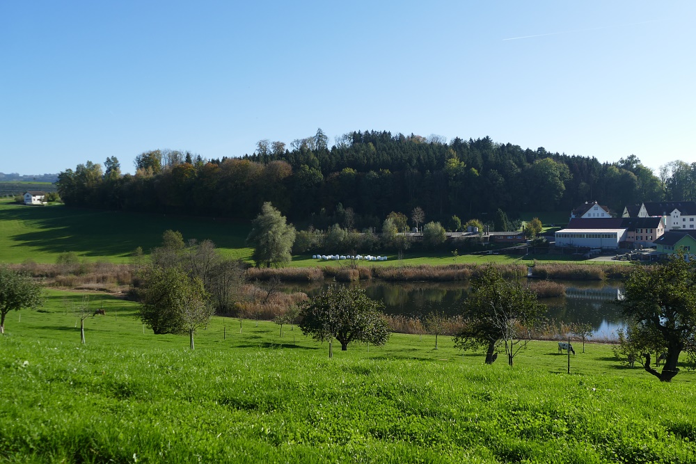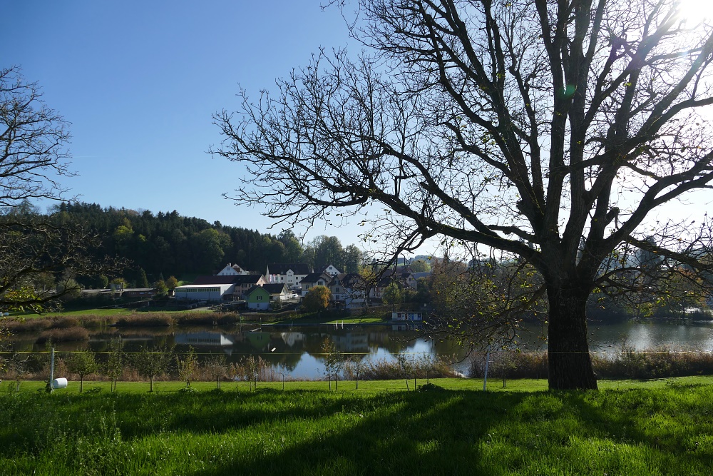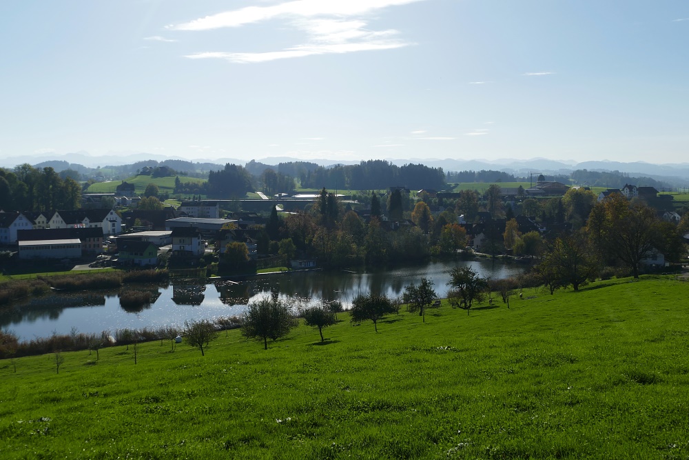Nachdem wir den Wald hinter uns gelassen haben, schließt sich die Runde und wir erblicken wieder Hauptwil, unseren Ausgangspunkt. Hier liegt auch der letzte der fünf Weier, der Hauptwiler Weier.